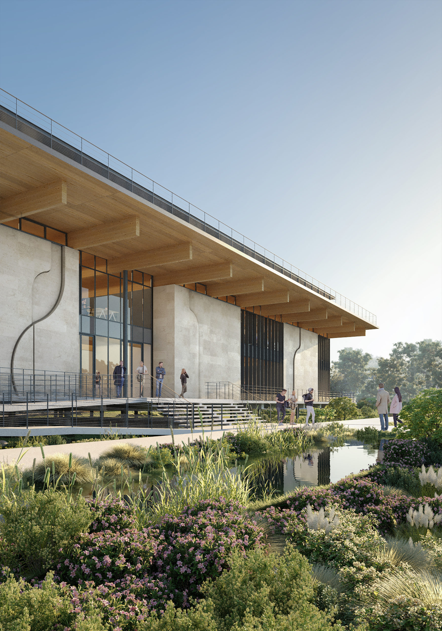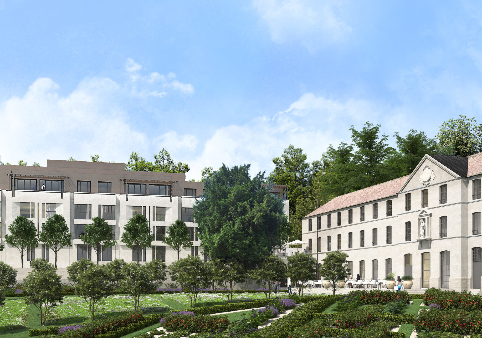 Pour répondre au programme hôtelier, un nouveau bâtiment a été conçu, s’intégrant parfaitement au bâtiment existant. Cette construction a été réalisée en amont du site, le long de la terrasse supérieure, et a été discrètement nichée derrière une rangée d’arbres nouvellement plantés. L’objectif était de trouver la proportion parfaite, en particulier pour la façade nord, qui offre une vue imprenable sur le parc environnant. Les façades du nouveau bâtiment présentent une écriture architecturale contemporaine tout en respectant les proportions de l’existant.