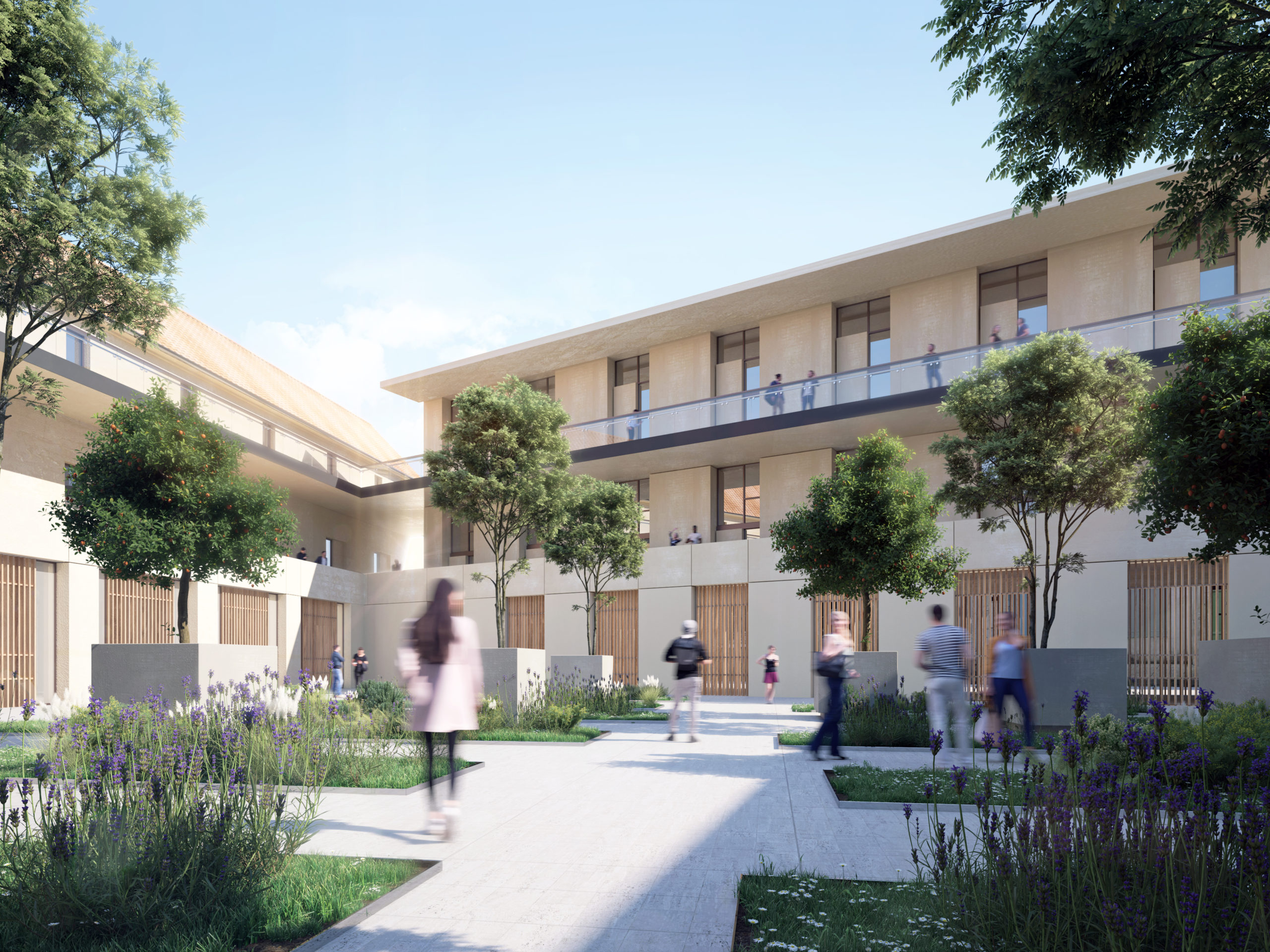 L’îlot formant l’ancien collège Frédéric Mistral est composé de corps de bâtiments patrimoniaux remarquables ainsi que de bâtiments plus récents ajoutés successivement. Le projet conserve et met en valeur les bâtiments patrimoniaux autour de l’ancienne église : les bâtiments construits ne s’accolent pas à ceux existants en ménageant un vide servant de passages pour les visiteurs, les occupants, les piétons. A l’image des ruelles du centre-ville, pour se protéger du soleil.