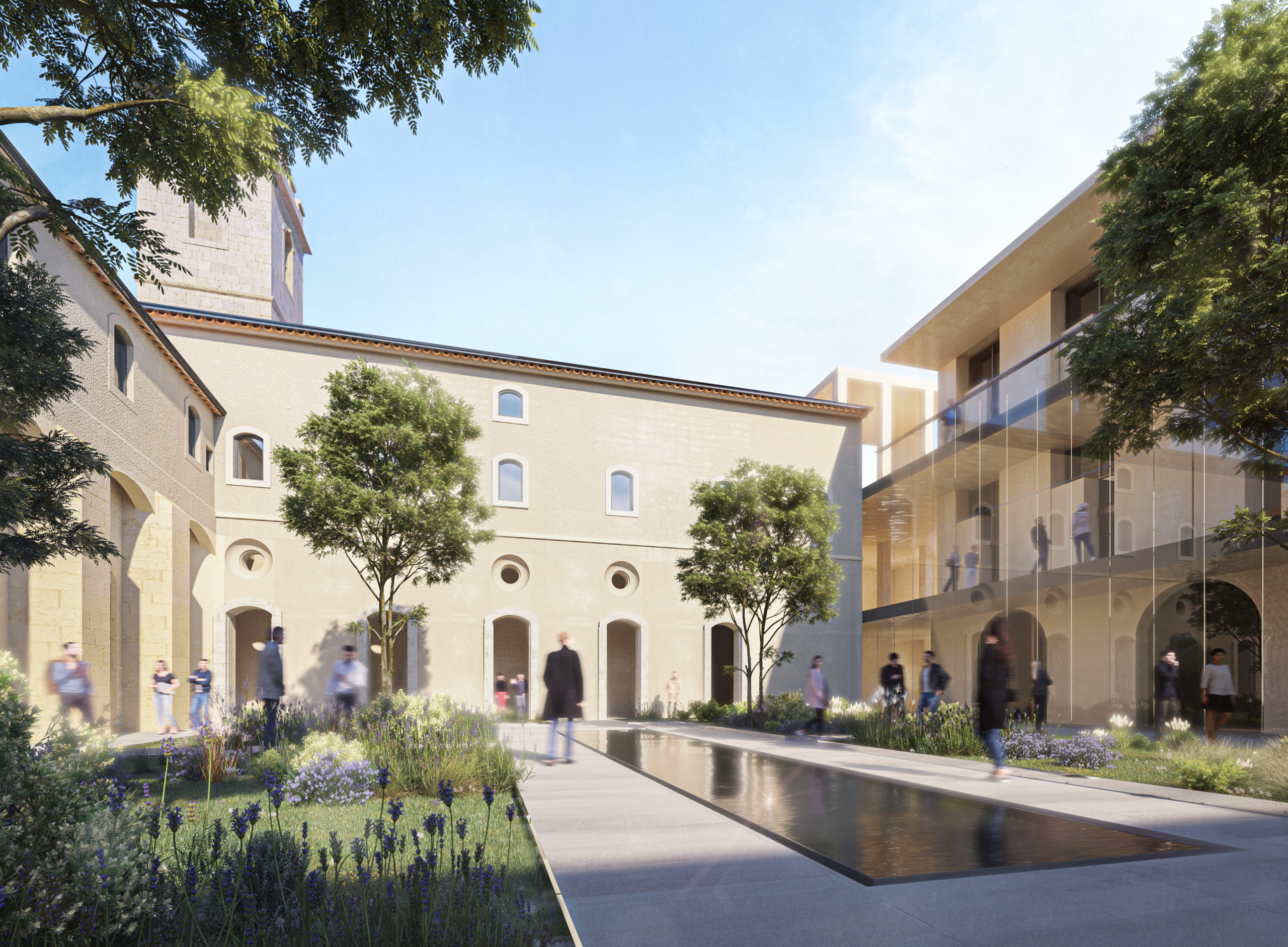 La partie contemporaine centrale entre les cours s’articule autour d’un mur rideau en verre implanté en équerre dans la cour nord : Il referme ainsi la cour du cloitre en lui restituant sa proportion carrée en plan. En façade il reflète sur le bâtiment contemporain à l’arrière les arcades et modénatures des bâtiments anciens qui lui font face.