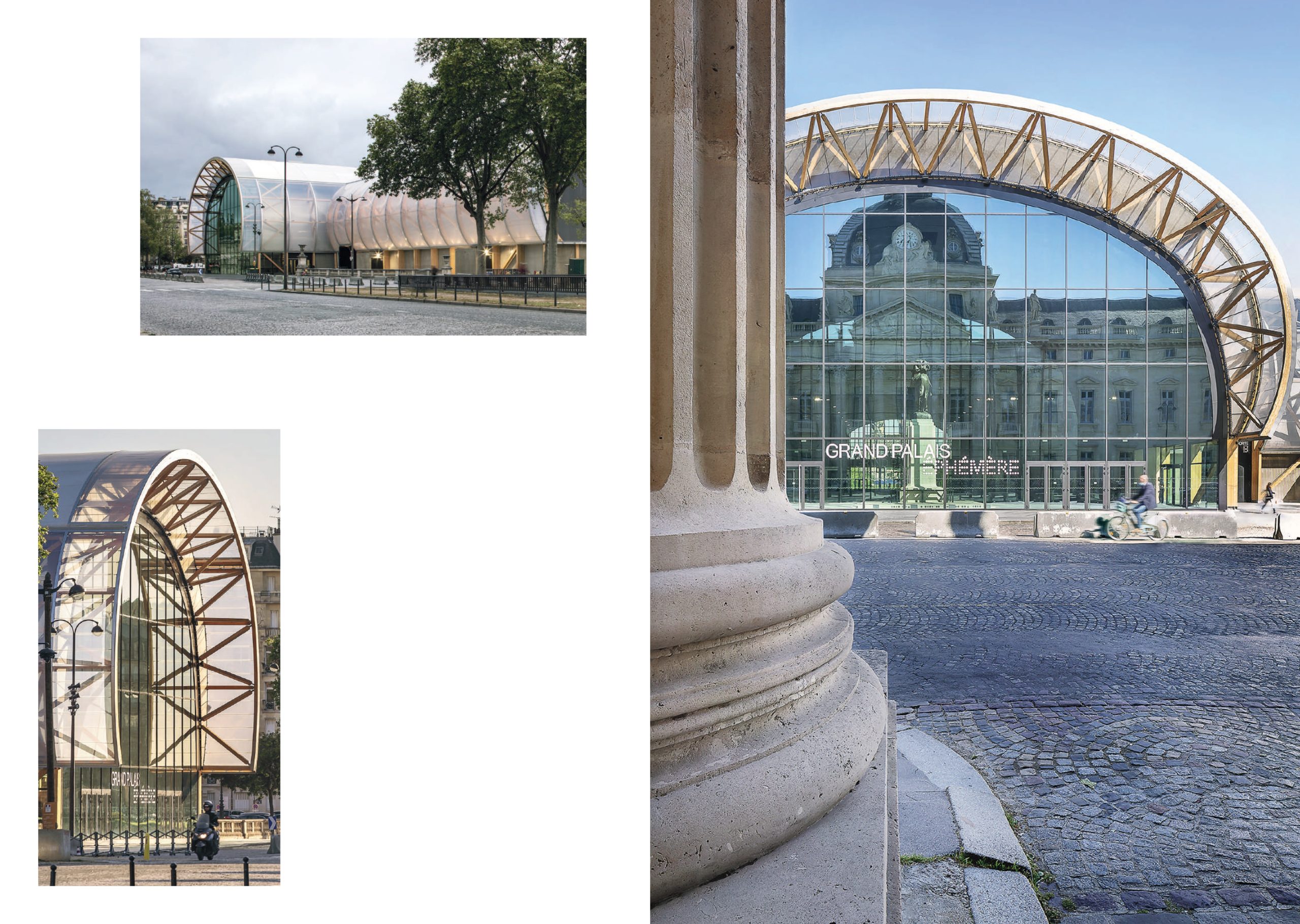 "Dessiné par l’agence Wilmotte & Associés Architectes, le Grand Palais Ephémère est un bâtiment temporaire, modulable et réutilisable de 10 000 m², implanté sur le Champ-de Mars à Paris. Conçu pour palier à la fermeture du Grand Palais le temps de sa réhabilitation, il accueille depuis mai 2021 les grands évènements culturels et sportifs habituellement organisés sous la nef du bâtiment historique, et accueillera également les épreuves de judo et de lutte pendant les JO 2024.