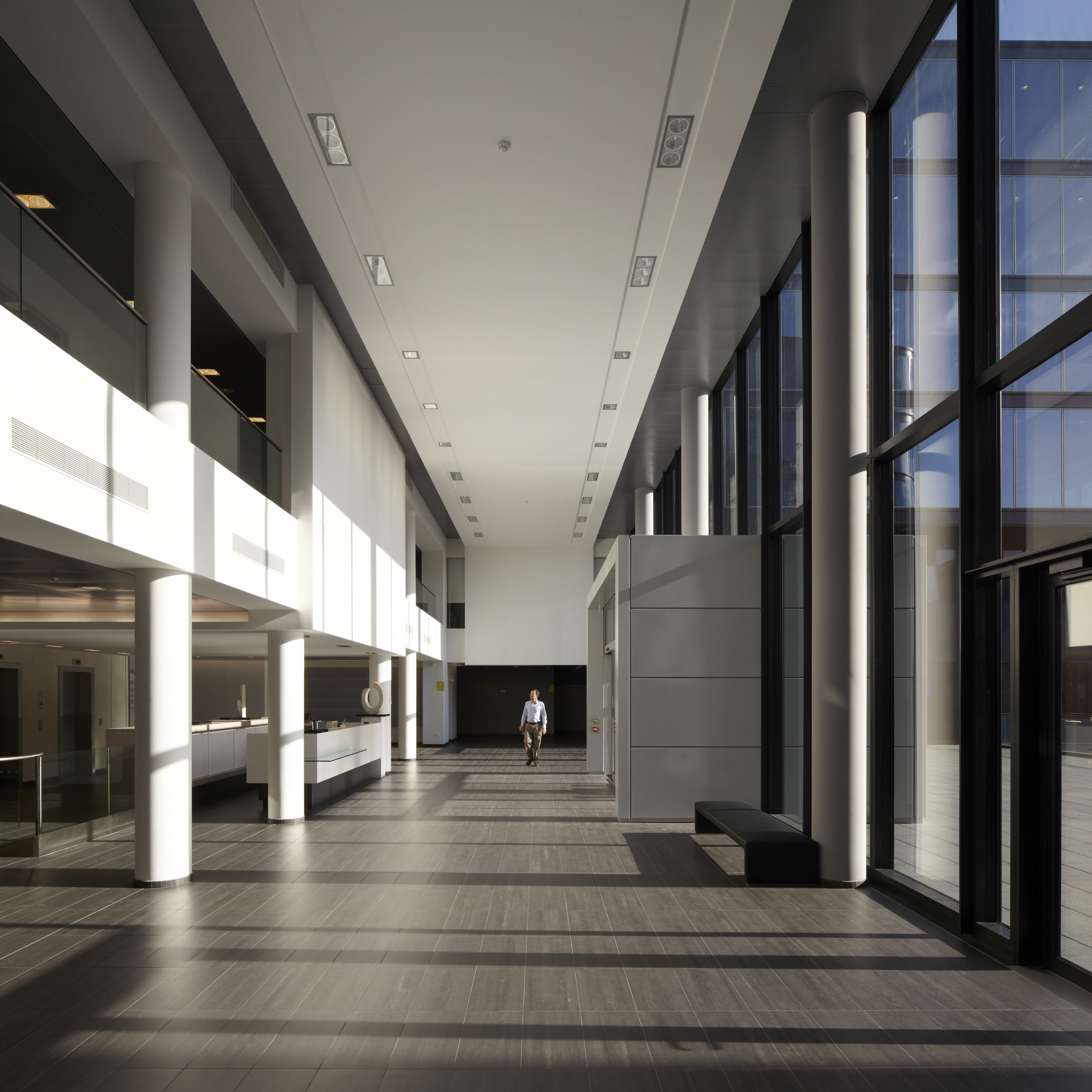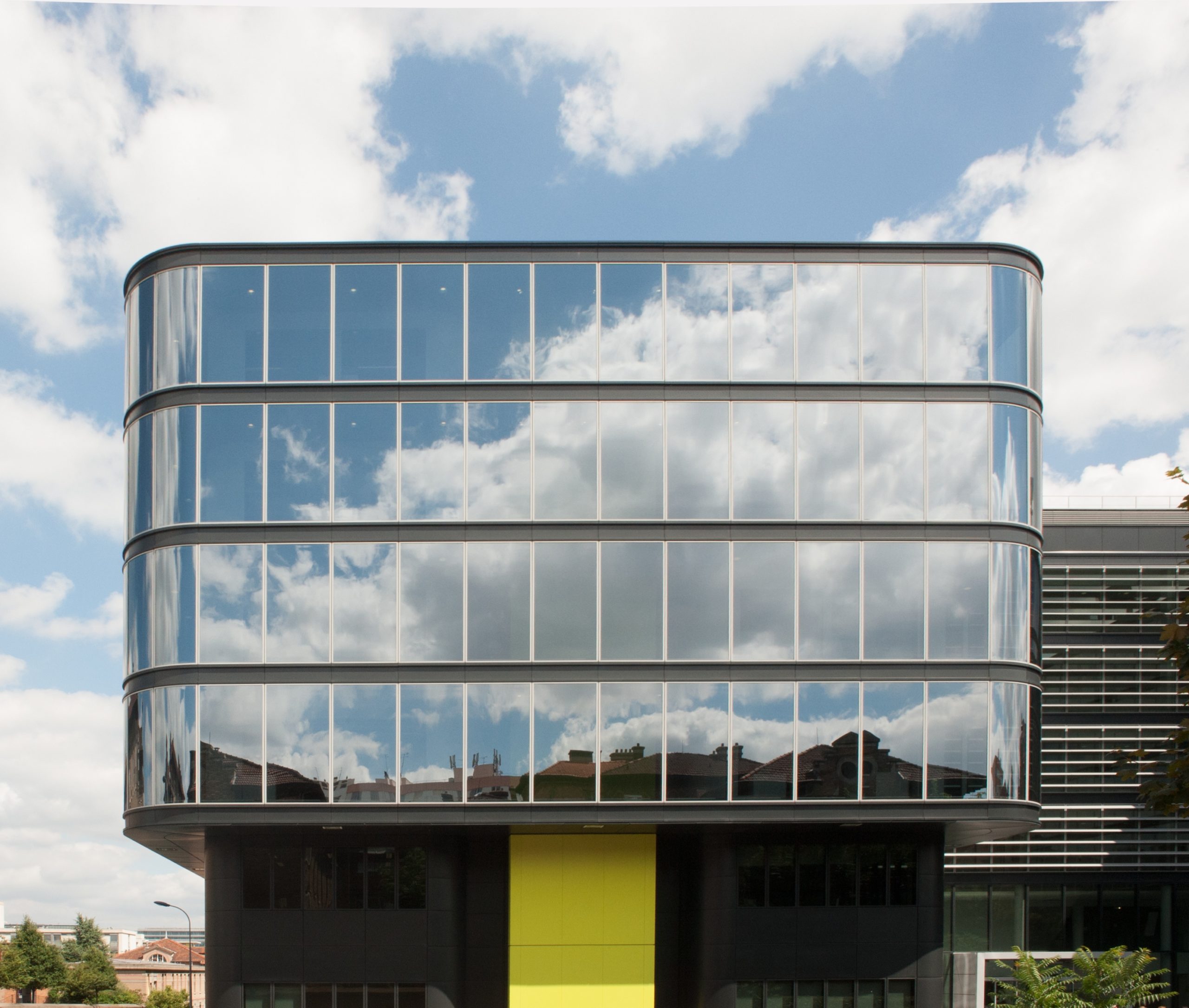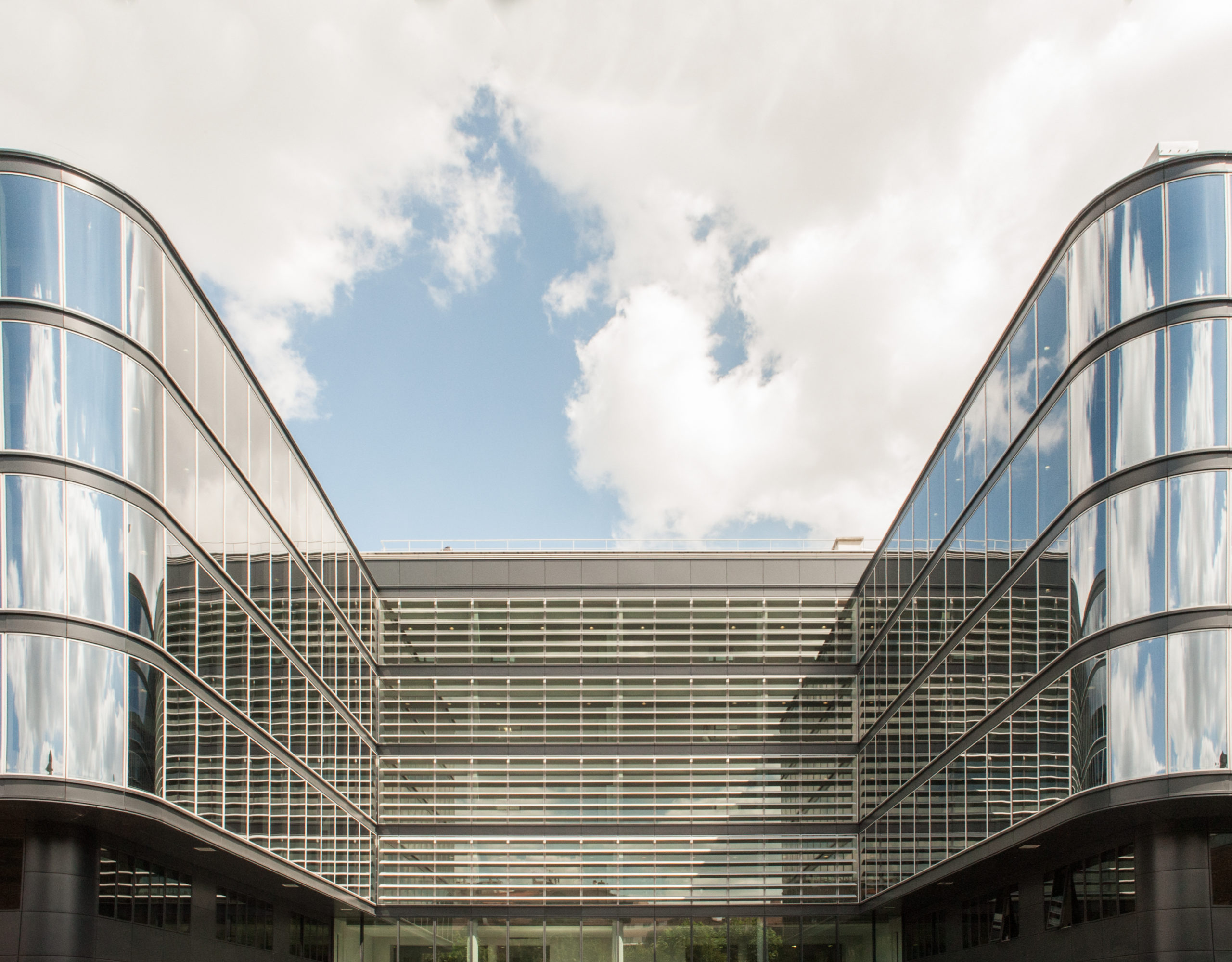 The programme includes laboratories, patient areas, a human imaging area, meeting spaces and a business incubator. A concrete post-and-beam structure provides flexibility to the building. The largely glazed facades provide natural lighting. The first two levels are made up of a curtain wall of clear tinted glass. The four levels of modular laboratories are clad with a façade of glazed elements. The facades of the central building are made of a classic curtain wall.