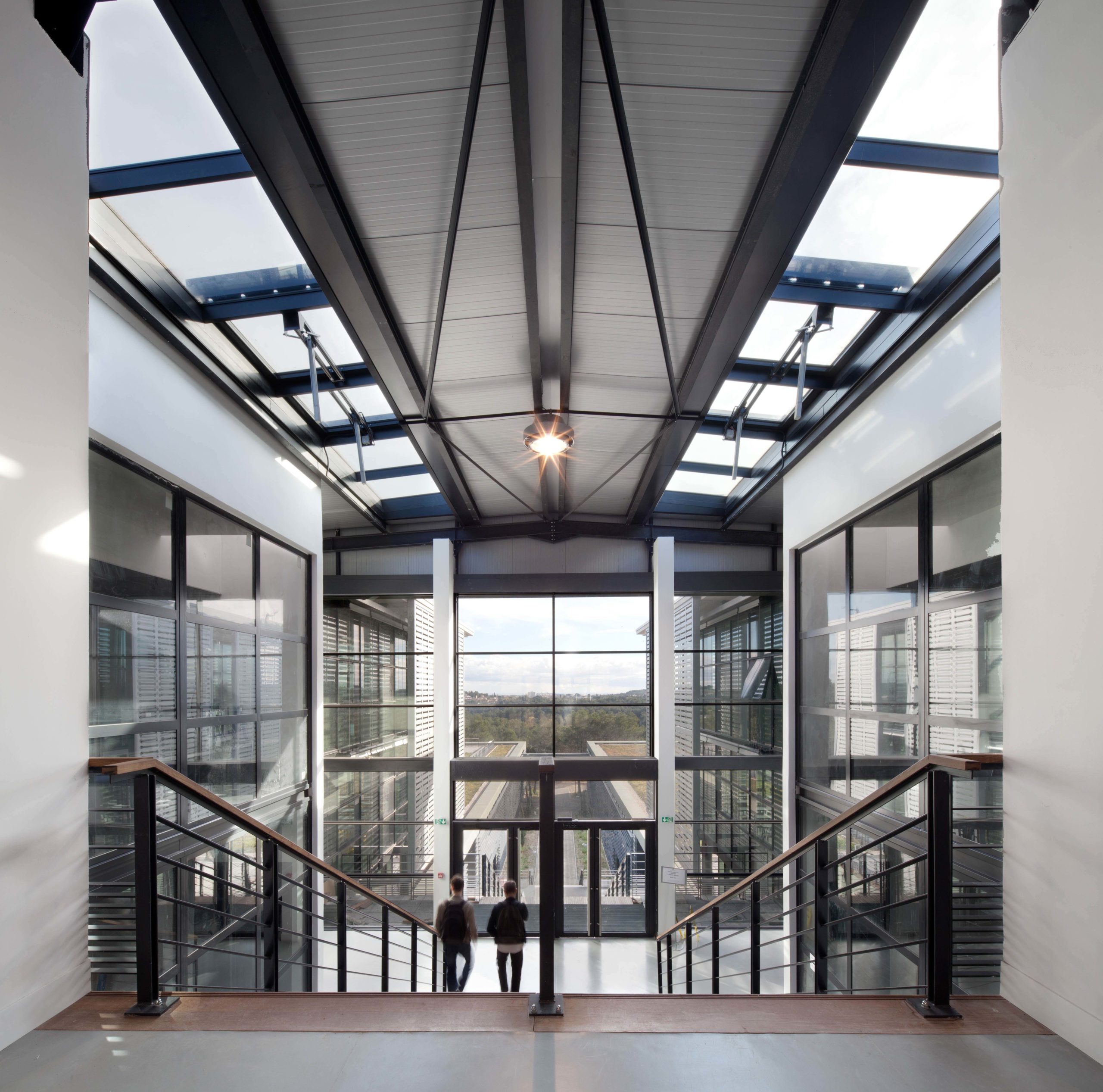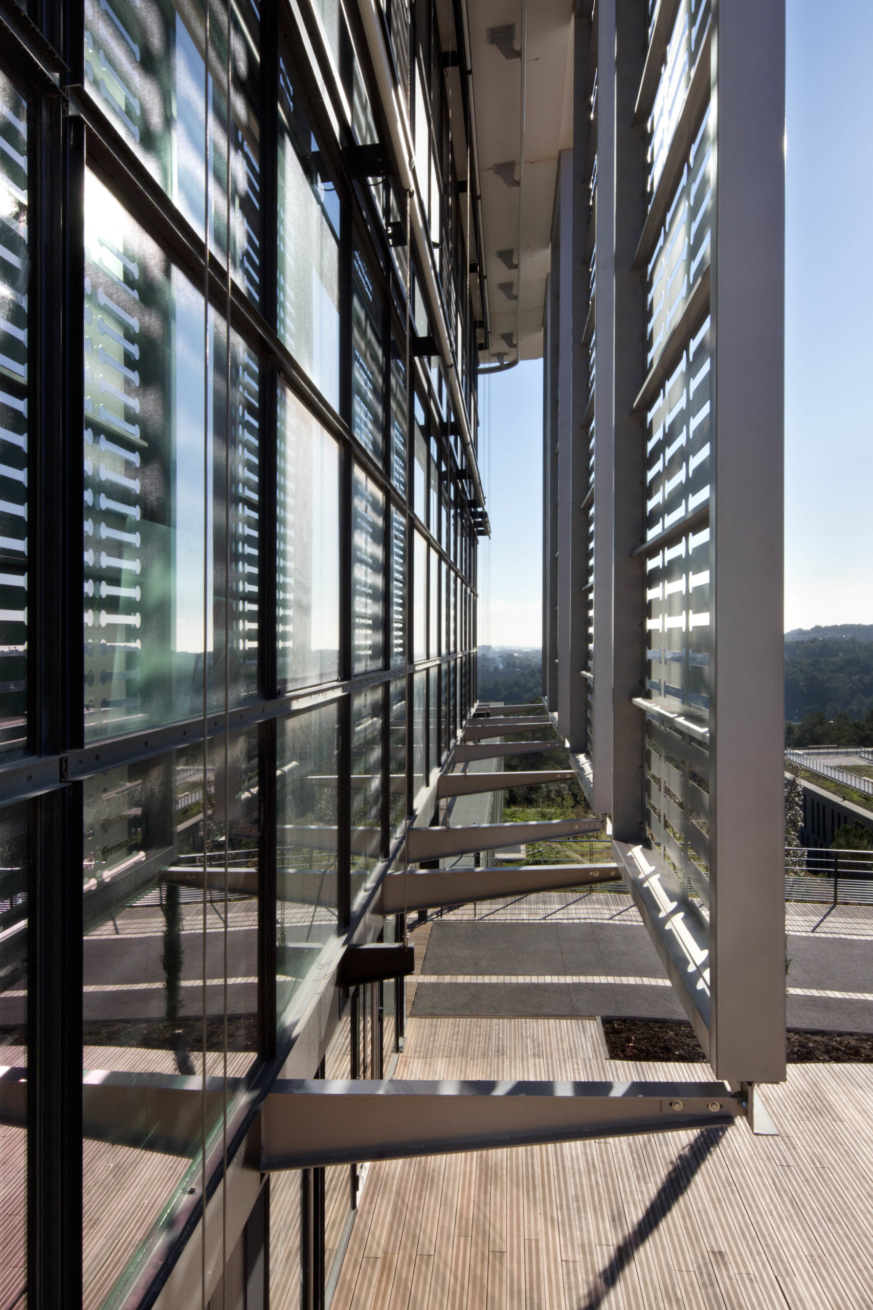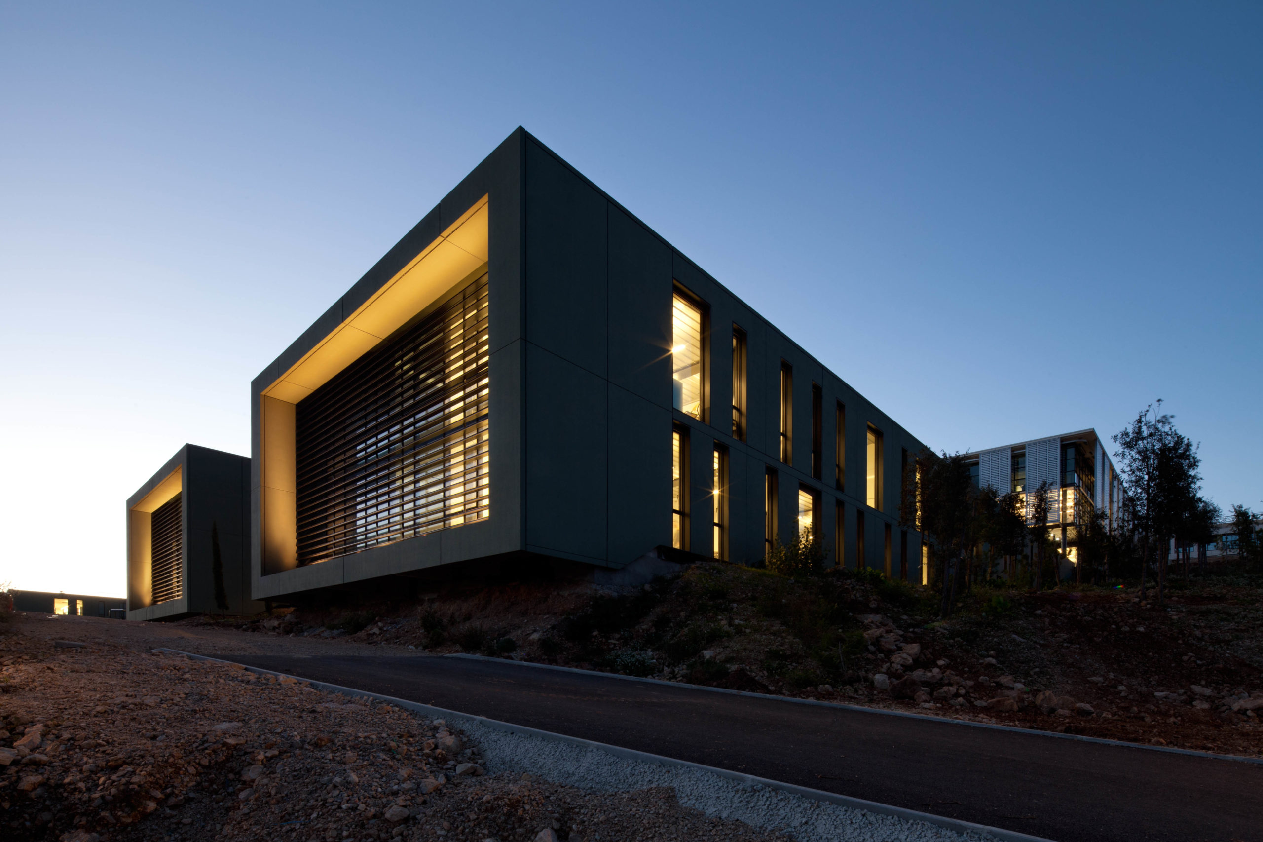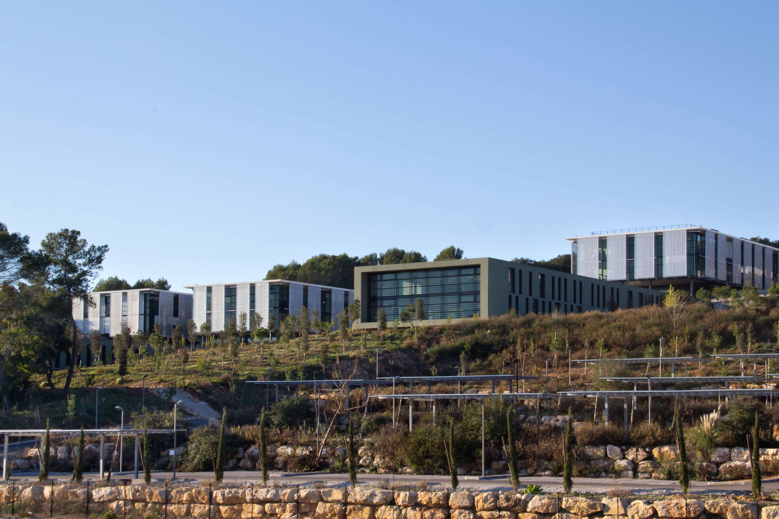 The campus includes the Ecole Polytechnique Universitaire, the premises of the EURECOM Institute as well as common reception and research premises (reception area, laboratories, 350-seat amphitheatre, cafeteria and association premises), a library and a sports centre. In order to respect the heavily wooded area of the southern slope, the buildings are located in a system perpendicular to the contour lines and originating in the already built-up part of the site.