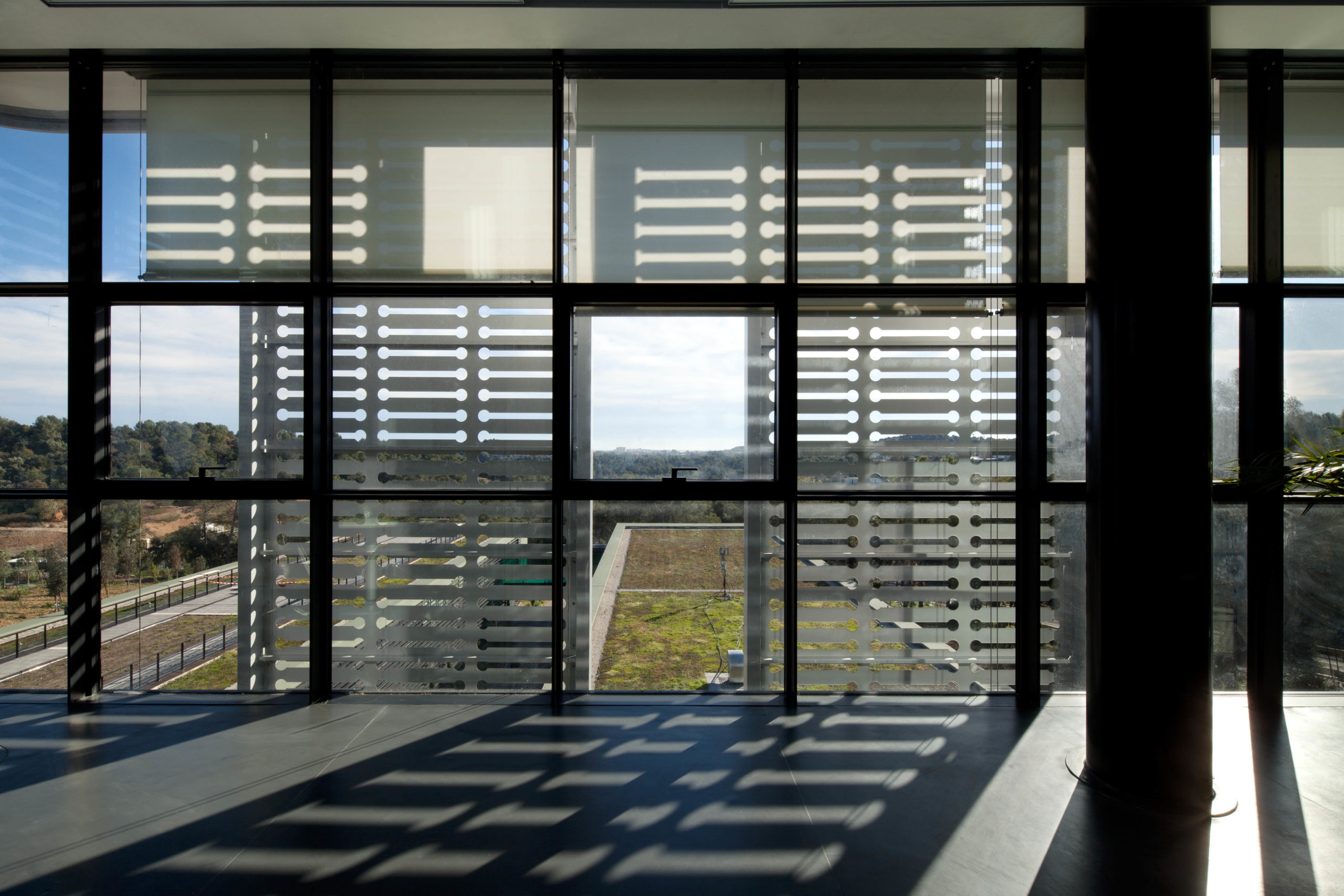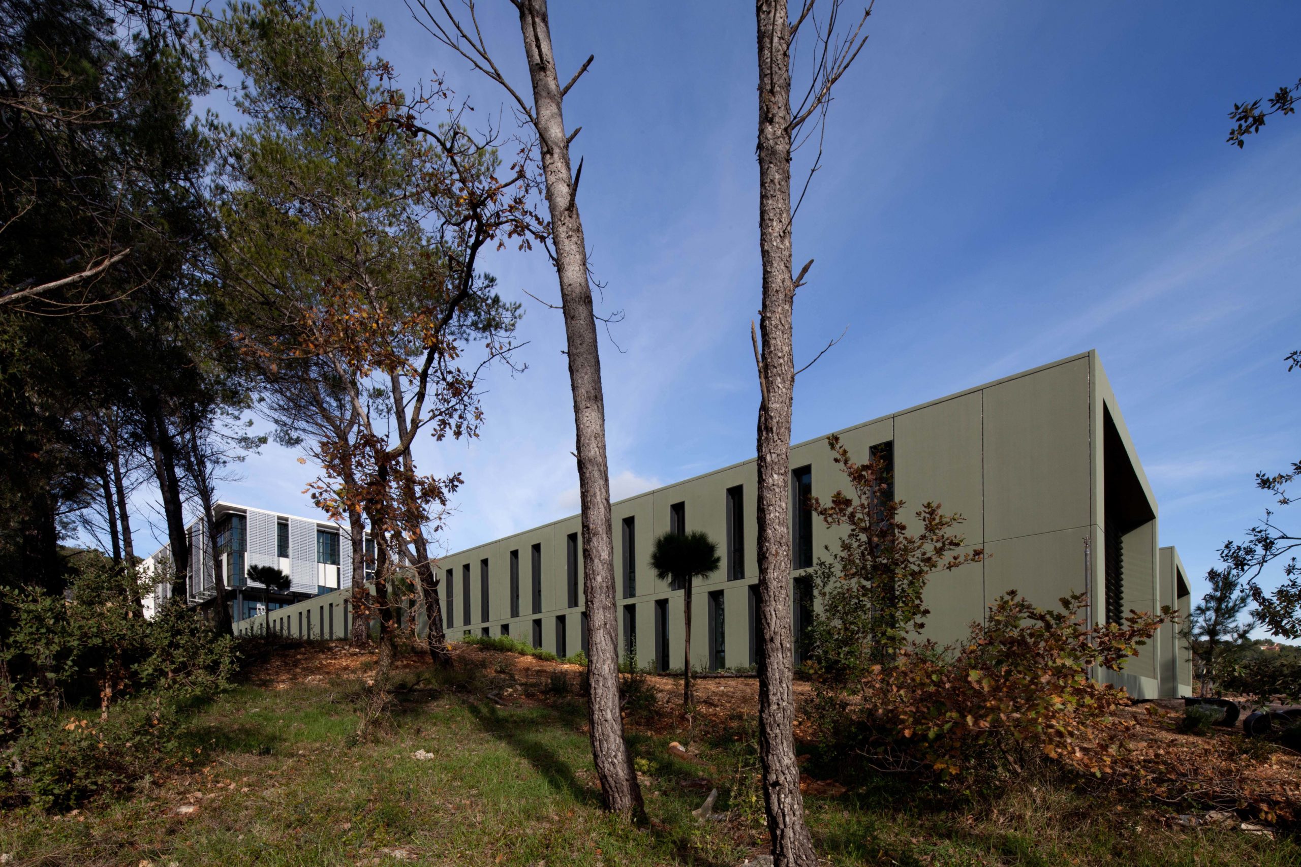 From the main access, a succession of refined volumes rise up to allow the eye to pass through and to preserve the continuity of the vegetation; the high bars receive a glass envelope while the low bars clad in green slate become anchoring elements in the landscape, blending into the holm oaks.