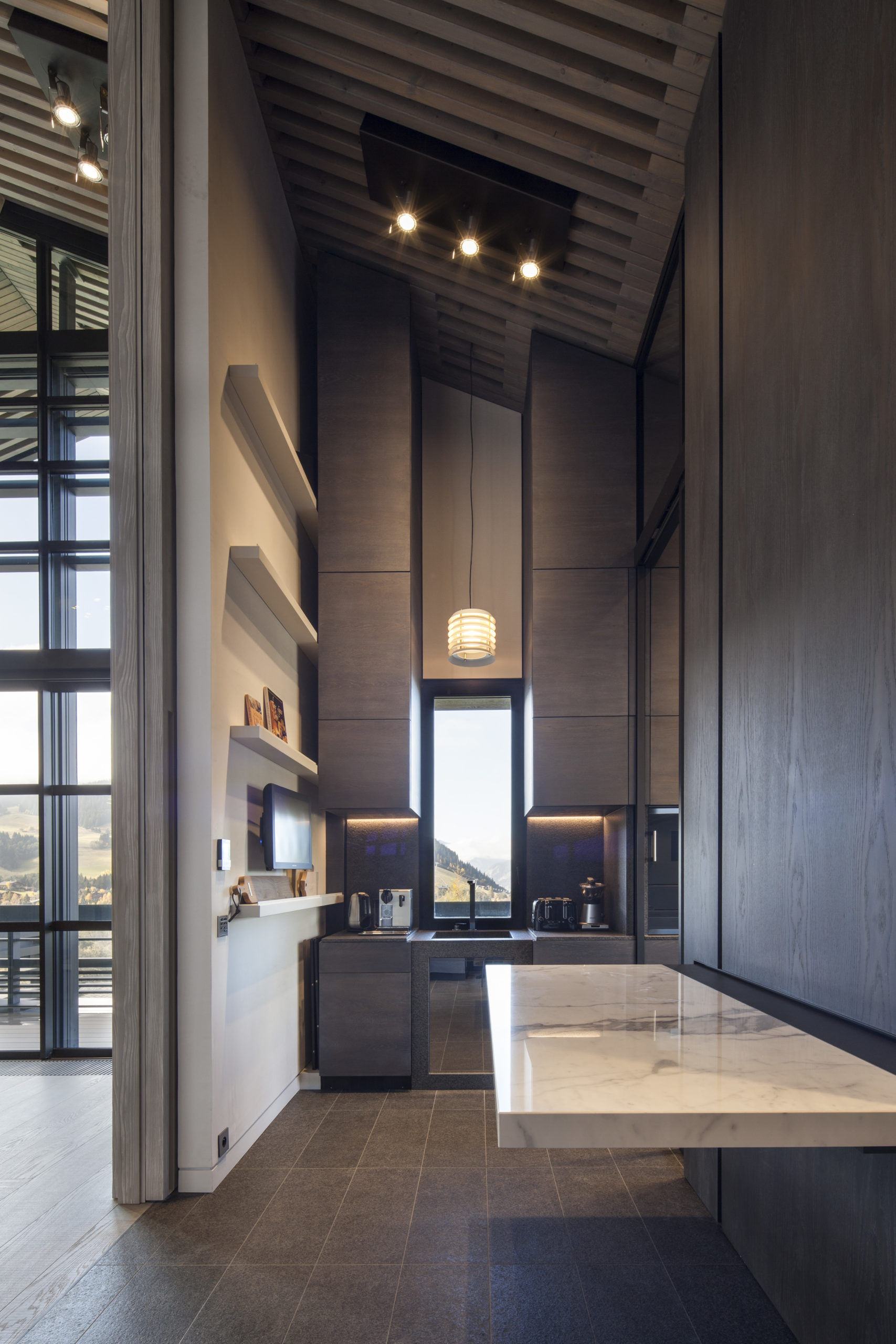 For this project, the agency carried out extensive research into panelling finishes, which refer to the architectural lexicon of the mountains while being contemporary.