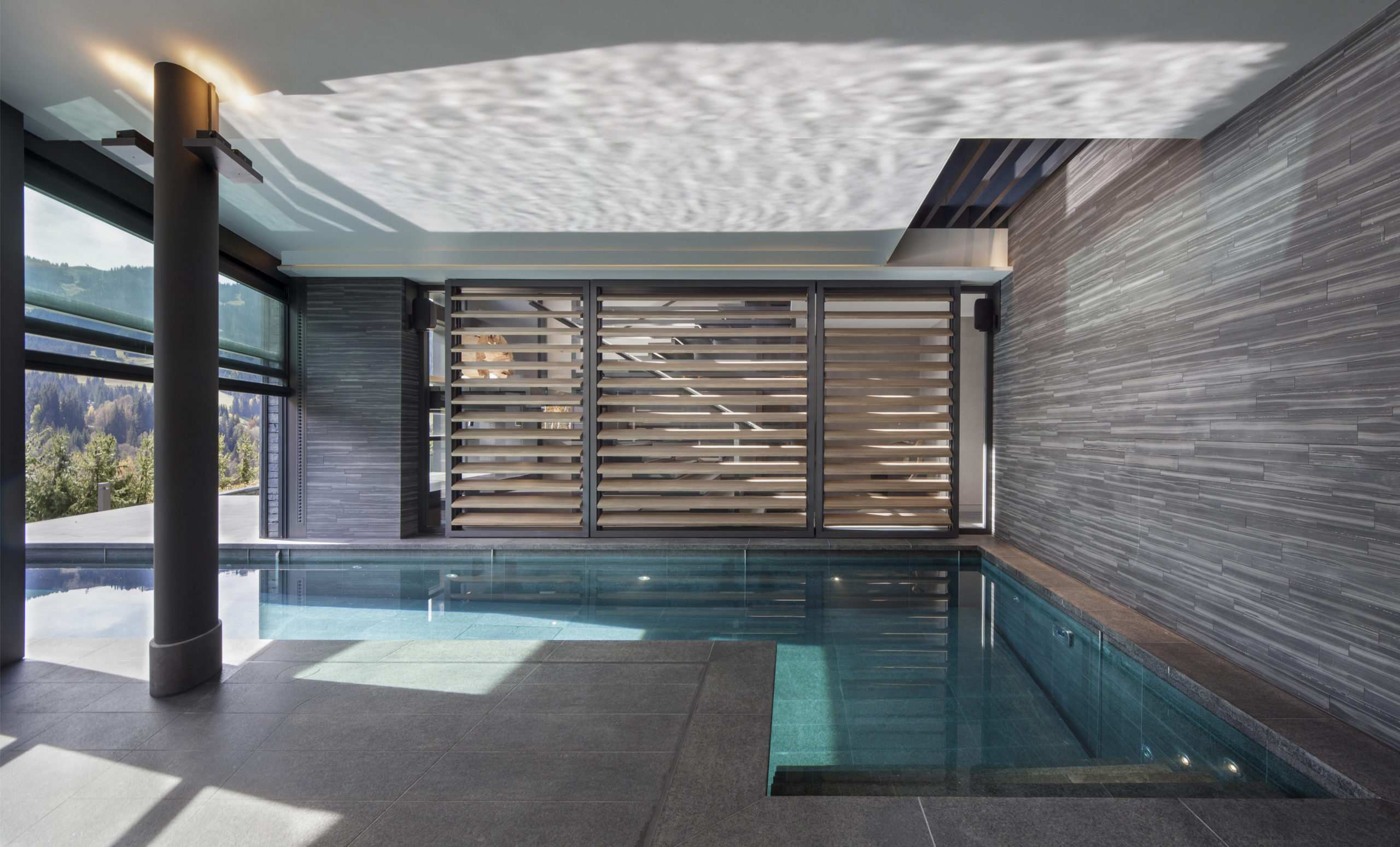 The interior design is in line with the architectural continuity of the exterior. The spa is clad, for the floors and walls, with stones similar in appearance to those of the slate base. The horizontal rhythm of the large pergola, to the west, finds its continuity in the wall pattern of the panelling in the room adjoining this exterior element. Thus, the interior/exterior interplay is permanent. On the upper floor, this continuity is ensured by the large full-height openings allowing the underside of the eaves to enter these high volumes.