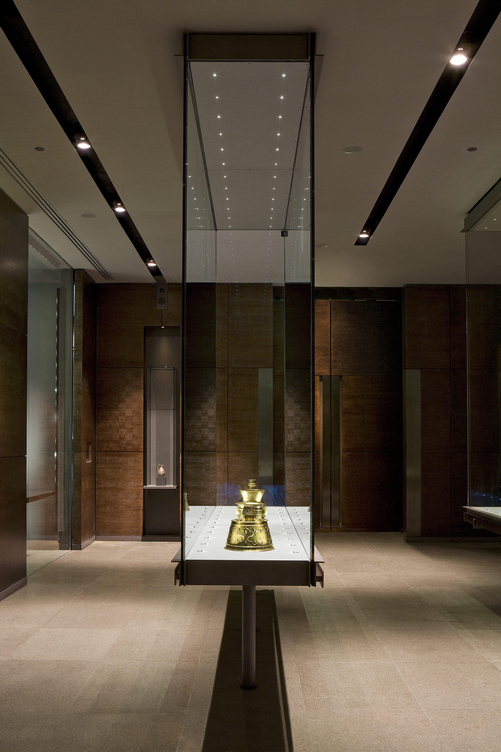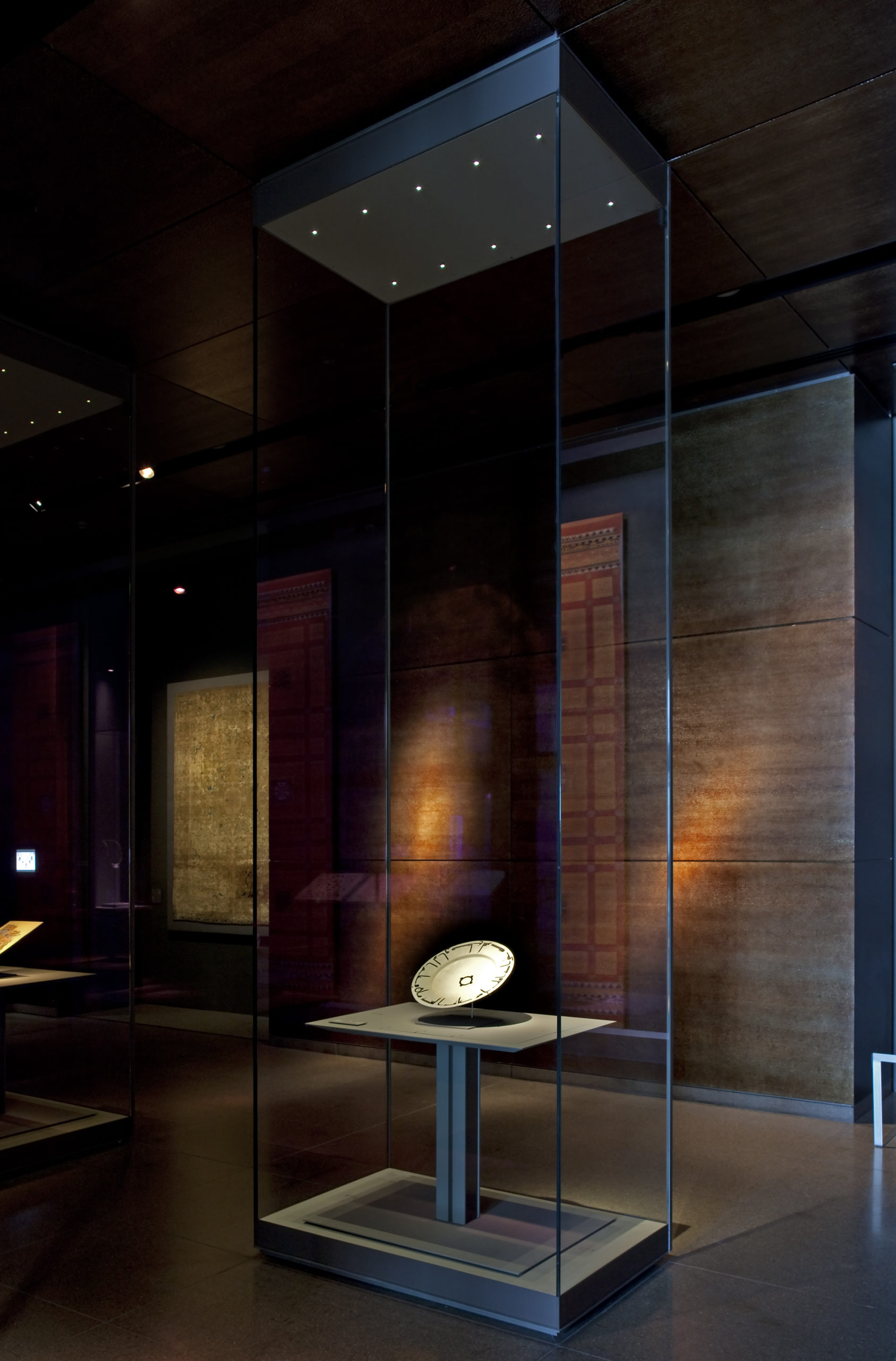 The objects are displayed in showcases designed especially for the museum, placed on the floor, nestled in the walls or arranged on large tables. Taking up the museography used in the Louvre, each oversized showcase, made of extra-white, non-reflecting glass with a highly finished metal structure, houses very few objects illuminated by the ceiling. This transparency gives the visitor the impression of admiring objects levitating in space.