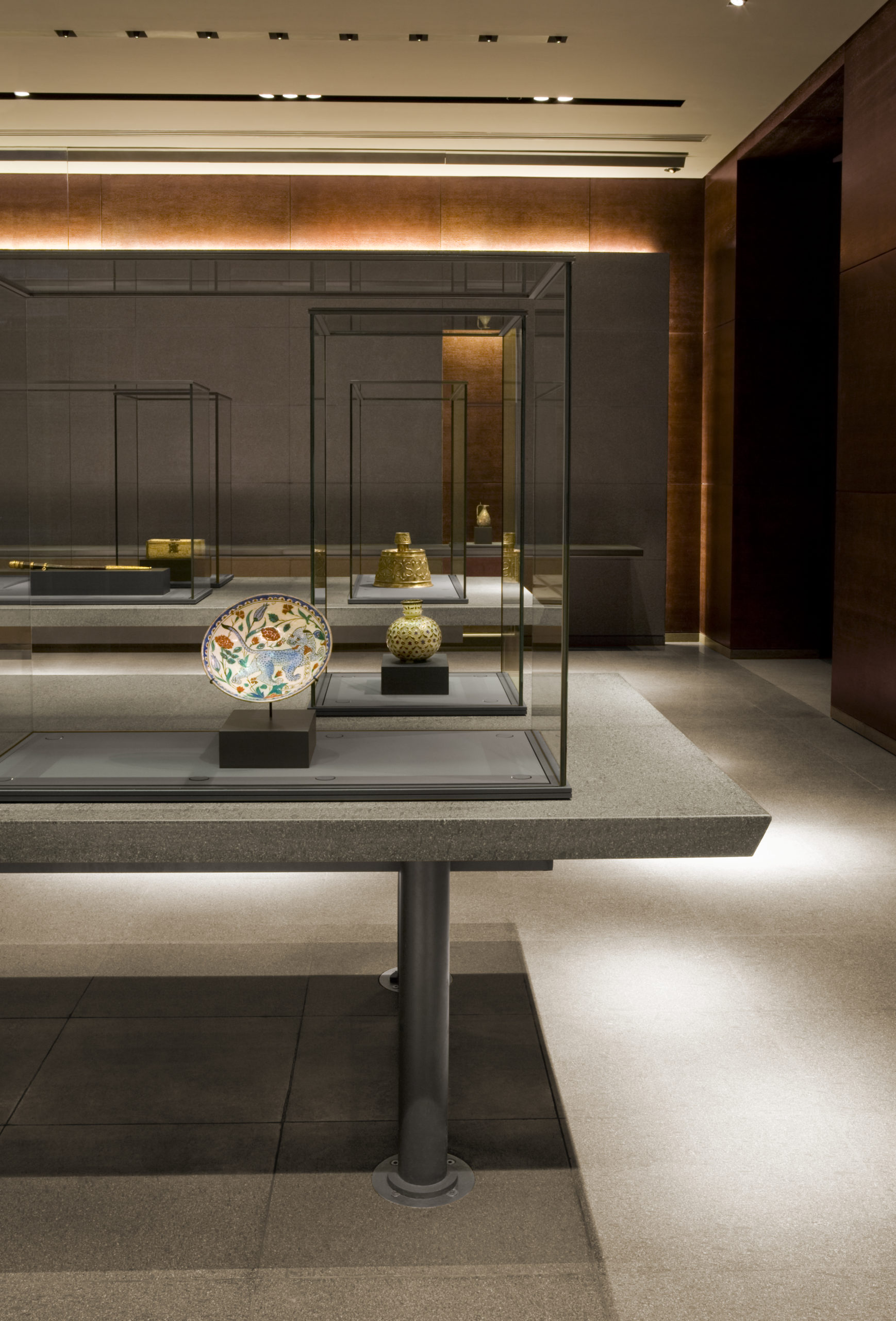 Of the 45,000 sqm space, 5,250 sqm are reserved for permanent exhibitions and 700 sqm for temporary exhibitions. Having already worked together on the Louvre, the architect Ieoh Ming Pei once again called on Jean-Michel Wilmotte for the museum’s interior design. The emphasis was placed on the flexibility of the installation, which can evolve as new acquisitions or changes in presentation are made. Together with the curators, the architects defined a museographic itinerary presenting the key works of Islamic civilisation on the first level and various objects classified by geographical area on the second.