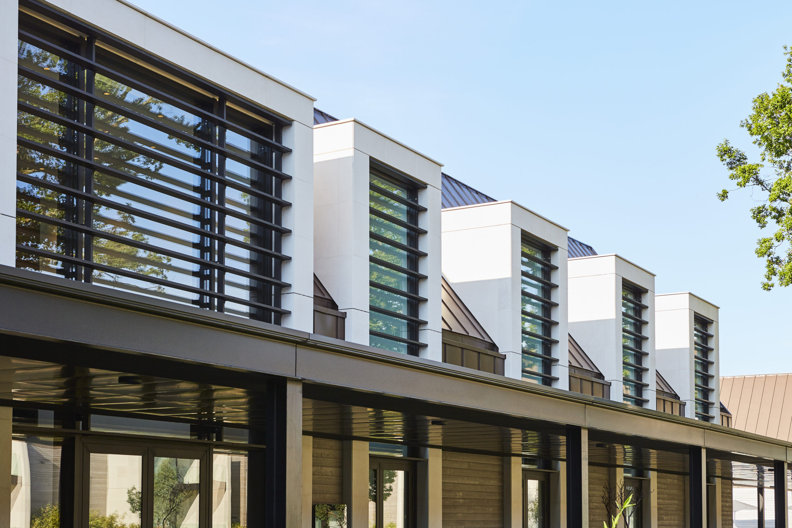 Like juxtaposed farmhouses, the buildings respond to each other by staggered alignments of largely glazed gables. This volumetry is reminiscent of the traditional farm buildings developed around imposing interior courtyards. The two-sloped roofs are the result of a search for harmony in the proportions of the gables and the slopes. They take up the proportions of the neighbouring building but with a more contemporary treatment.