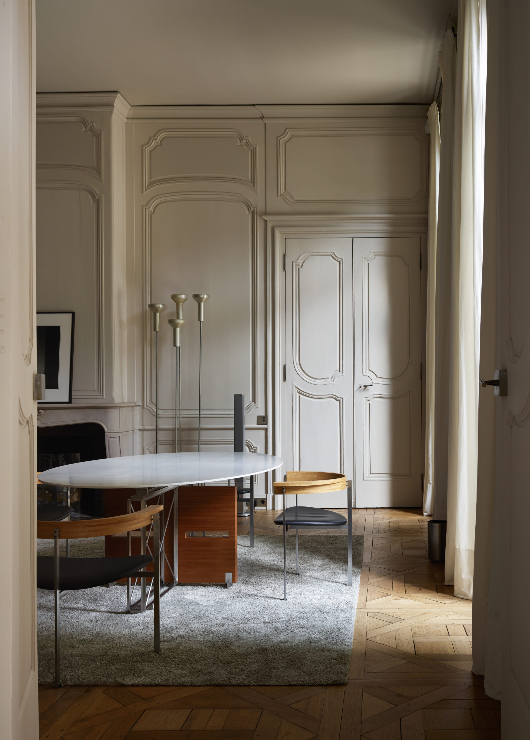 The oval table has been designed with a brushed stainless steel base and a matt varnished brushed walnut panel. The top is made of white fibreglass with a satin resin finish.