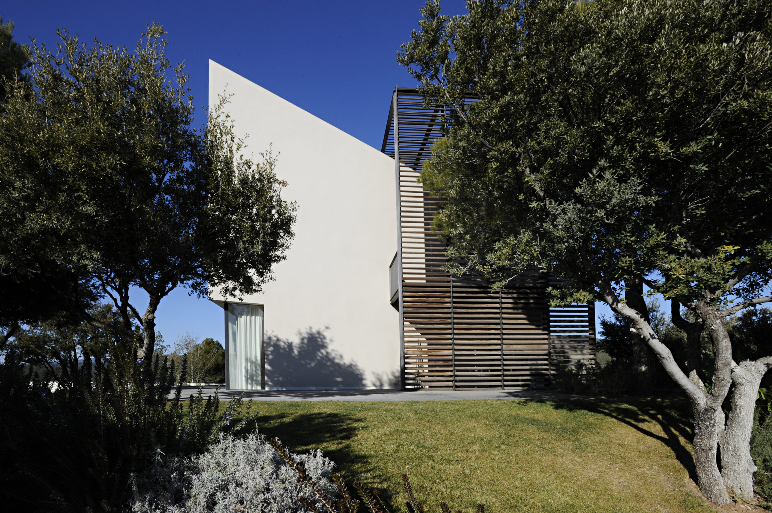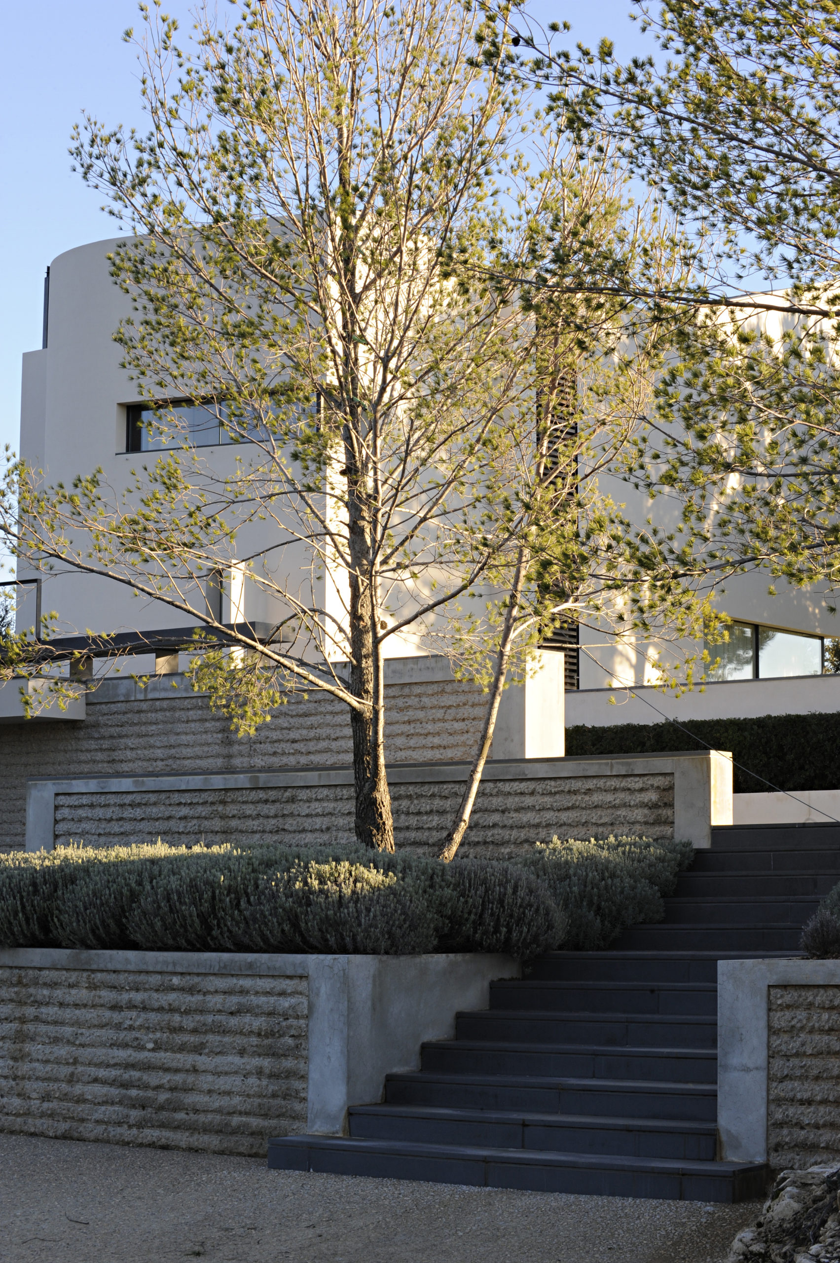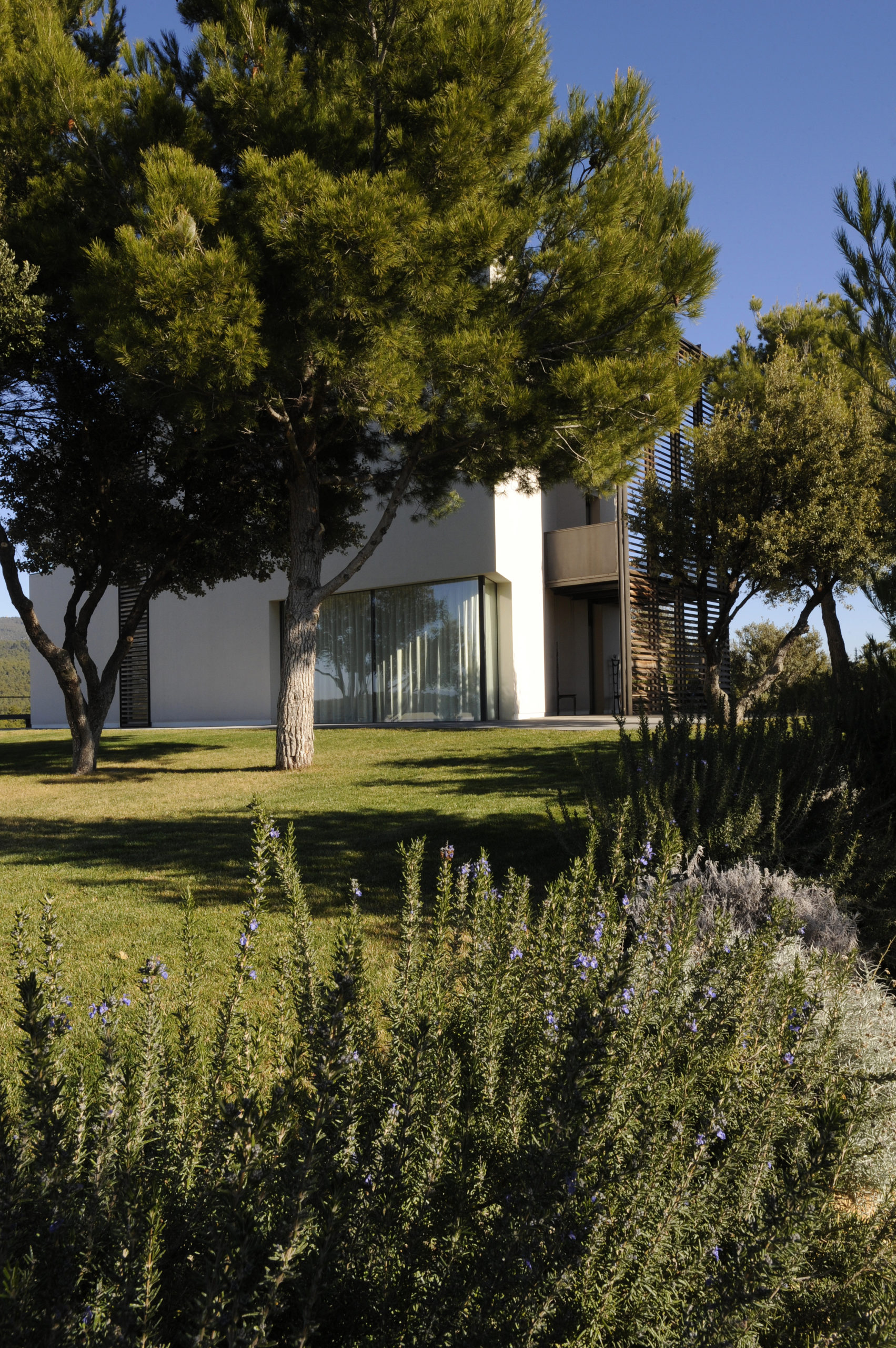 The facades are treated with a natural lime rendering, with a very fine grain, in a light colour. Two walls of the extension are also treated with lime rendering to affirm the architectural continuity between the house and its extension. The boundaries of the plot are left natural.