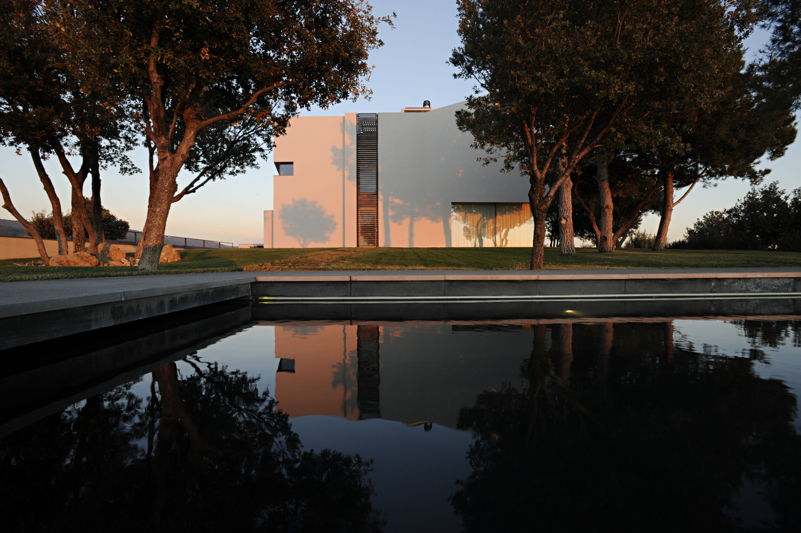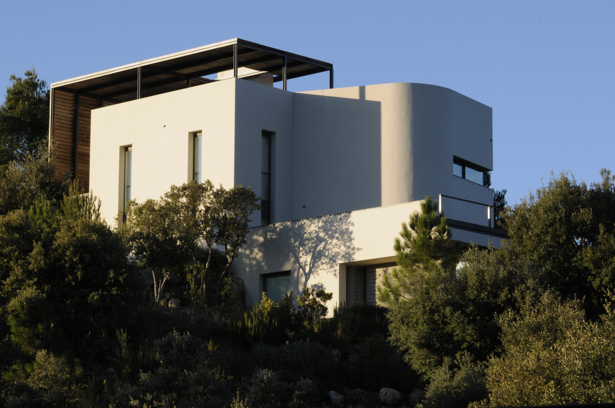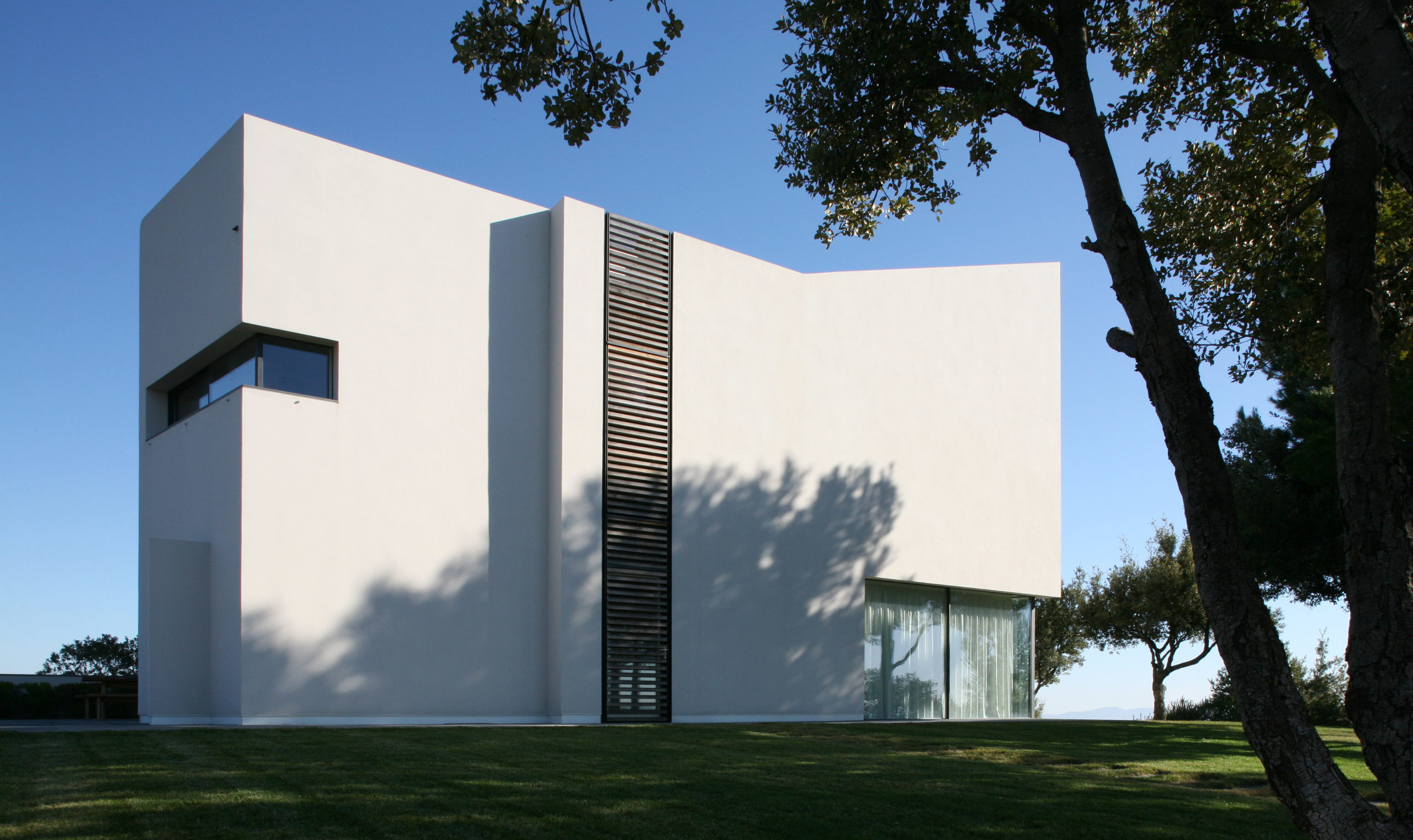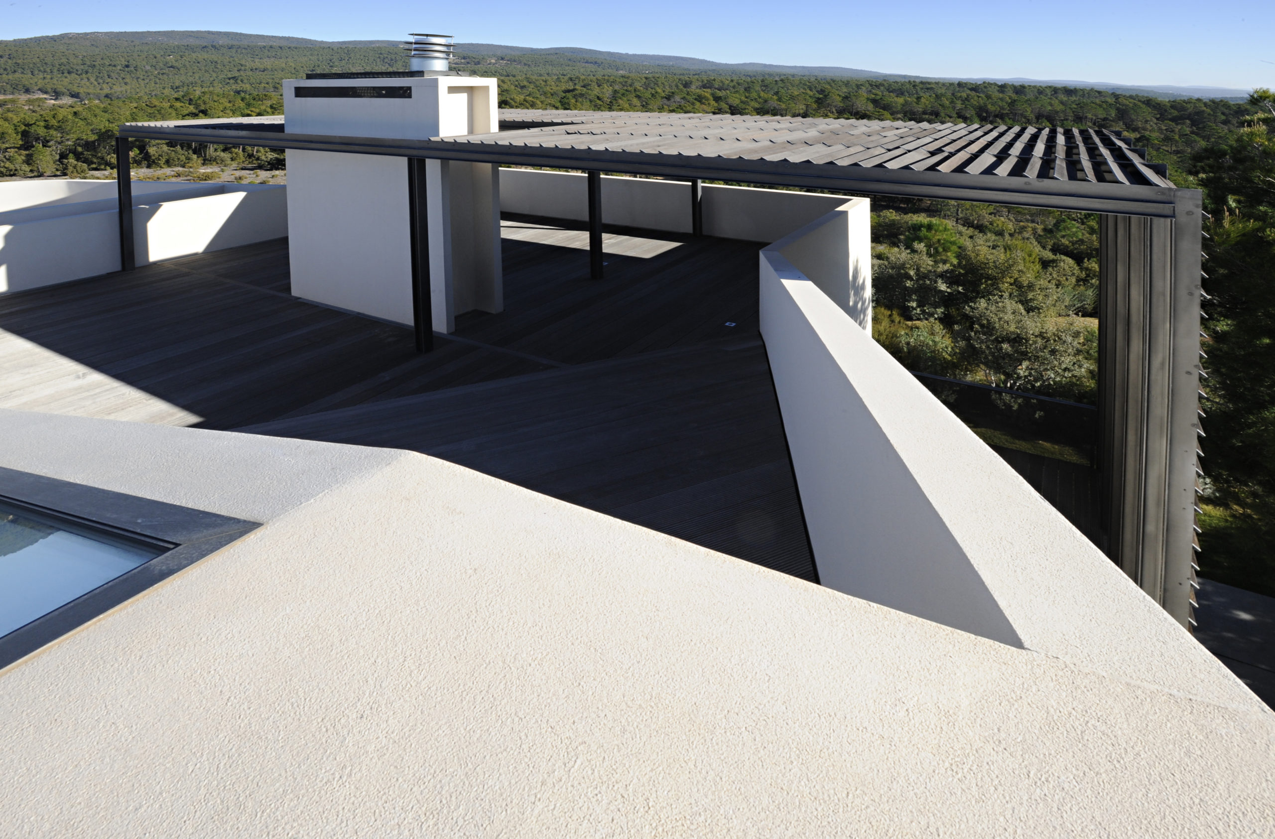 The facades are treated with a natural lime rendering, with a very fine grain, in a light colour. Two walls of the extension are also treated with lime rendering to affirm the architectural continuity between the house and its extension. The boundaries of the plot are left natural.