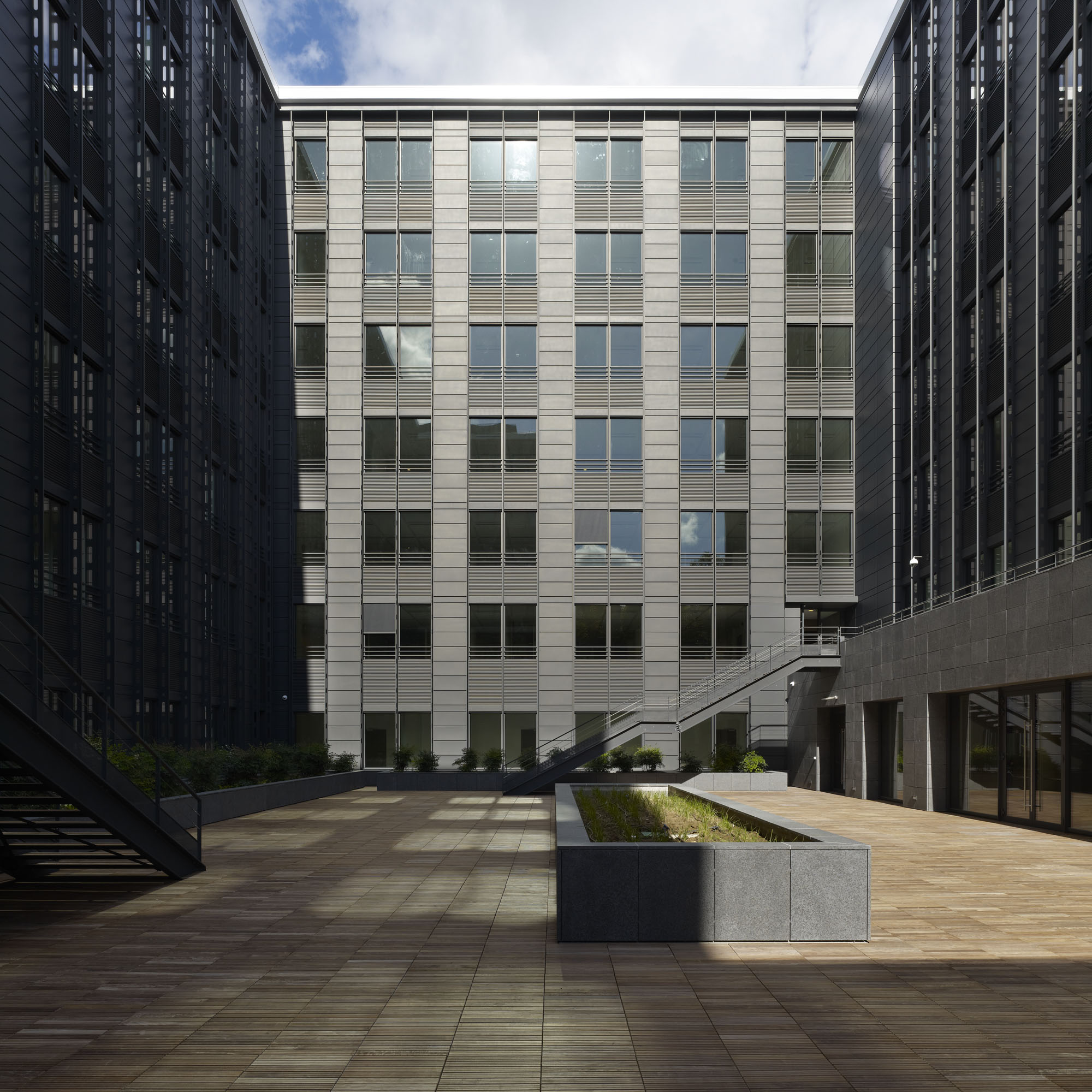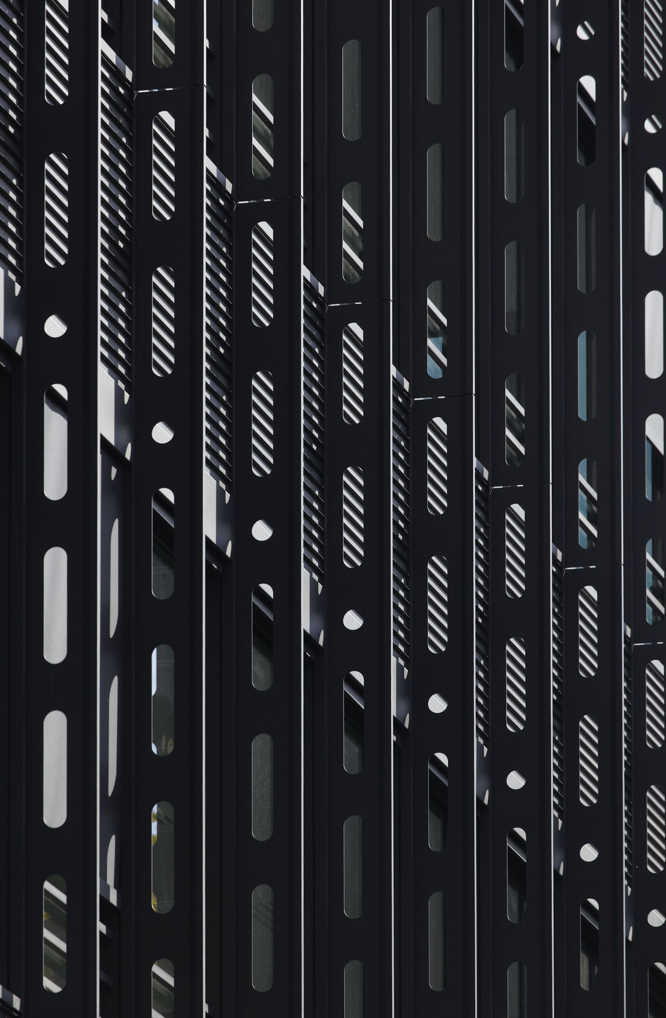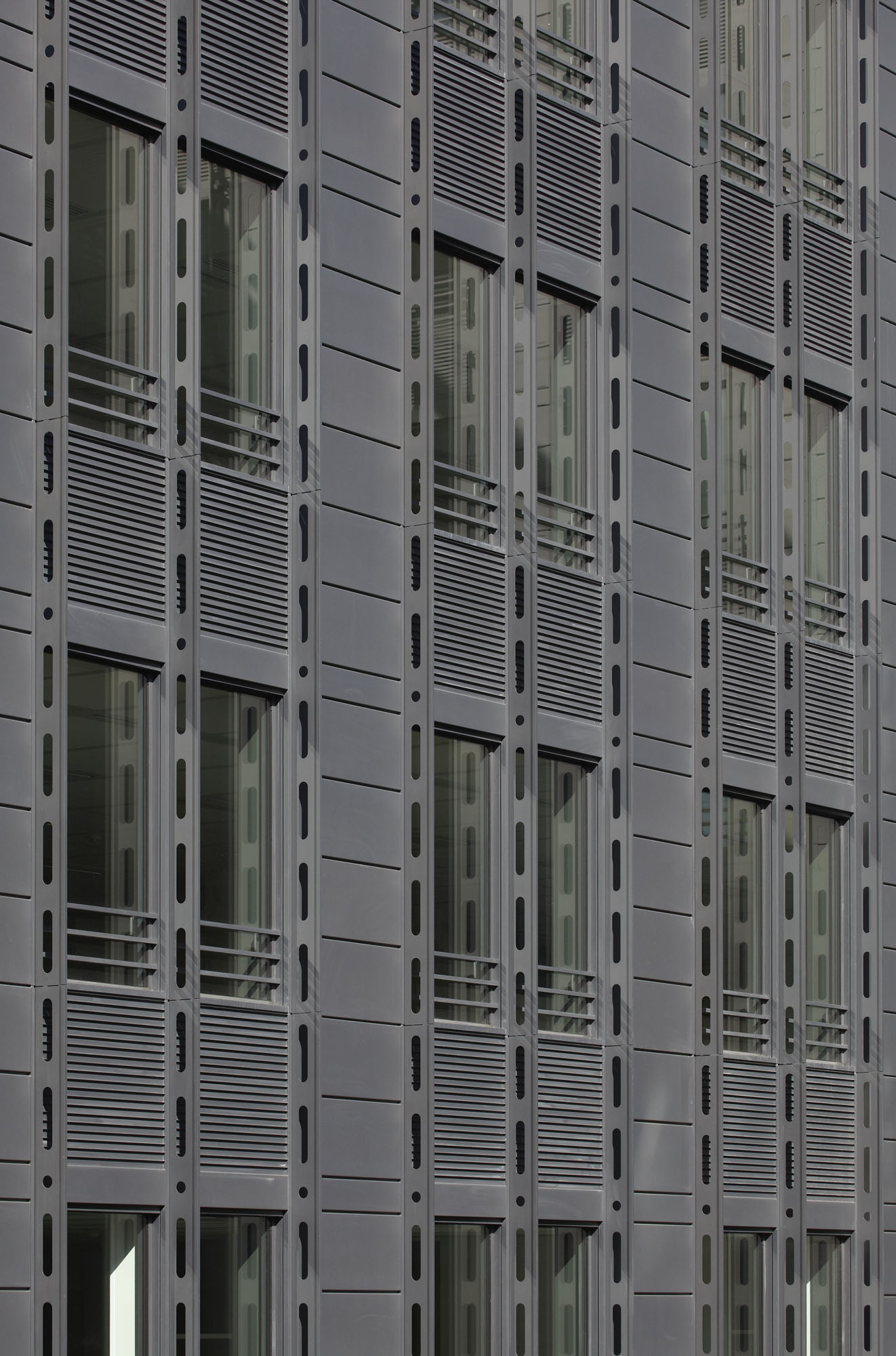 Lumen matches the height of existing buildings. In addition, inspired by the structural elements of the Aqua building, the vertical metal spines, pierced by oblong holes, and the horizontal white lines, give rhythm to the façade, making it part of an overall continuity. A colour scheme, with muted, natural tones, was also drawn up to reinforce a common style and unify the façades.