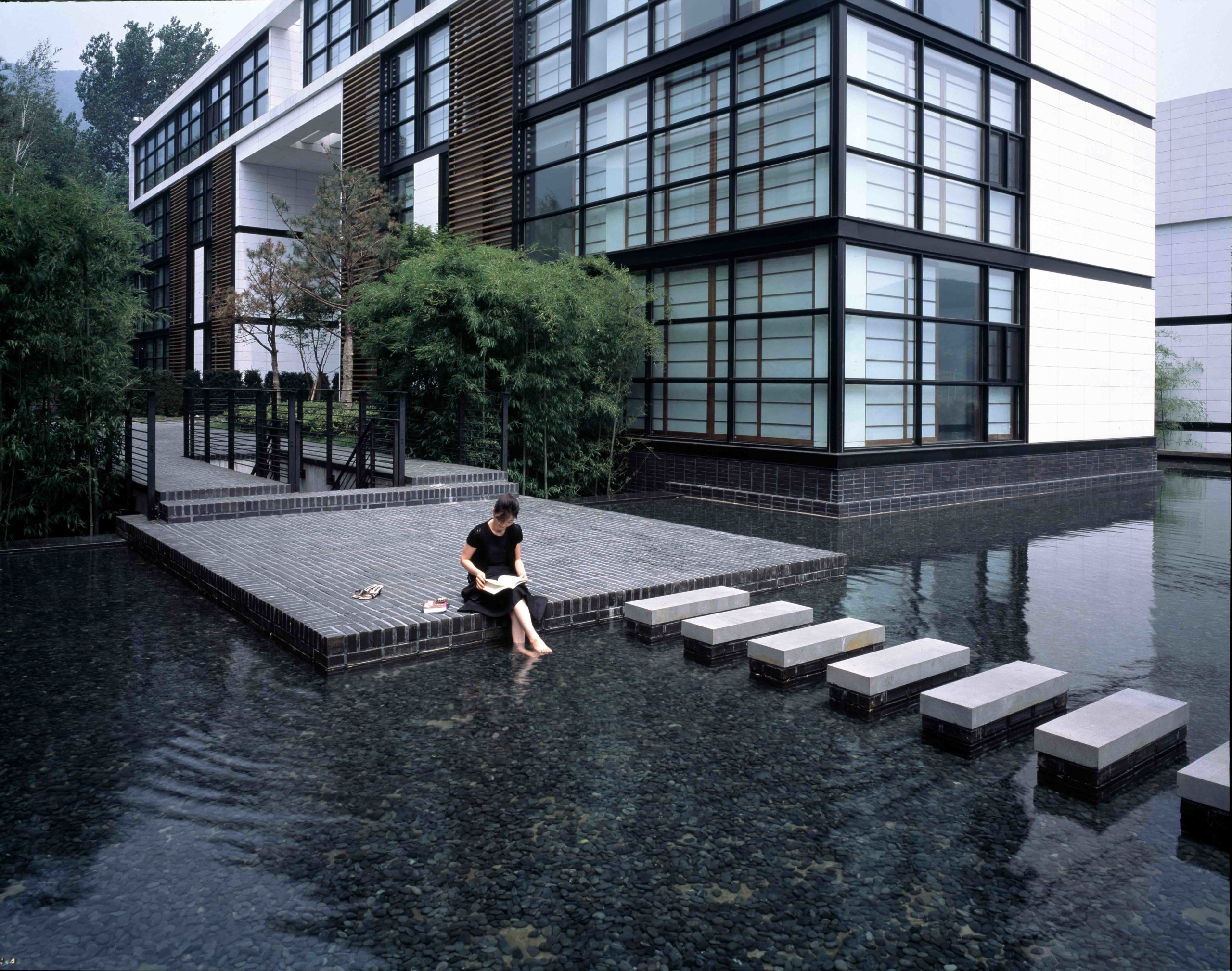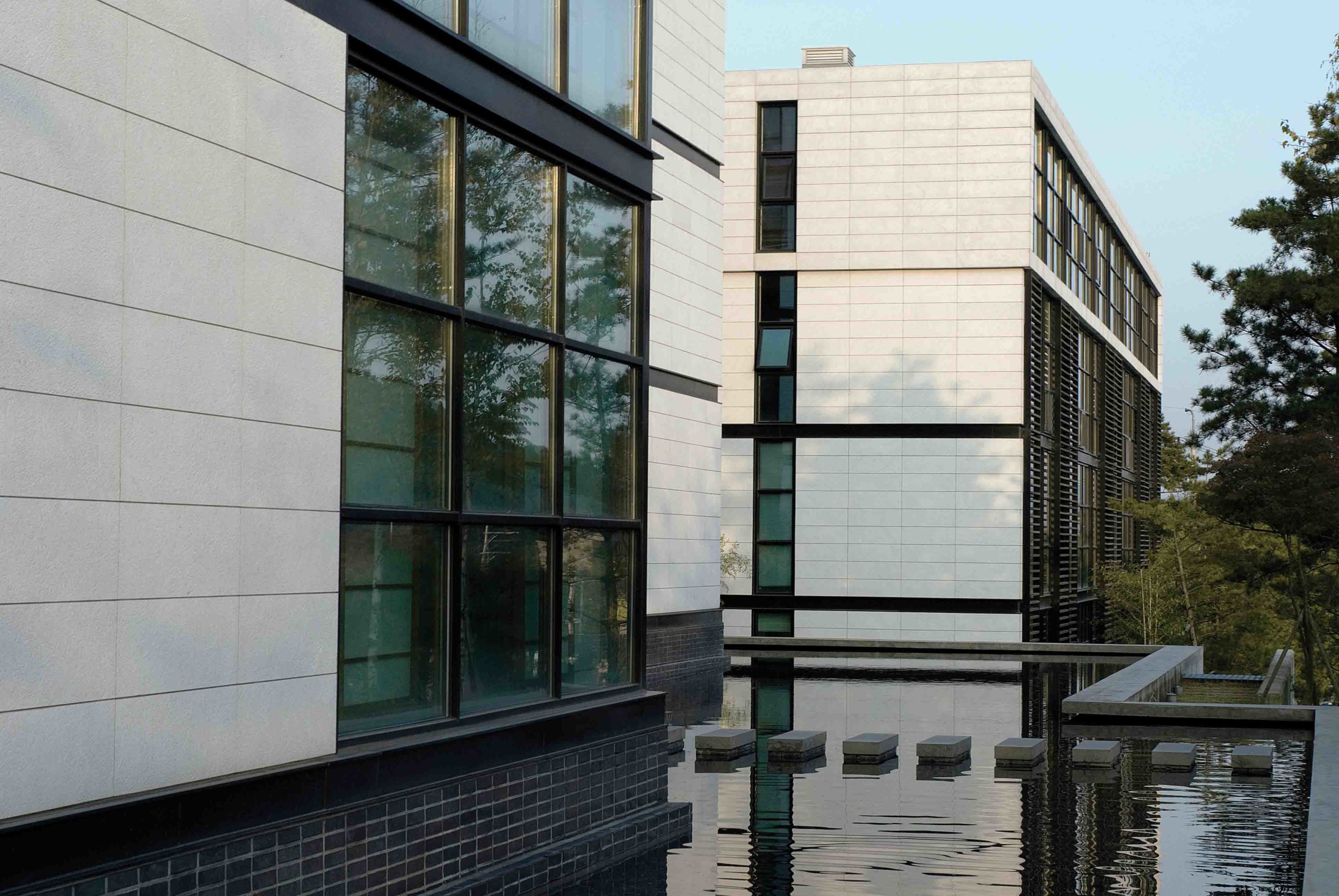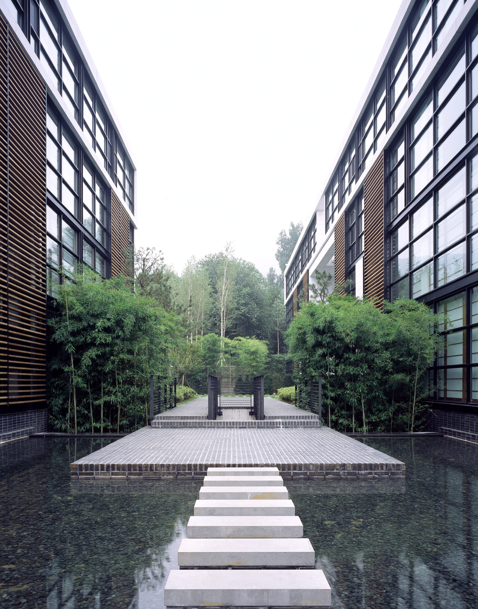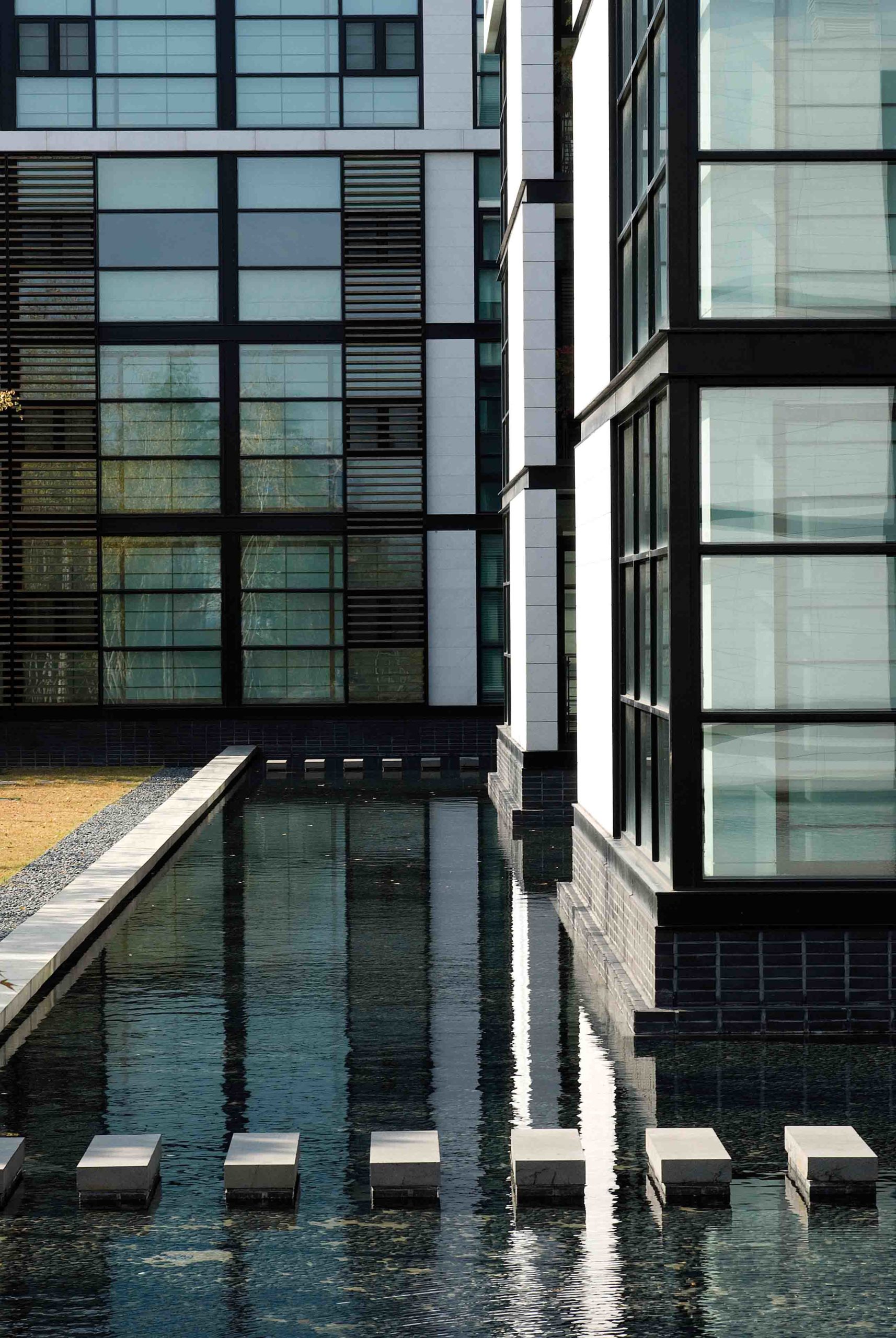All flats open onto the garden and the landscape. The day rooms are made up of large full-height windows that can be covered with interior blinds. The vegetation in the garden is in direct contact with the flats, regardless of the floor. Visitors access the building on foot from the guardhouse via a large black brick walkway. This driveway overhangs the bamboo gardens of the car parks. From the main driveway, it is possible to reach the large birch garden to the south of the buildings by crossing the pond.
