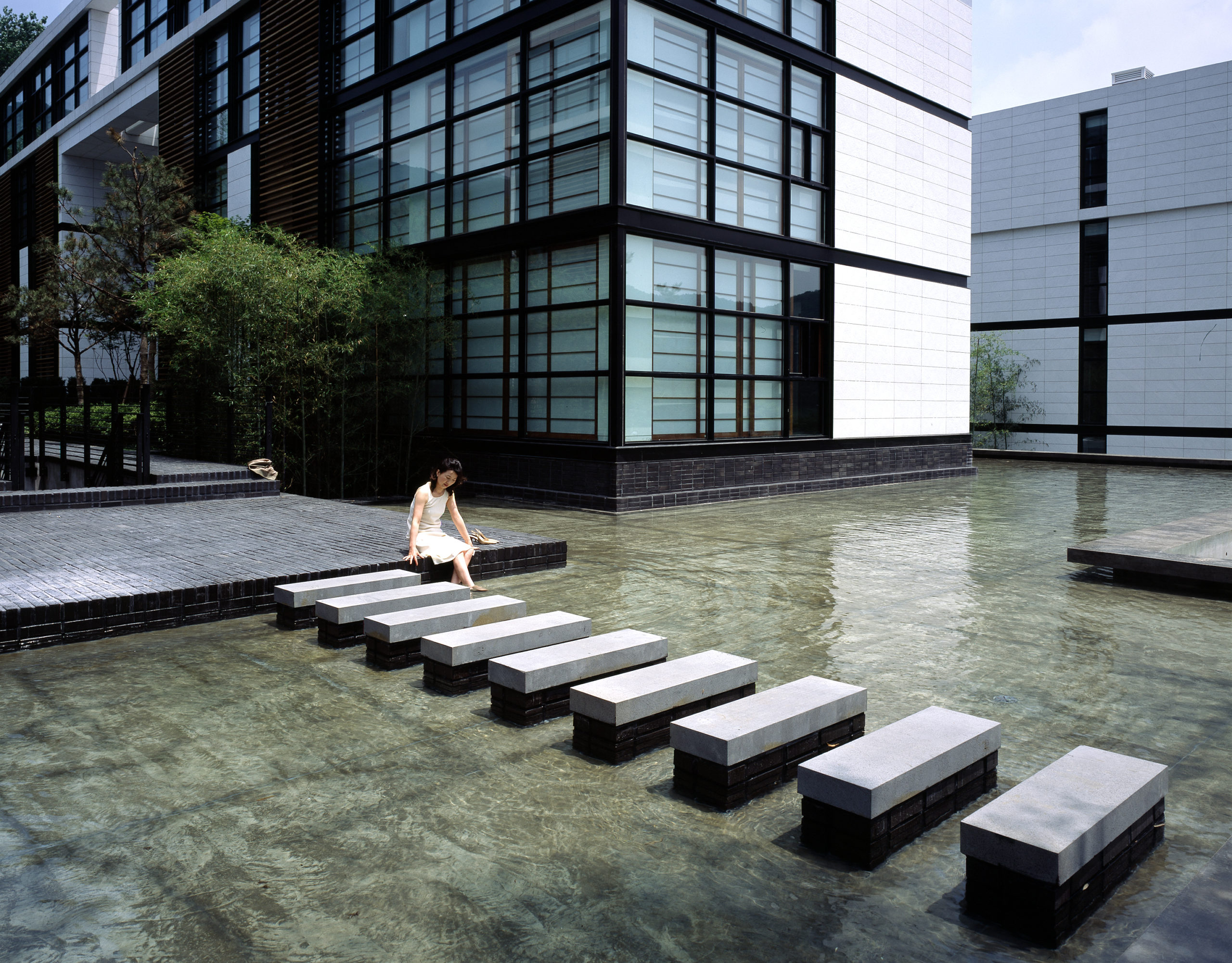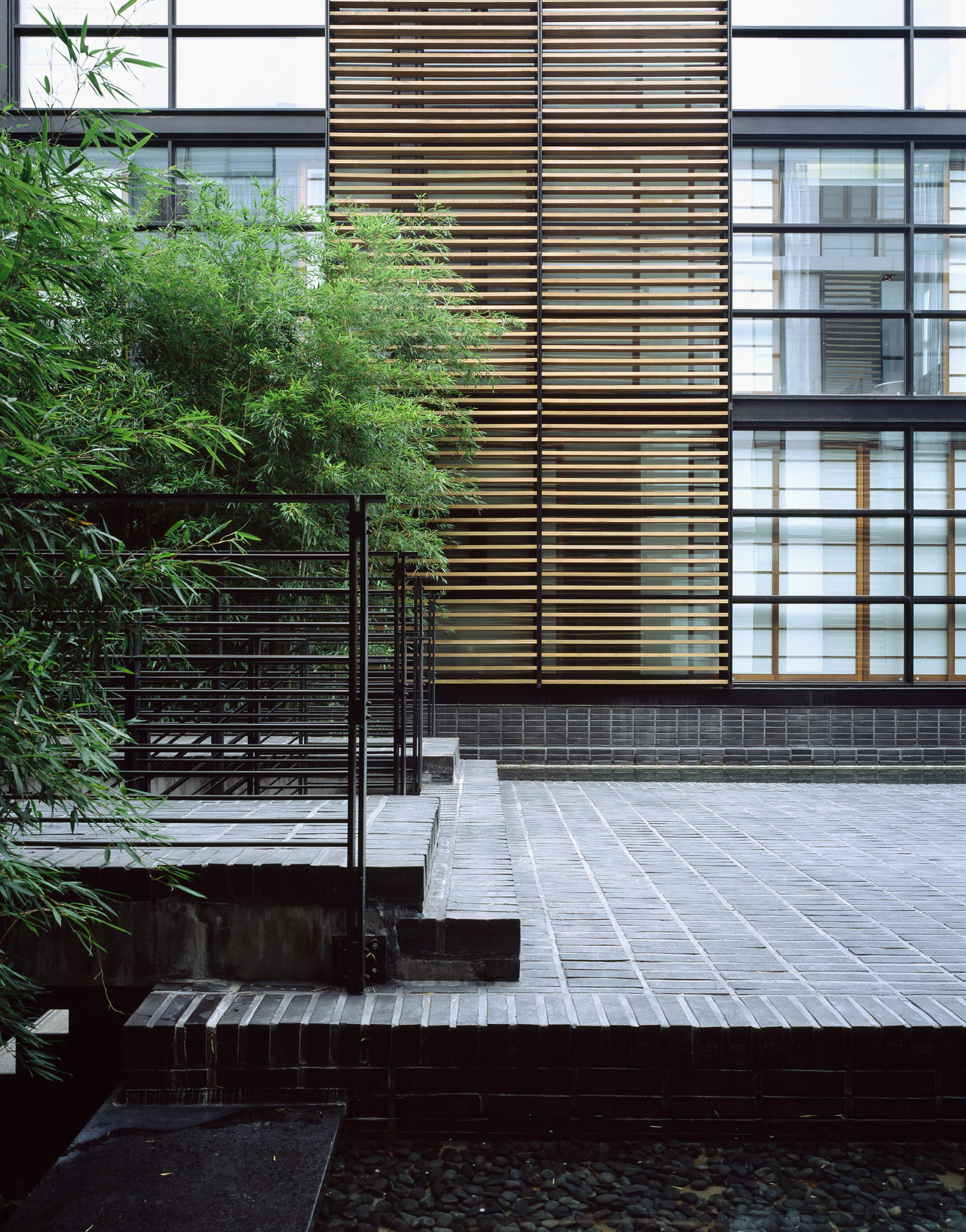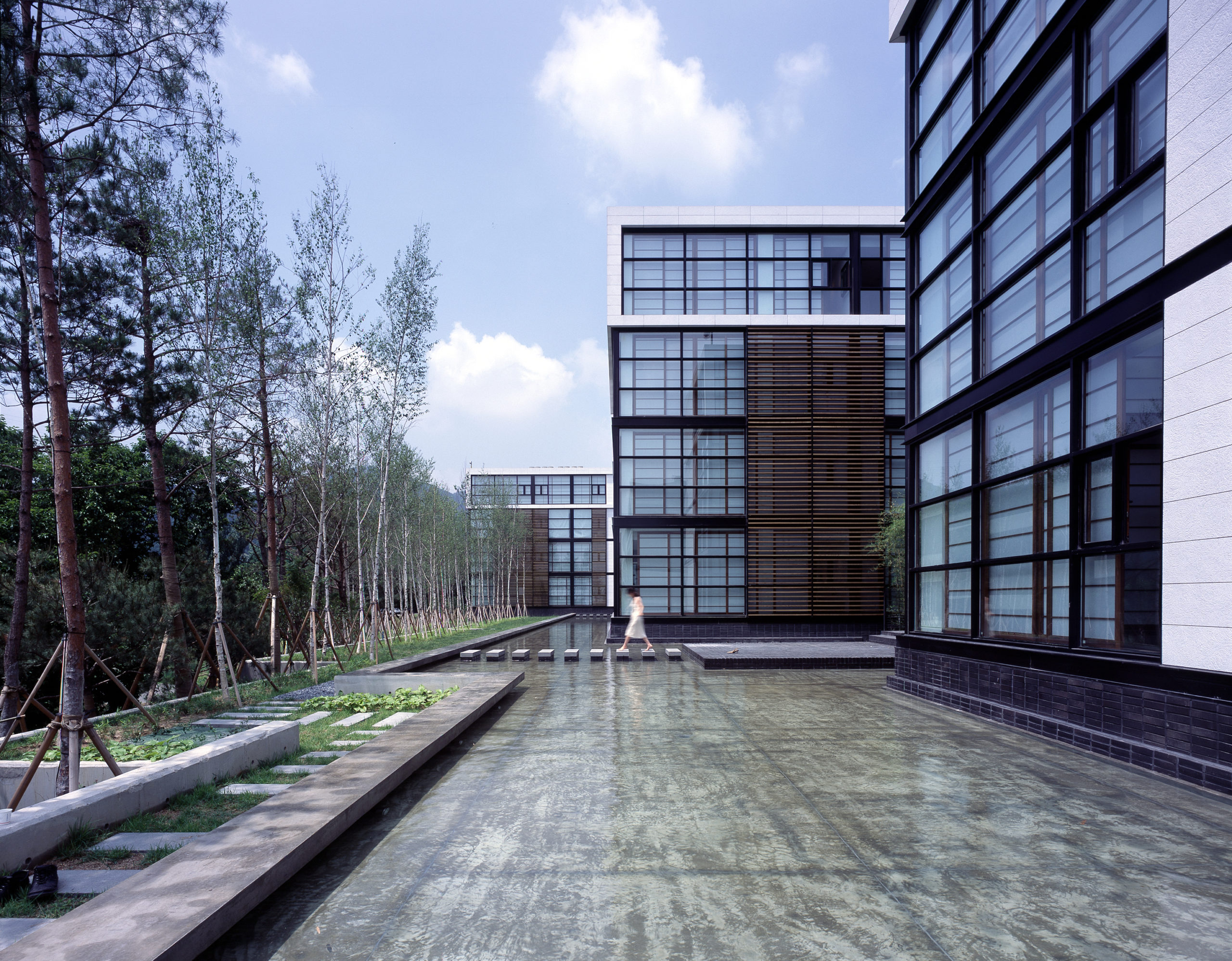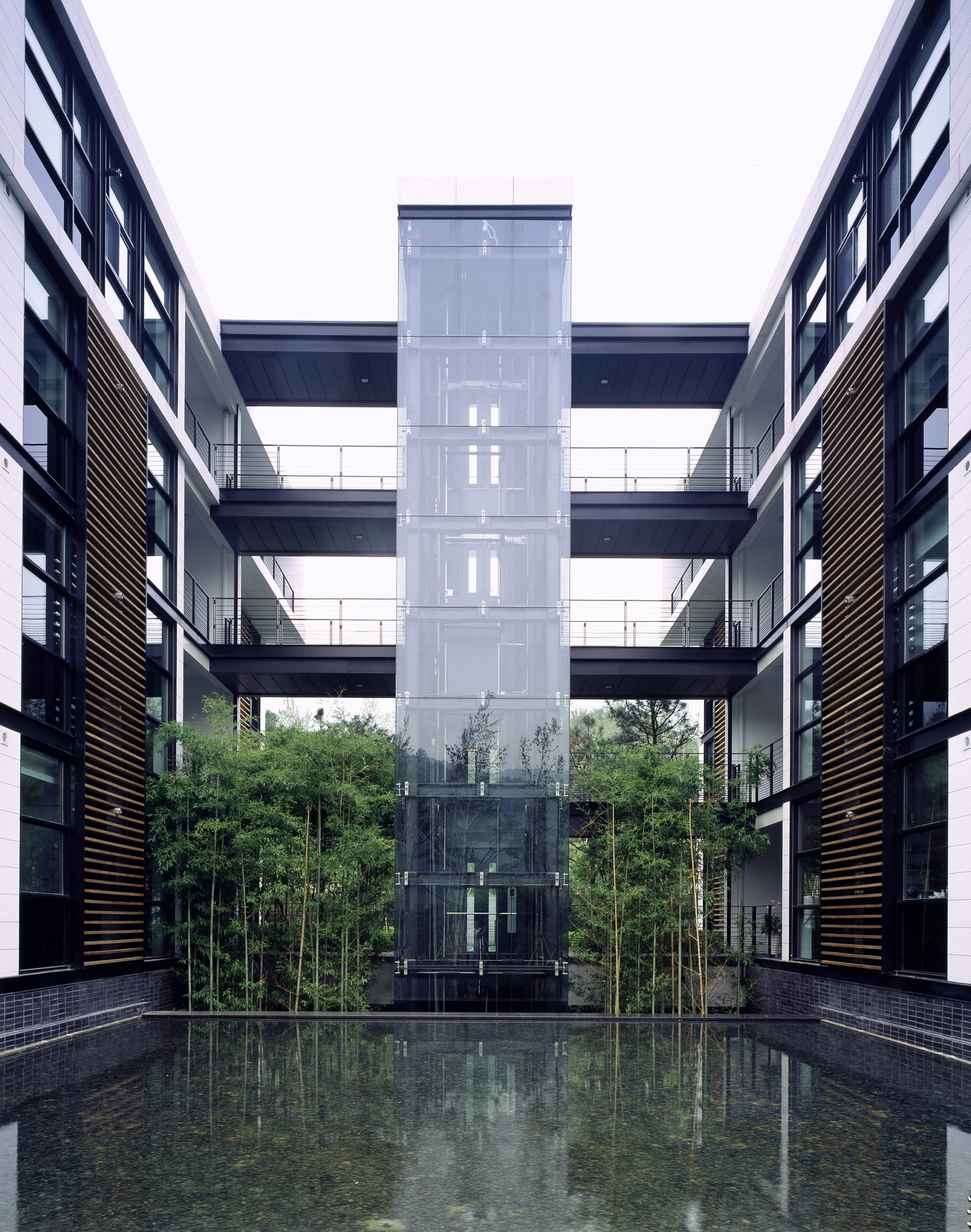 All flats open onto the garden and the landscape. The day rooms are made up of large full-height windows that can be covered with interior blinds. The vegetation in the garden is in direct contact with the flats, regardless of the floor. Visitors access the building on foot from the guardhouse via a large black brick walkway. This driveway overhangs the bamboo gardens of the car parks. From the main driveway, it is possible to reach the large birch garden to the south of the buildings by crossing the pond.
