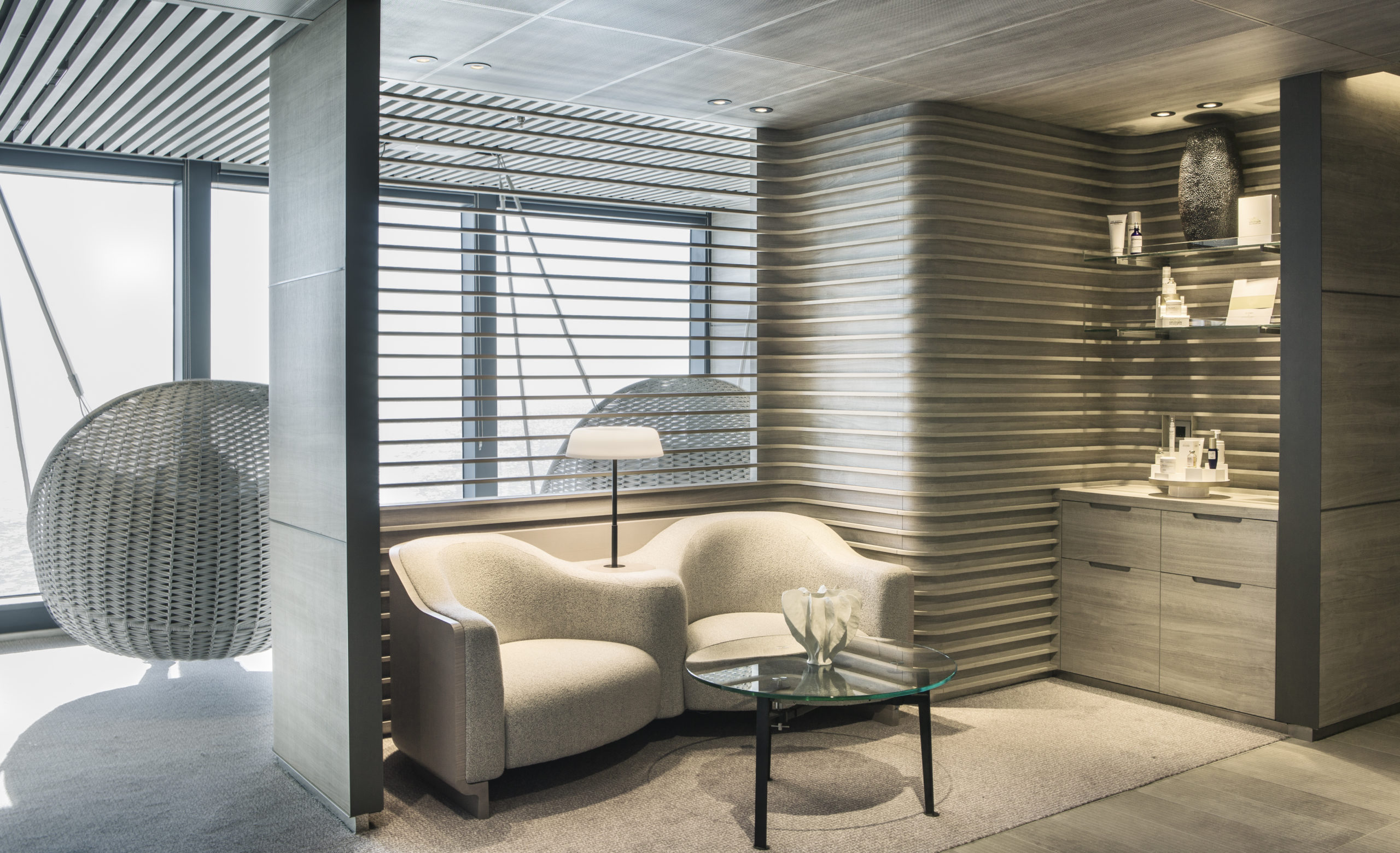 The W&A intervention is spread over three decks: the ship's lobby on Deck 5, the departure lock for excursions on Deck 3, and the whole of Deck 9 including the Observatory (a large lounge bar), the spa, the fitness centre, the swimming pool, a restaurant and finally the aft deck outside with a bath and panoramic view.