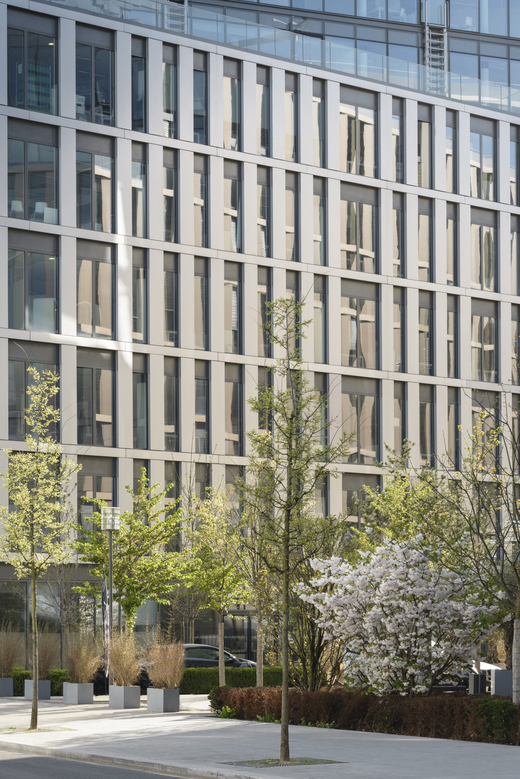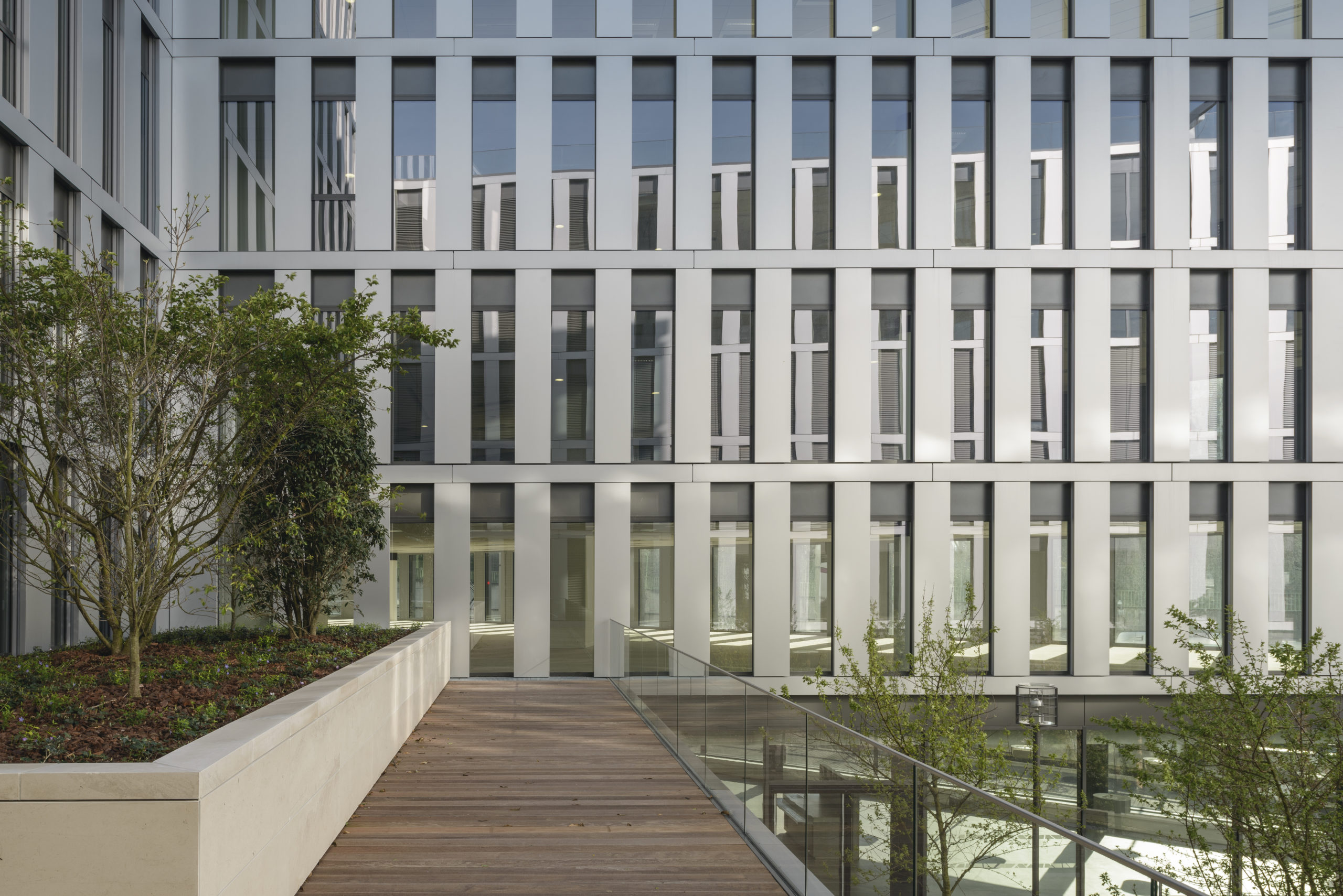 The study of the facades was an important point for the project, their design is homogeneous and orderly. The treatment of the facades was developed in the form of an urban itinerary and responds appropriately to requirements such as solar exposure, heat gain, daylight factors, solar protection, acoustic and environmental constraints. The green roof terraces provide a real visual continuity between the park and the buildings. The accessible terraces form the fifth façade of the project and contribute to the interior comfort of the offices.
