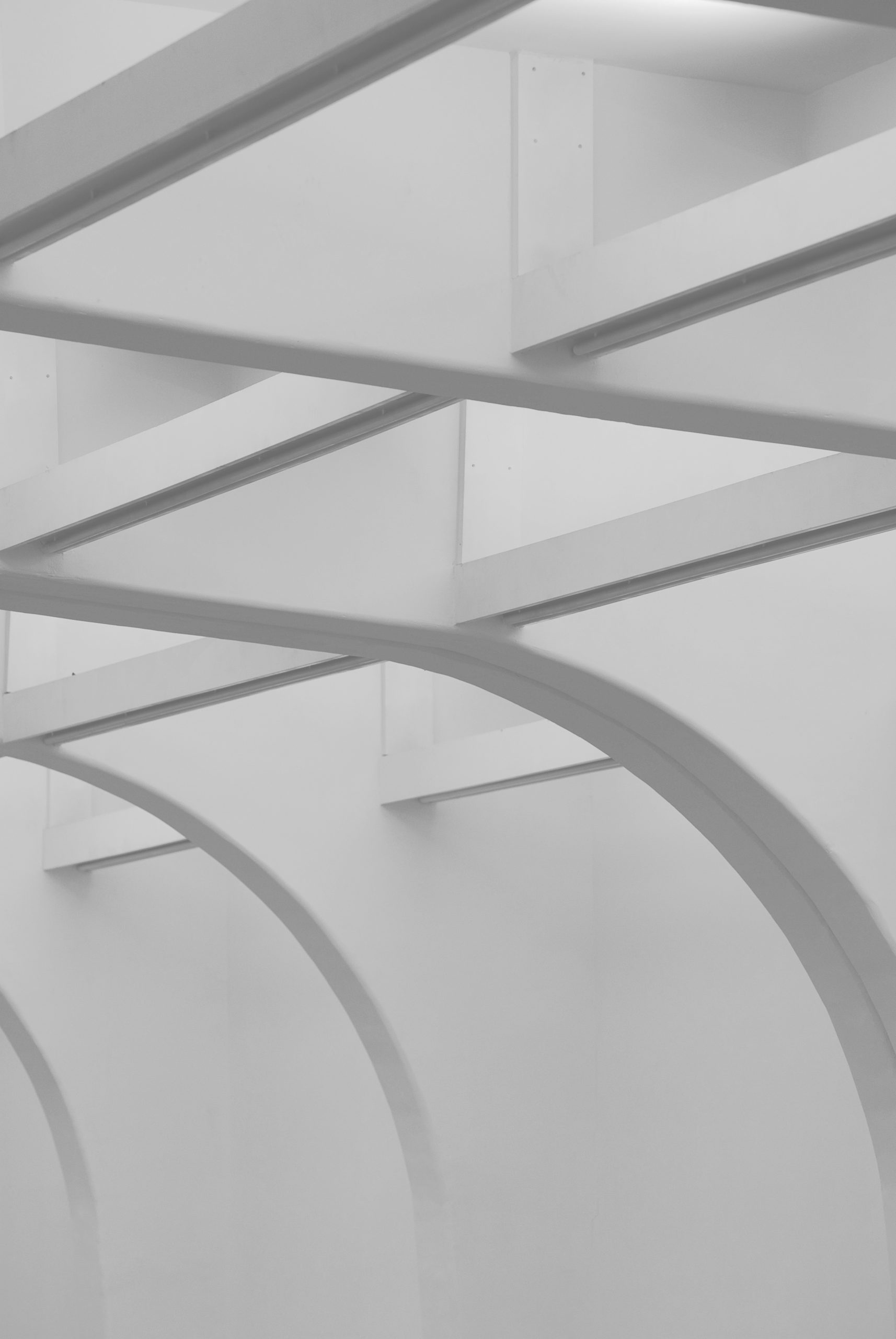 In order to obtain maximum surface area, the two naves were connected, creating twin halls topped by low arches that support the roof. The first nave contains two exhibition rooms of 200 sqm and 280 sqm and related functions. The second nave offers a completely free and modular space of 2,000 sqm. A steel walkway is placed at the key to the porticos of the two naves, like a black line in a dazzling white universe. Mezzanines bordered by black frames emphasise the geometry of the space and give access to the archive and management offices. The use of natural light and indirect lighting from fluorescent tubes under the ceiling creates a particularly pleasant atmosphere.