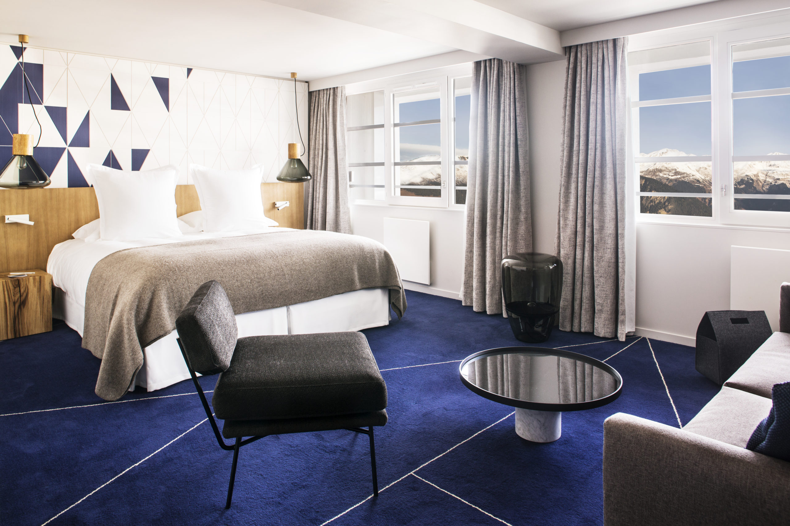 The starting point for this renovation is the creation of a set of spaces with a contemporary feel. A geometric decor based on triangles, a nod to mountain peaks, forms the common thread running through the project. This motif is used on all floors in a variety of materials, both in the wall coverings and on the floors.