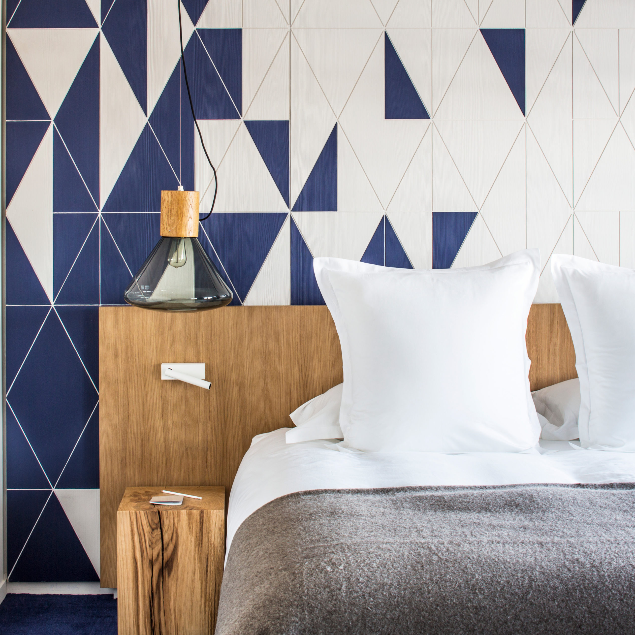 In the entrance hall, the motif is carved into white lacquered brushed wood. It is juxtaposed with natural light oak panelling, a second material used in most of the spaces in the form of furniture or wall finishes. The ambience of the twenty-six rooms, divided into five types, is characterised by a high level of luminosity dominated by white and enhanced by unexpected touches of colour and a selection of atypical, made-to-measure furniture.