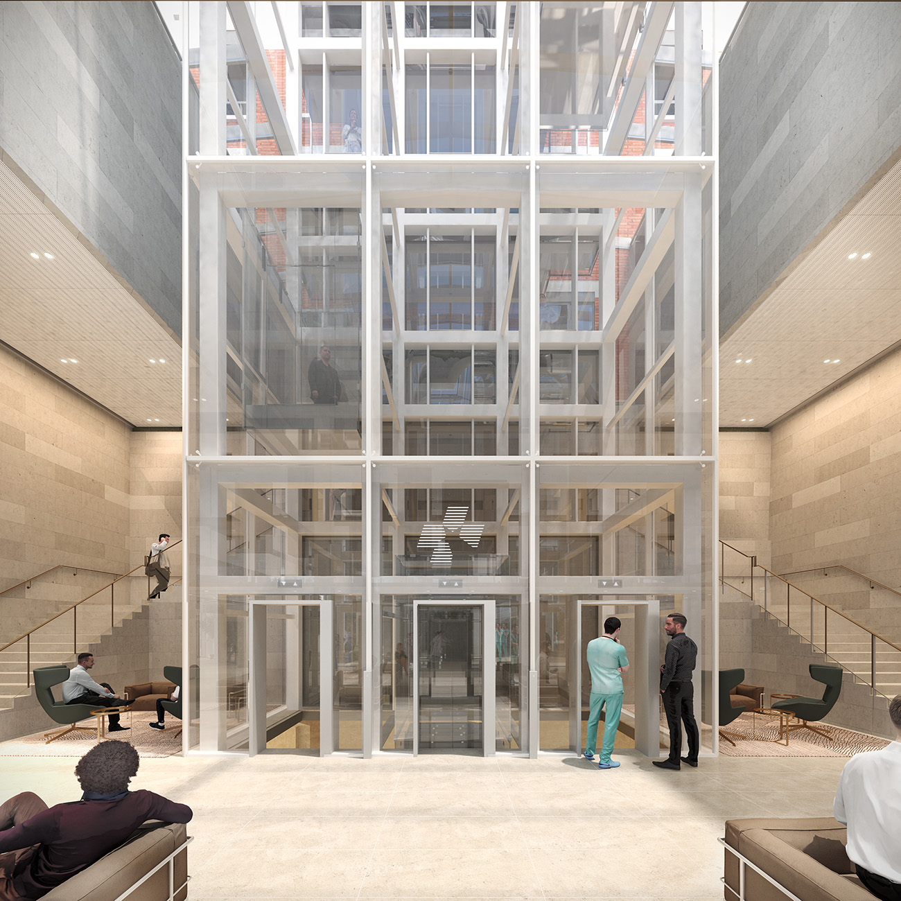 Deux escaliers monumentaux accompagnent le triplex vitré du hall, créant une liaison visuelle et physique avec le hall haut où se situait avant l’accueil de l’hôpital.