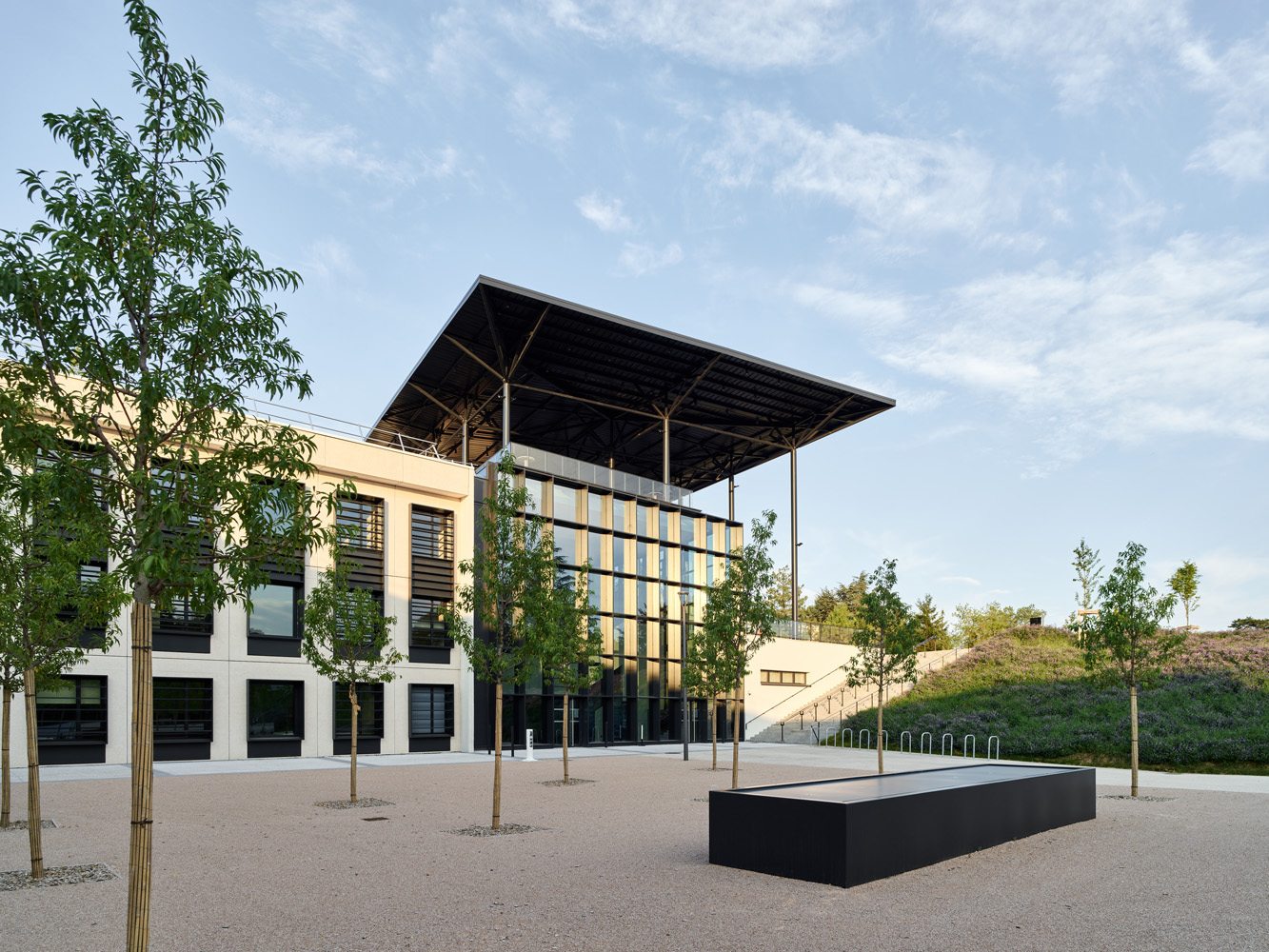 Le site répond par de nombreux points aux enjeux écologiques : 500 m² de panneaux photovoltaïques, 100 nouveaux arbres plantés, réemploi des matériaux et des chutes de chantier.