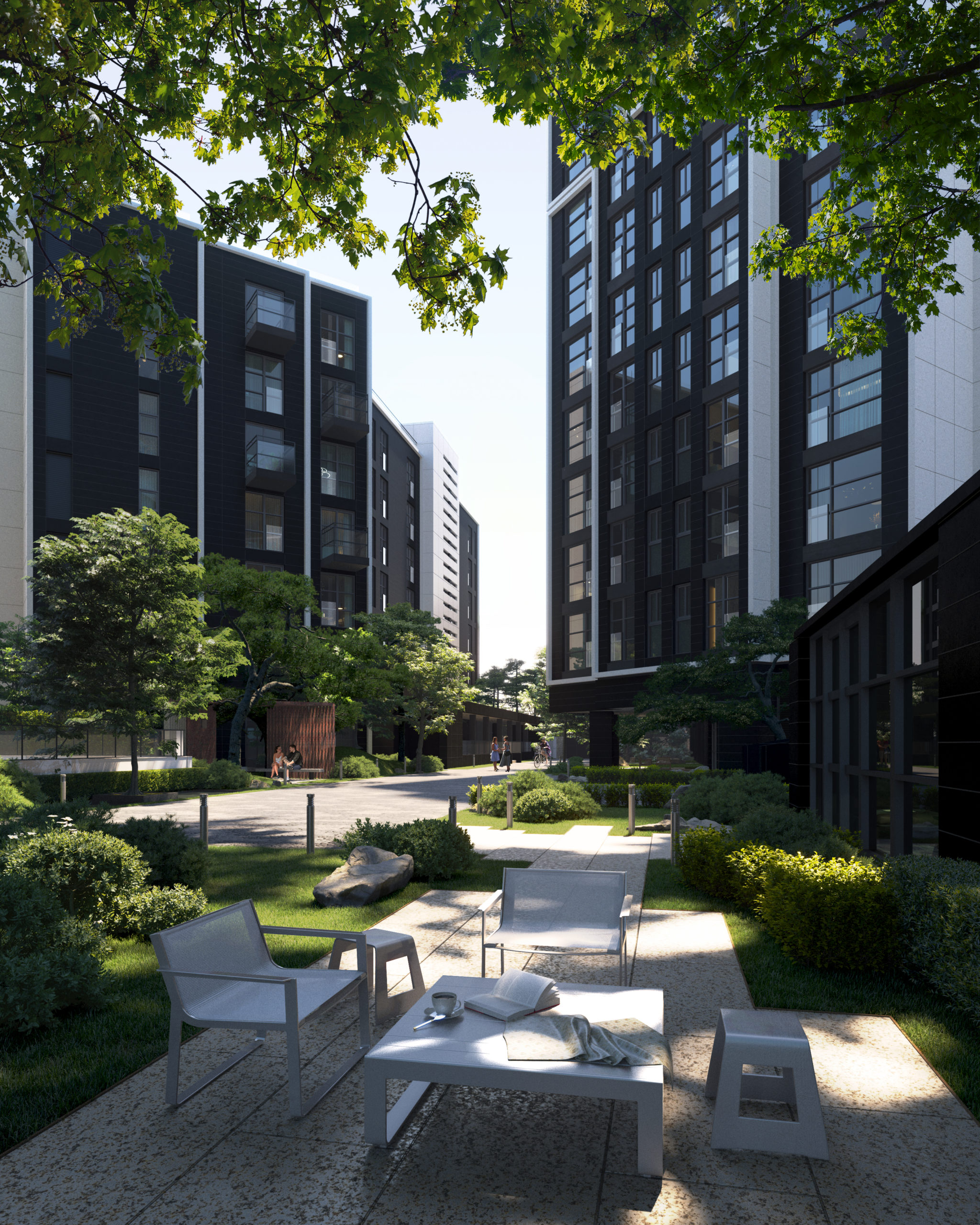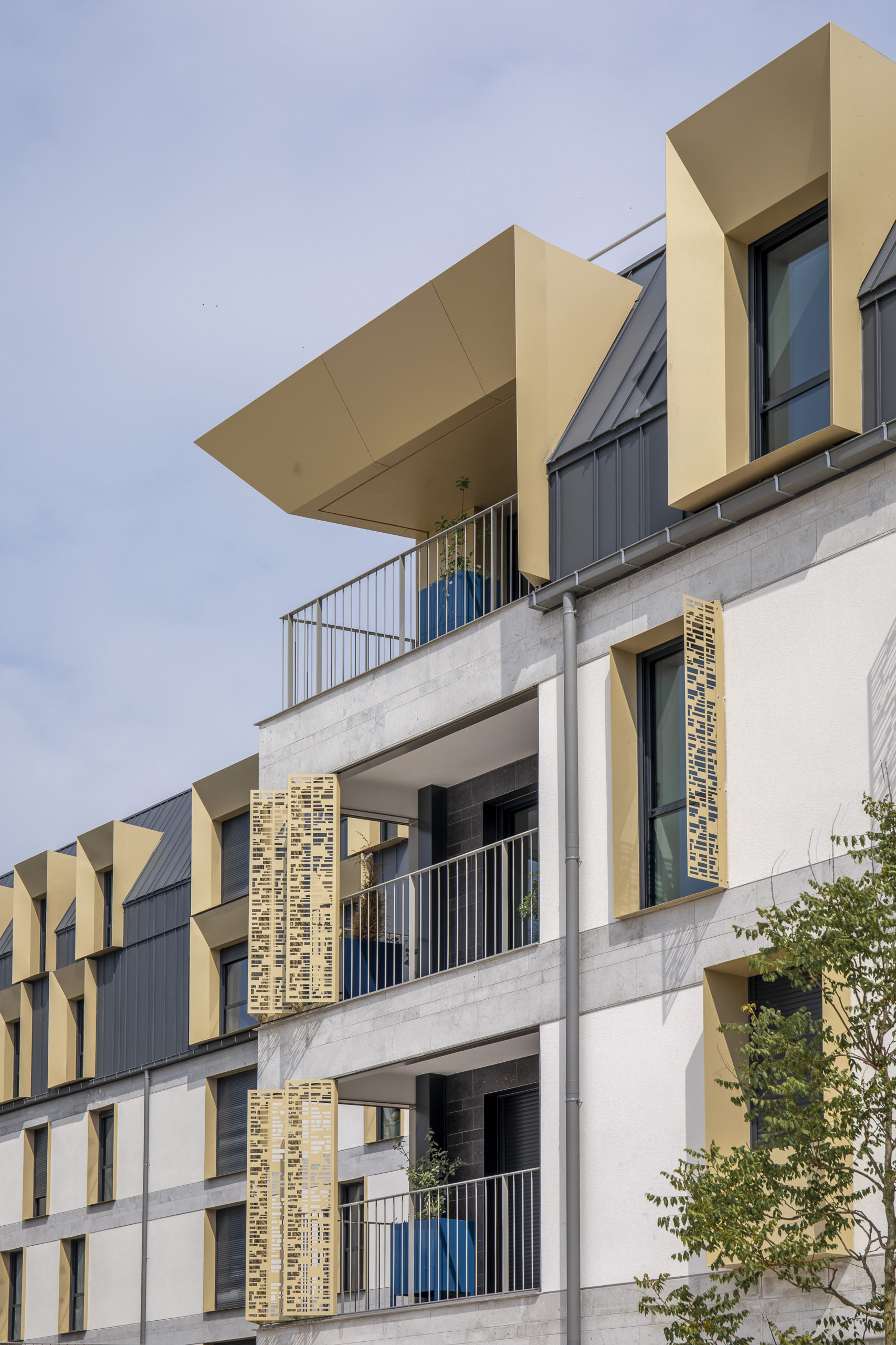 Le projet s’intègre à son voisinage en respectant la dimension historique et contemporaine de la ville situé entre le Château de Paris-Jardin et la Halle du marché, par l’utilisation des matériaux nobles tel que la pierre, et par la modernité du traitement des habillages métalliques des lucarnes et des loggias apportant une dynamique au projet. En réponse aux toitures mansardées des bâtiments environnants, la toiture des bâtiments reprend cette typologie mansardée percée de lucarnes ayant un encadrement métallique de teinte champagne. La présence de grandes baies dans les pièces à vivre permet de tirer parti au maximum de la lumière et des vues. La profondeur de la façade créée par les loggias ainsi que les pare-soleils fournissent une protection contre le bruit de la rue, le froid en hiver, le chaud en été.