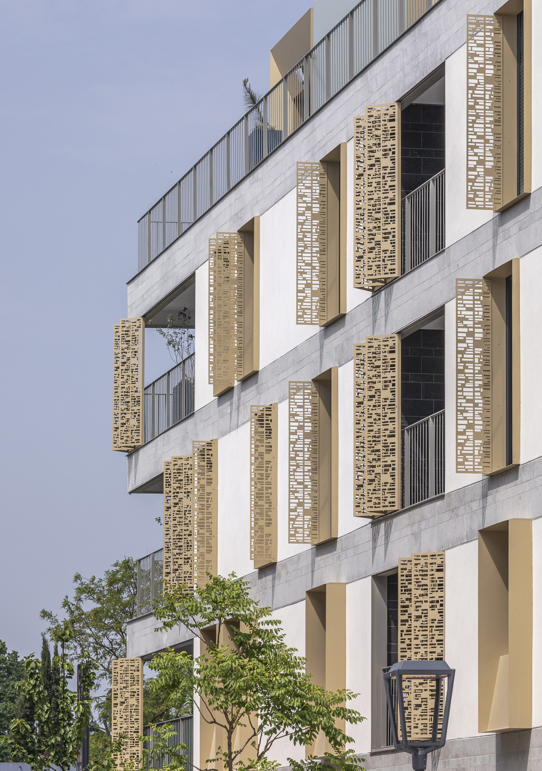 Au rez-de-chaussée, la pierre de teinte foncée surmontée d’un bandeau métallique foncé encadrant les vitrines des boutiques et les entrées des logements forment un socle aux bâtiments.