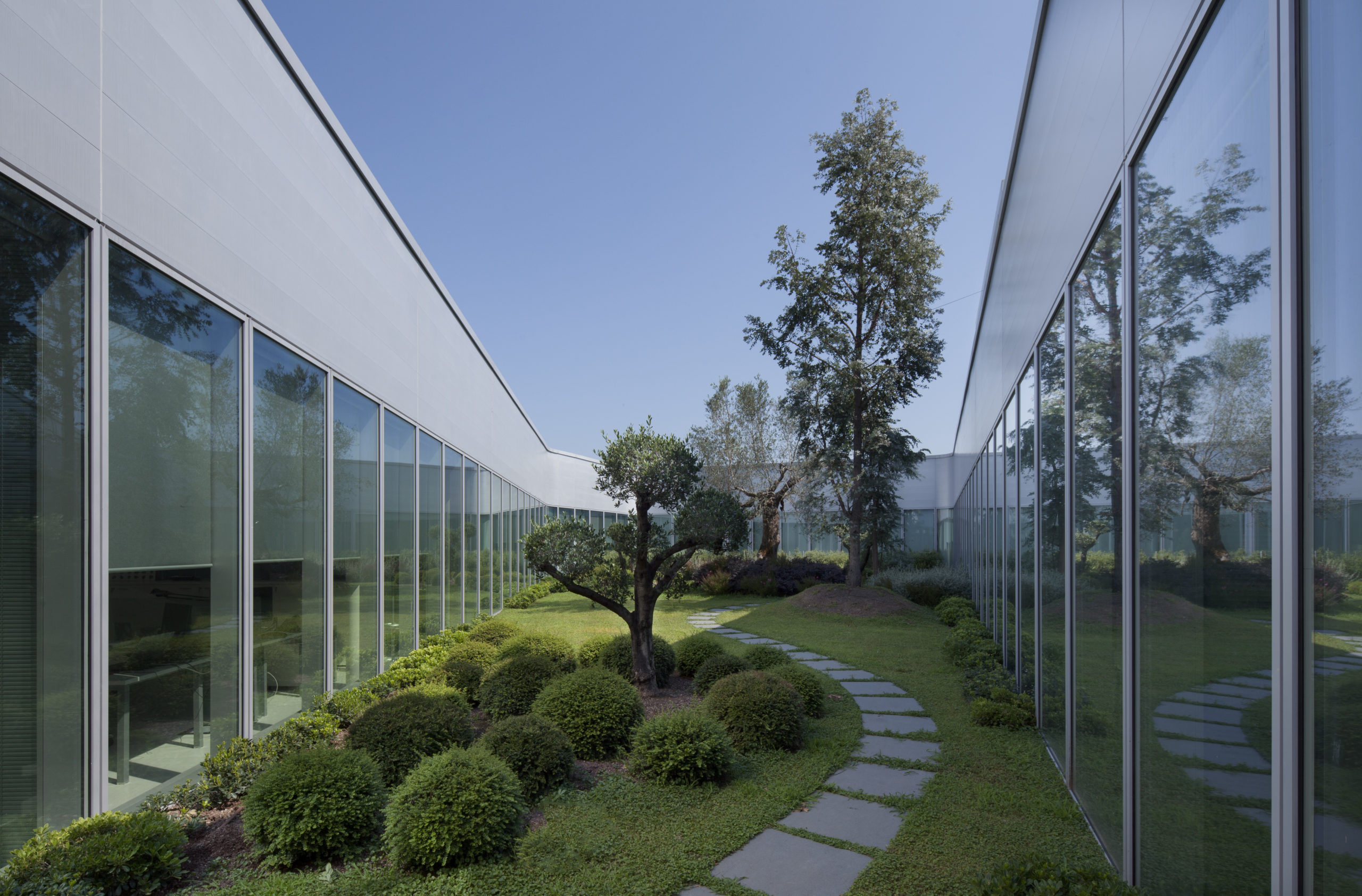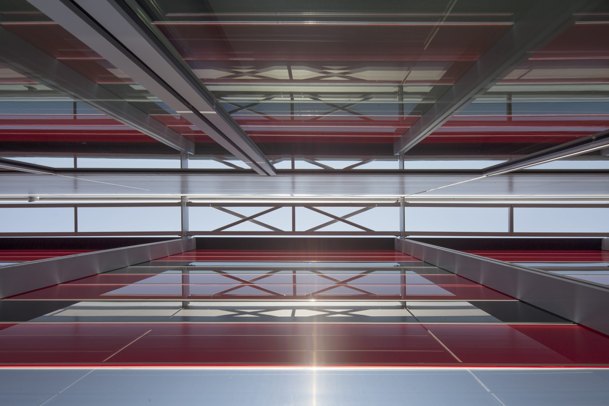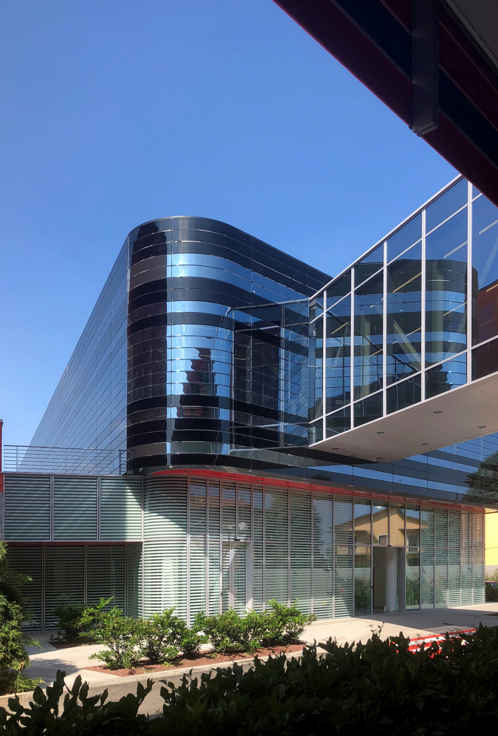 De verre et de métal, aux mêmes couleurs que le bâtiment principal, l’extension se développe également sur trois niveaux : le sous-sol et le rez-de-chaussée logent les activités liées au montage des voitures de F1 (ateliers et laboratoires), le premier étage accueille les bureaux techniques, les espaces de représentation et de communication.