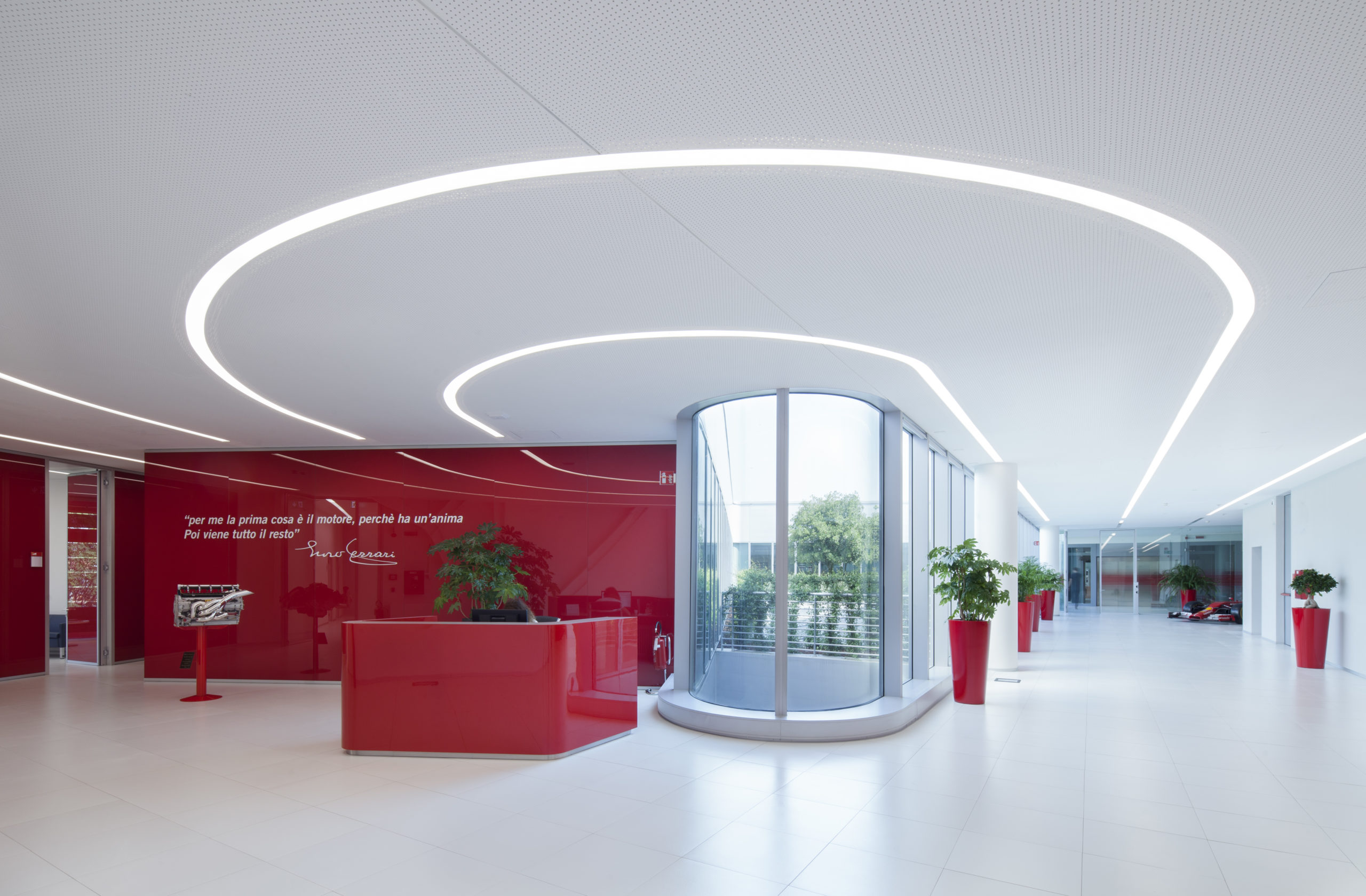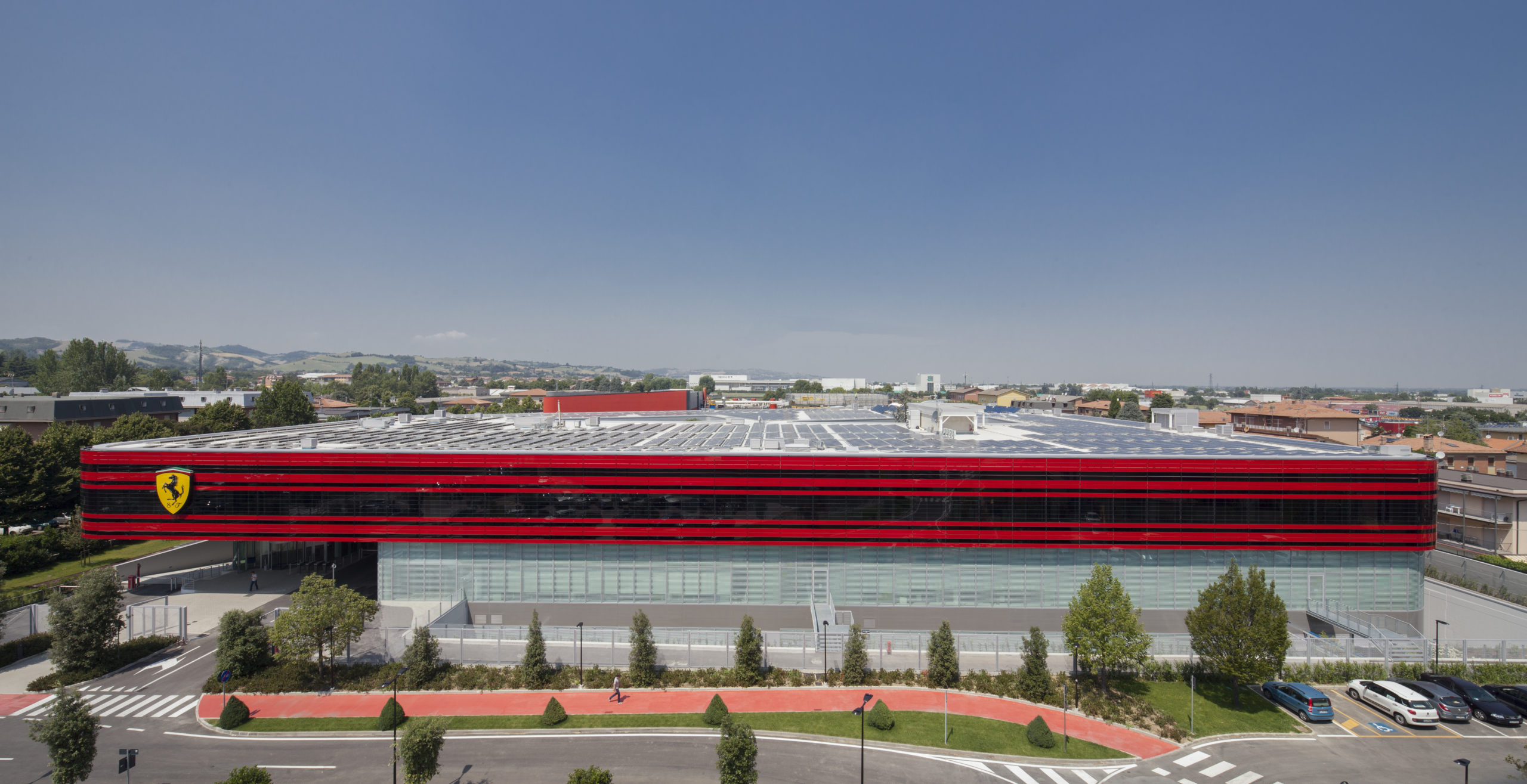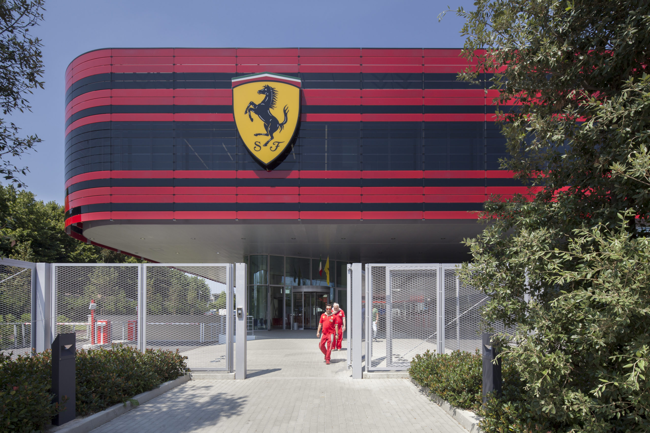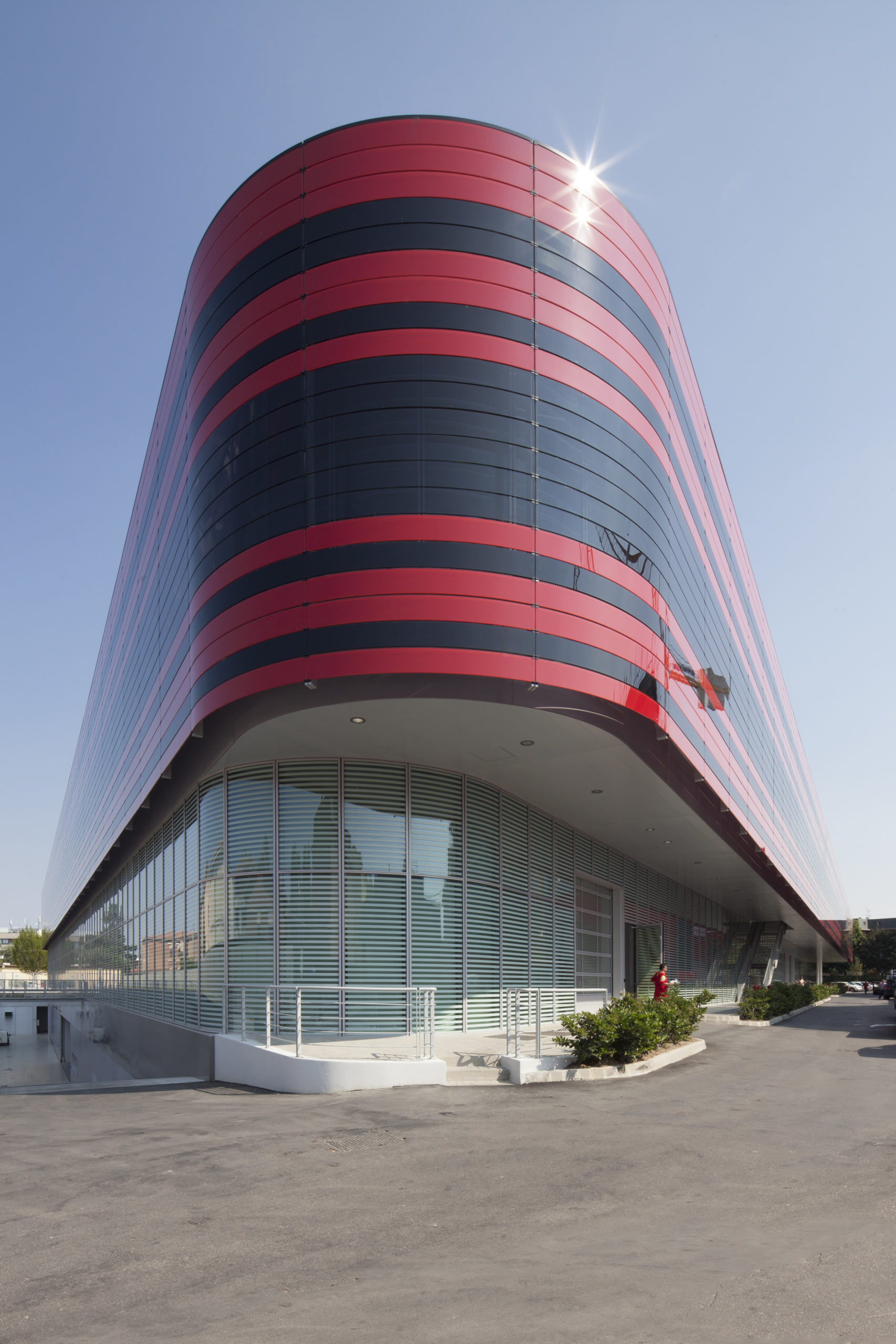 Le nouveau bâtiment de la Gestione Sportiva se présente comme la nouvelle porte d’entrée de la zone dédiée à l’Écurie Ferrari à Maranello, en Italie, zone qui comprend déjà le circuit d’essai de Fiorano ainsi que les bâtiments de la logistique et d’essais des moteurs. Le bâtiment, ouvert sur la rue publique, offre une façade représentative de Ferrari à travers le rouge, le noir et le métal réfléchissant. La forme sinueuse rappelle la force, le caractère et le dynamisme des modèles automobiles du constructeur de luxe.