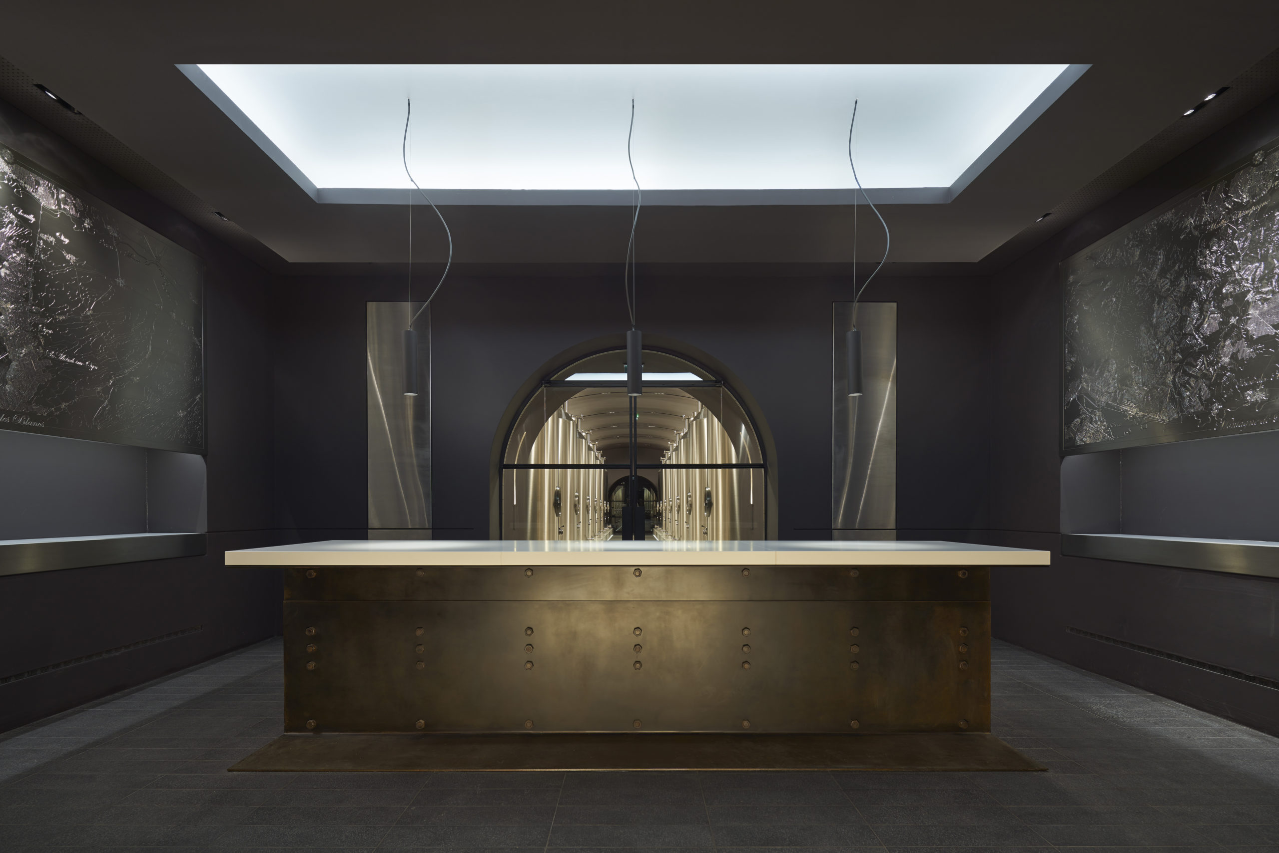 Afin de se détacher de l’environnement sombre (murs et plafonds noirs), les cuves à double parois en inox brossé sont posées sur un socle blanc en pierre reconstituée: elles brillent dans la pénombre pour imposer fièrement leur sophistication. En collaboration étroite avec la société Pierre Guérin Technologies, ces cuves ont été entièrement redessinées, afin de dissimuler les branchements disgracieux et simplifier leur forme. Le visiteur termine son parcours dans la salle de dégustation. Minimaliste, elle reprend les harmonies de noir et argent de la cuverie, rappelant l’étiquette des magnums Grand Siècle.