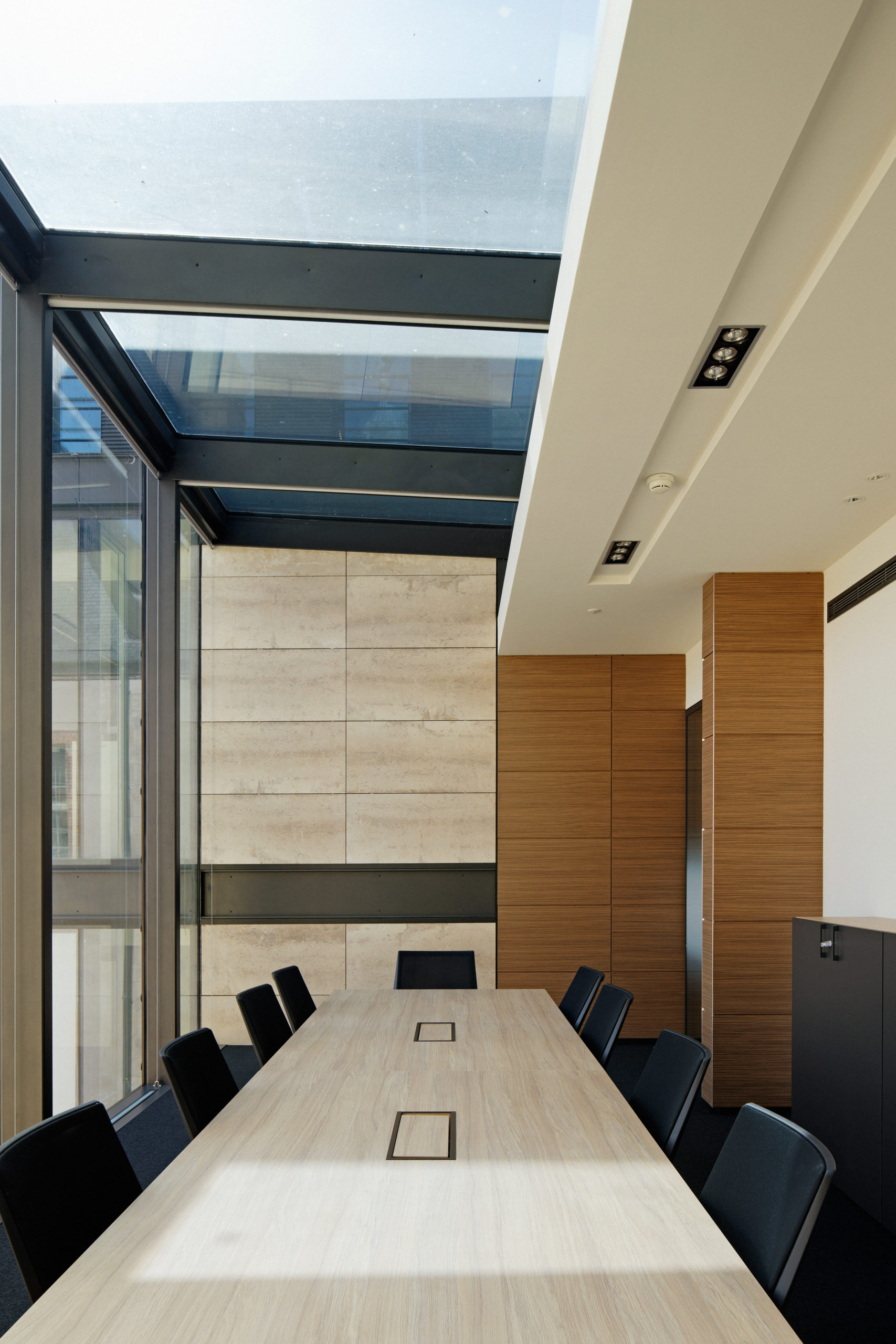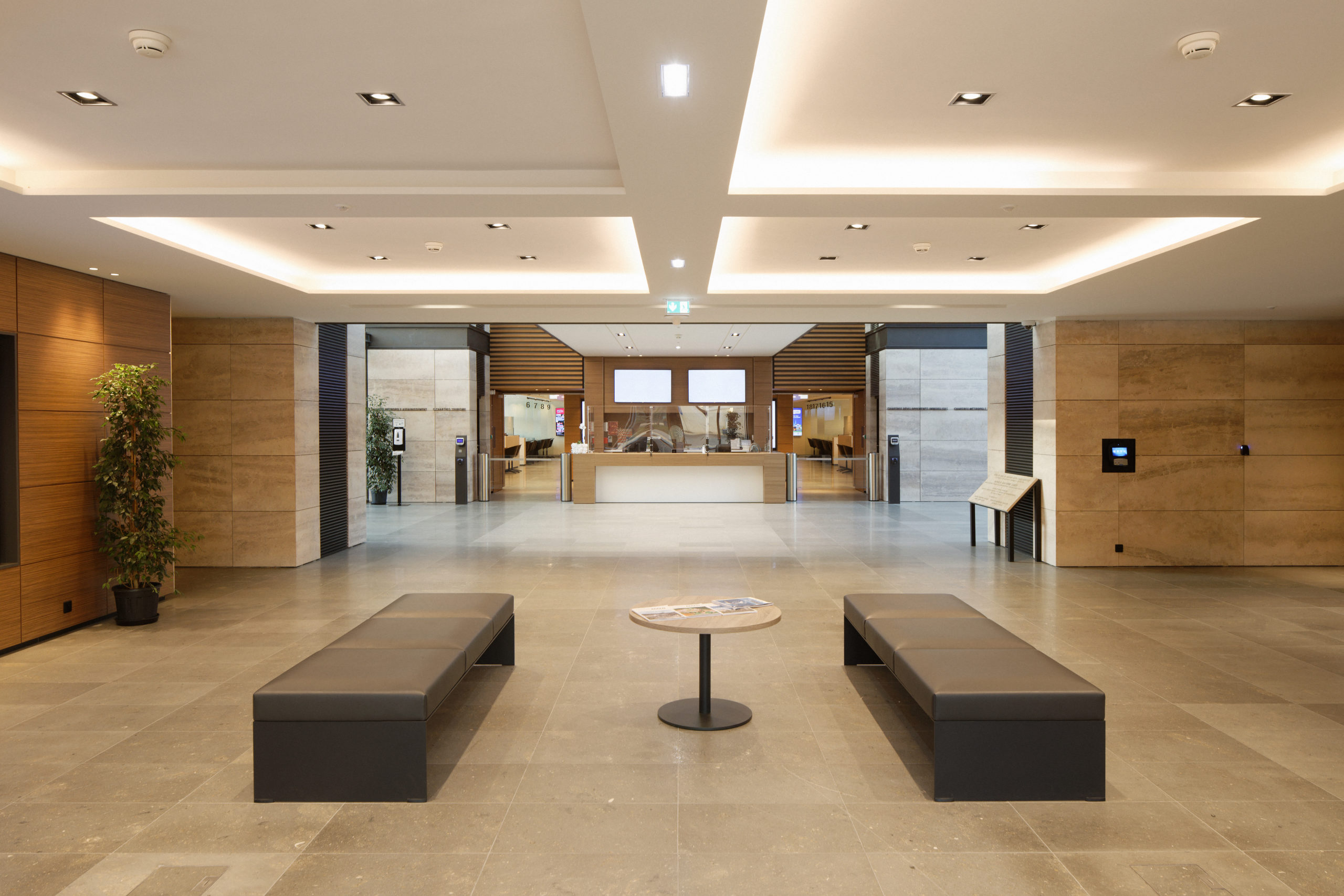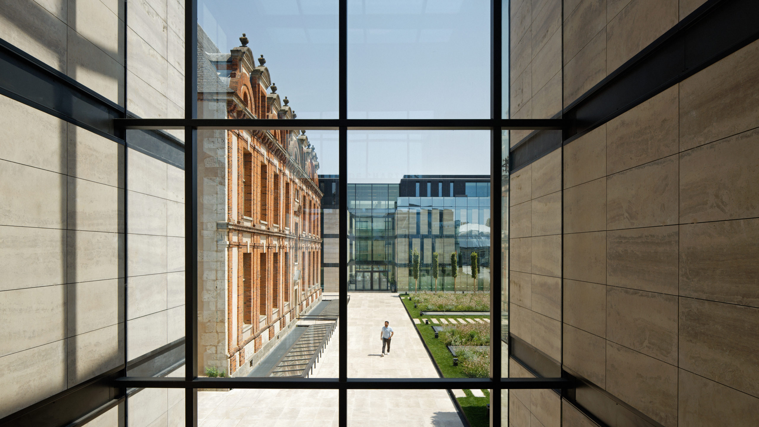 Trois entités s’expriment avec une grande lisibilité : l’hôtel Montescot (lieu des réceptions officielles et maison des élus), l’aile des Halles (services de la vie communale) et l’aile Saint-Michel (pôle administratif). Wilmotte & Associés a proposé des solutions additionnelles, telles que l’utilisation d’une structure et de façades à dominante mixte acier/bois et d’une toiture végétalisée, la récupération de l’énergie au niveau des locaux informatiques ou encore la mise en place de sondes géothermiques.