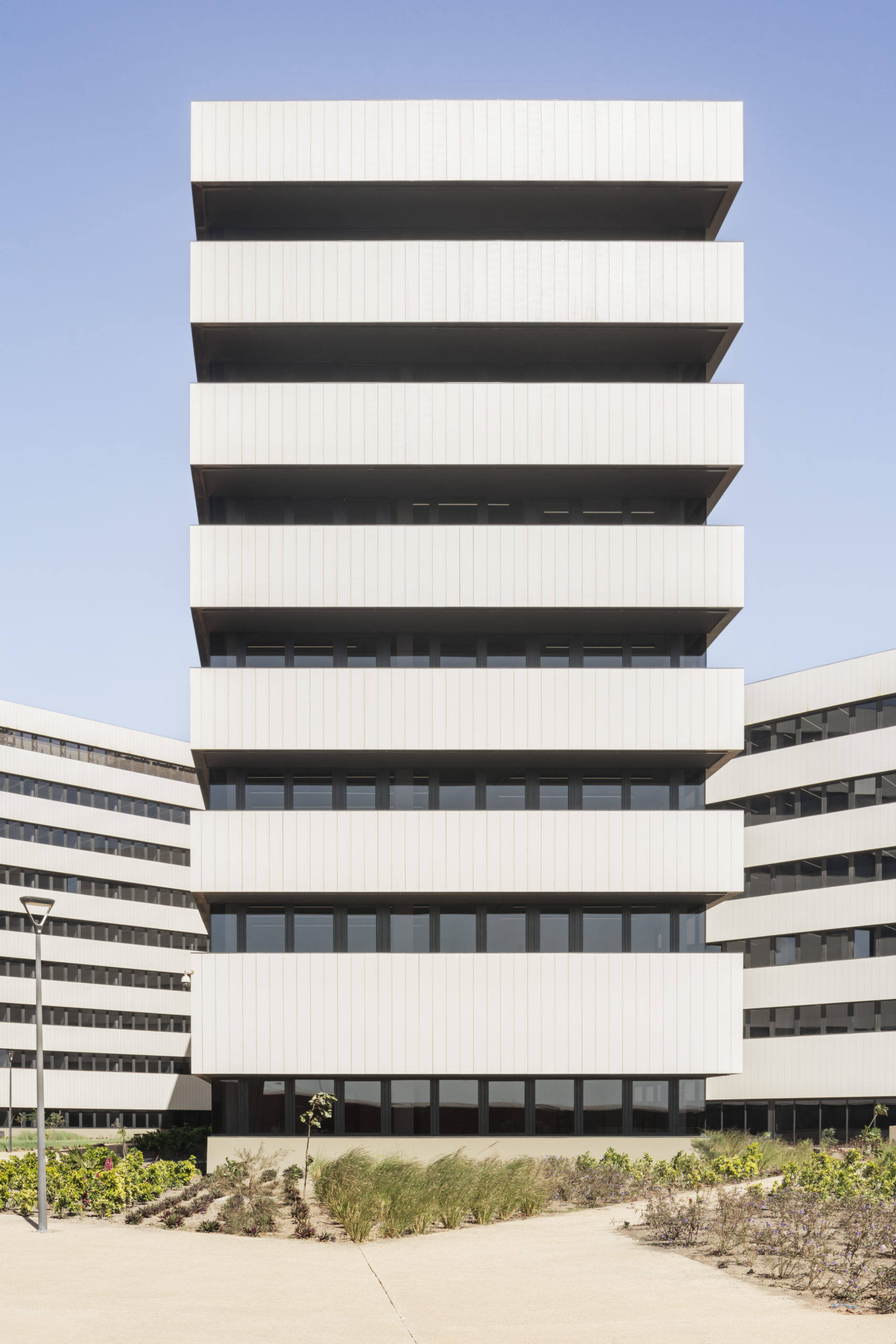 Initié par le gouvernement sénégalais, le projet rassemble les 34 agences onusiennes disséminées à Dakar dans un nouveau bâtiment emblématique. Sa forme rappelle celle d’un moulin à eau ou d’un soleil dont les rayons évoquent la concentration mais aussi le rayonnement et les influences. Il apparaît comme un volume circulaire blanc avec sept ailes qui se déploient. Une identité forte pour symboliser l’indépendance et la collaboration des agences en son sein ainsi que la puissance de son centre décisionnel, le tout dans un tout nouveau paysage urbain.