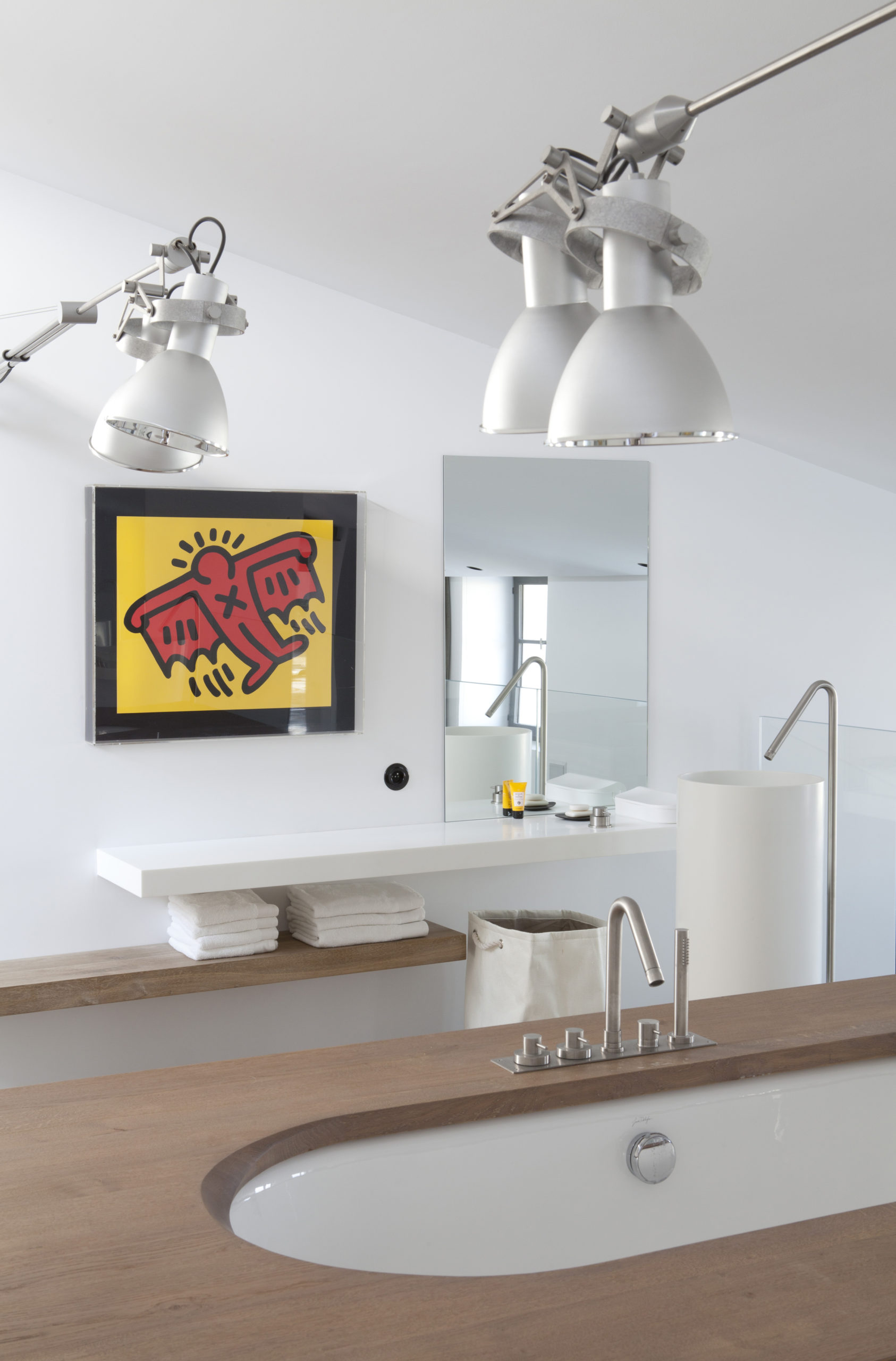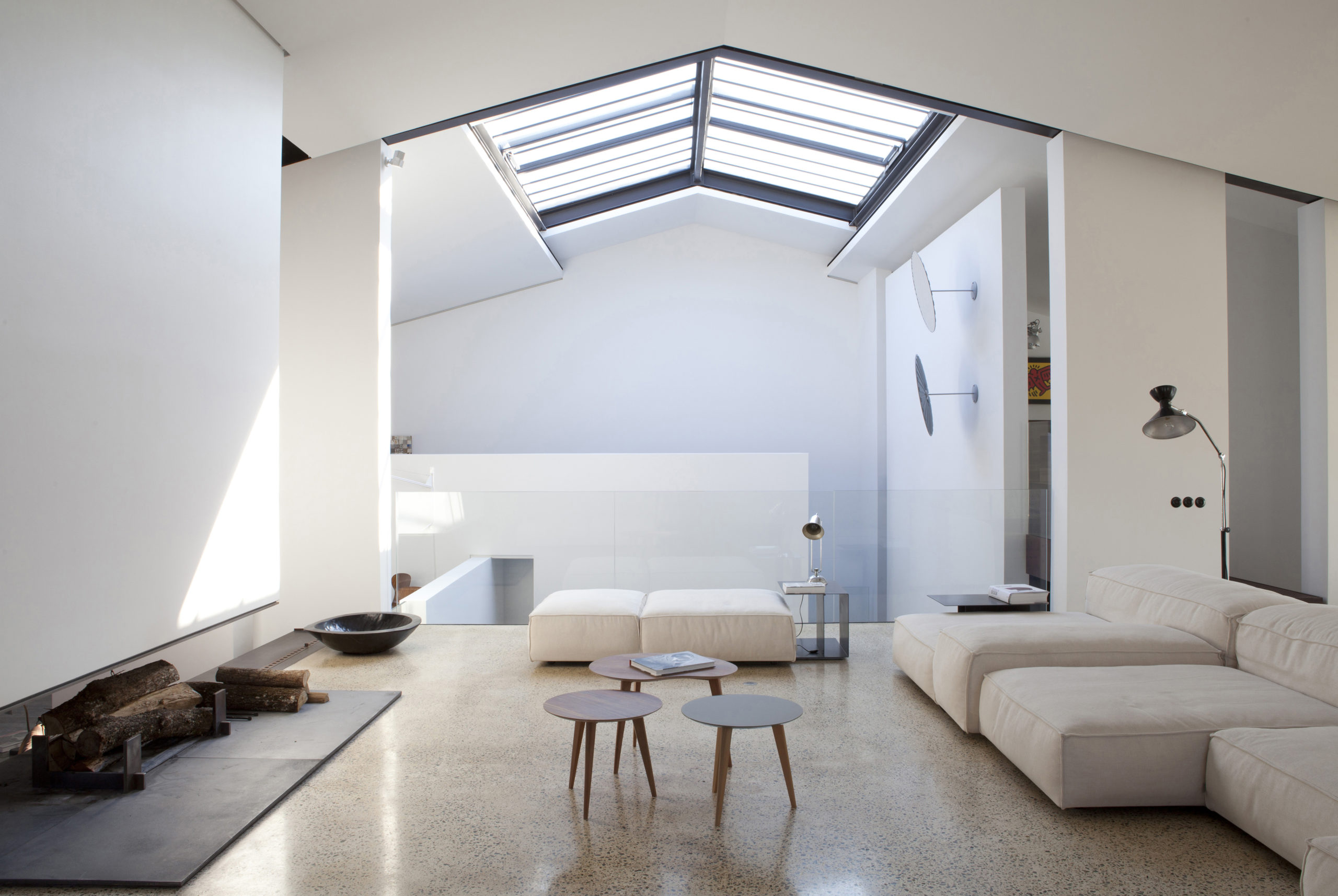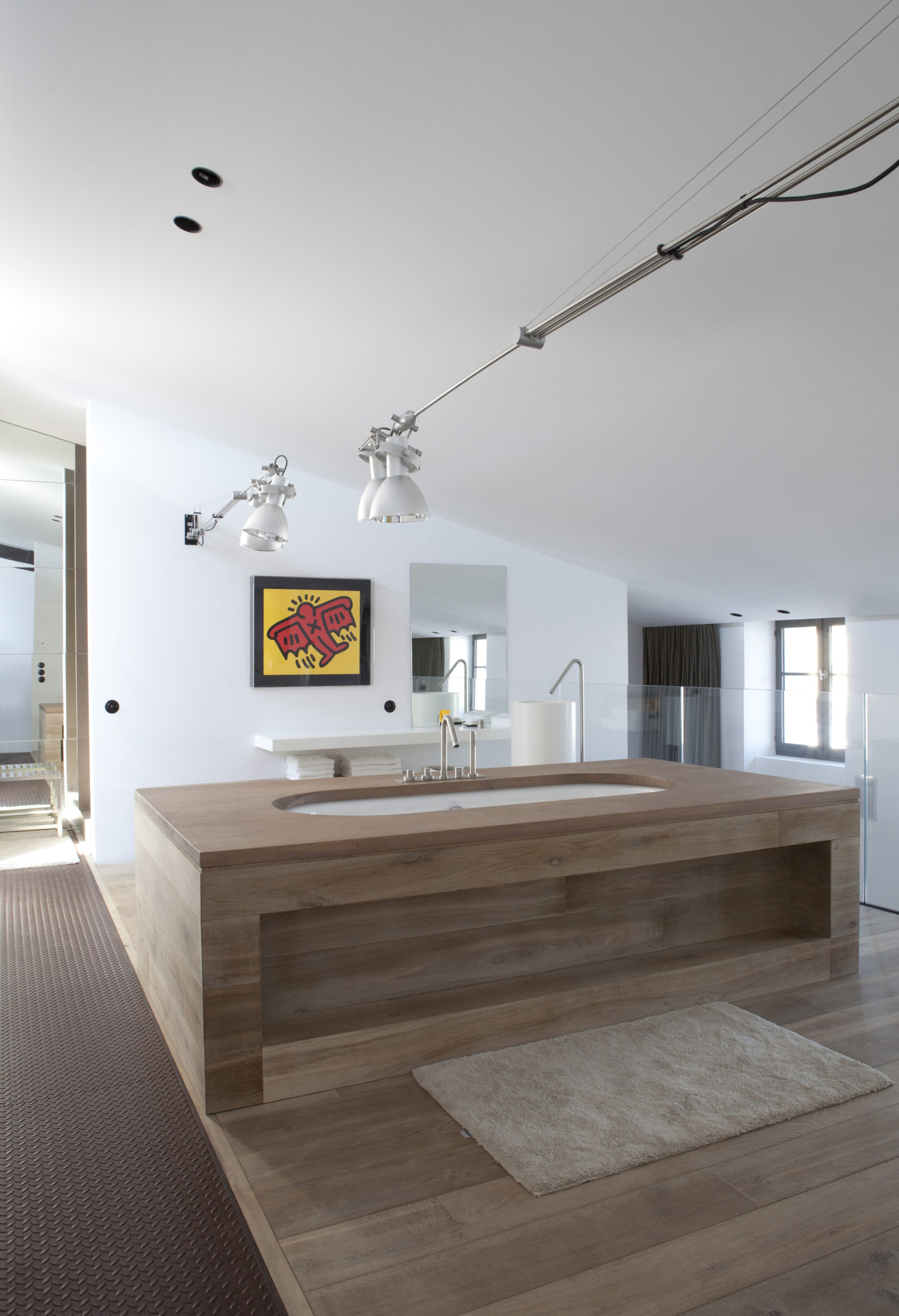 Les hautes portes industrielles s’ouvrent sur un immense hall. L’escalier relie le hangar, à l’étage supérieur, et le reste de la maison. Pour laisser entrer la lumière, les cloisonnements sont peu nombreux et une ouverture vitrée donne une vue panoramique sur le port depuis le séjour. Le salon et la cuisine sont placés sous une immense verrière à l’étage.
