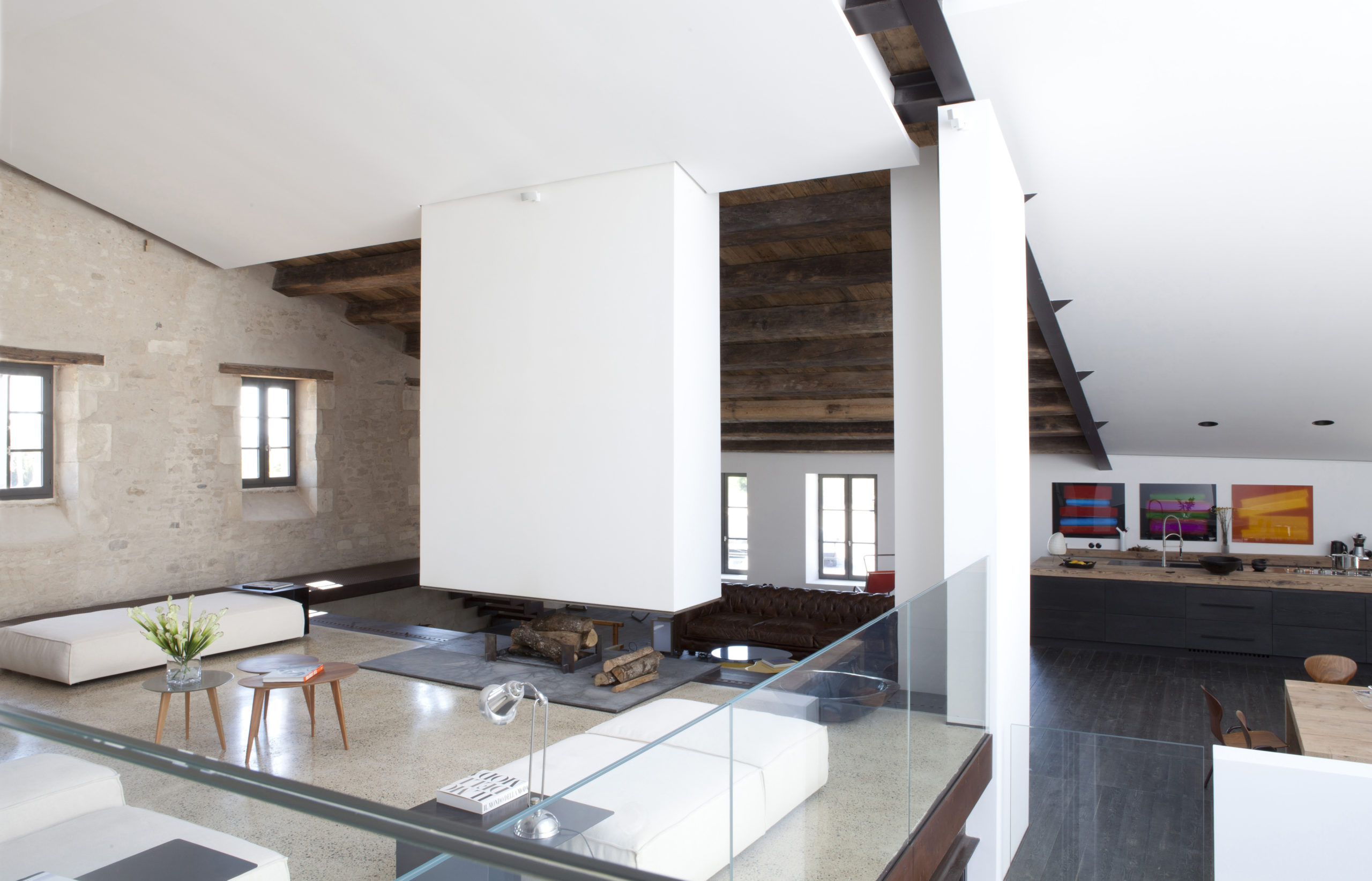 L’aménagement ne déséquilibre pas les espaces. L’intérieur a été repensé comme un loft, avec des camaïeux crème, de l’acier oxydé et les pierres de l’ancien bâtiment. Dans la salle principale, le parquet en chêne teinté réchauffe la pièce. Le mobilier choisi avec soin pour chaque pièce mélange les styles, les époques et les artistes.