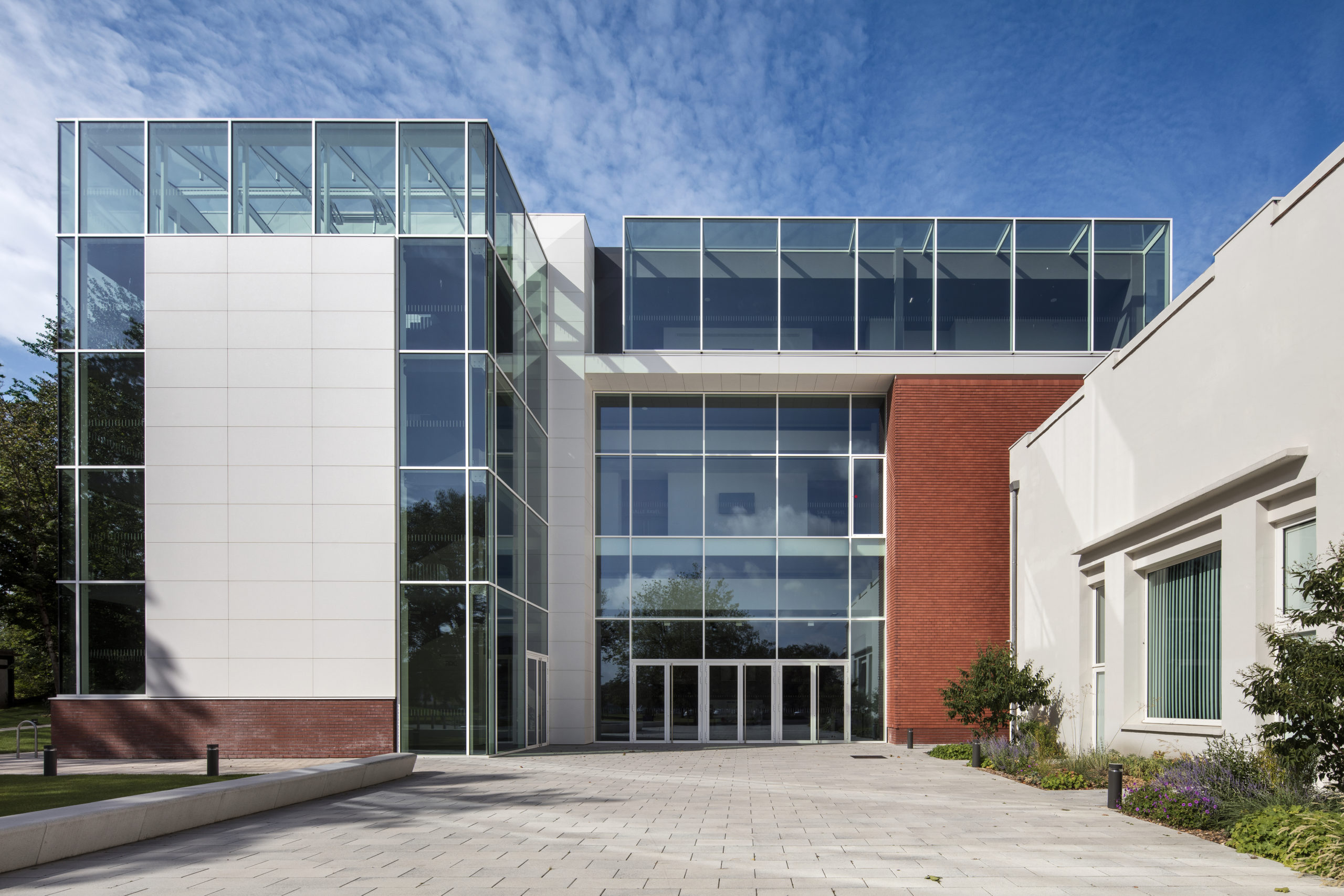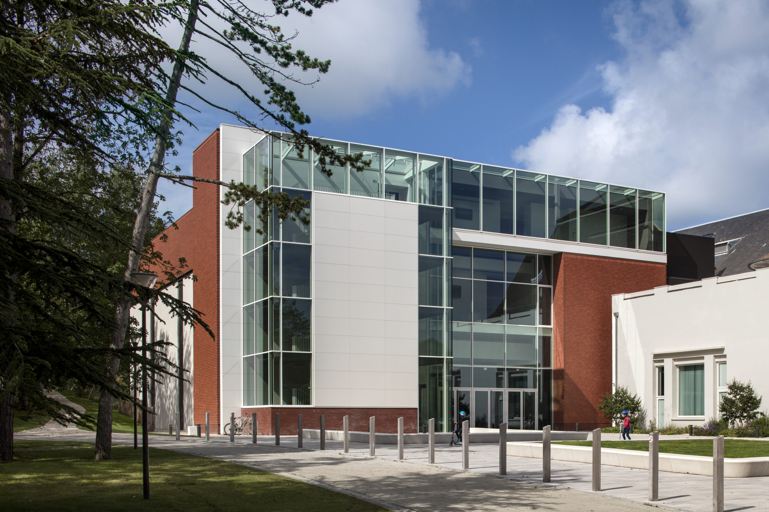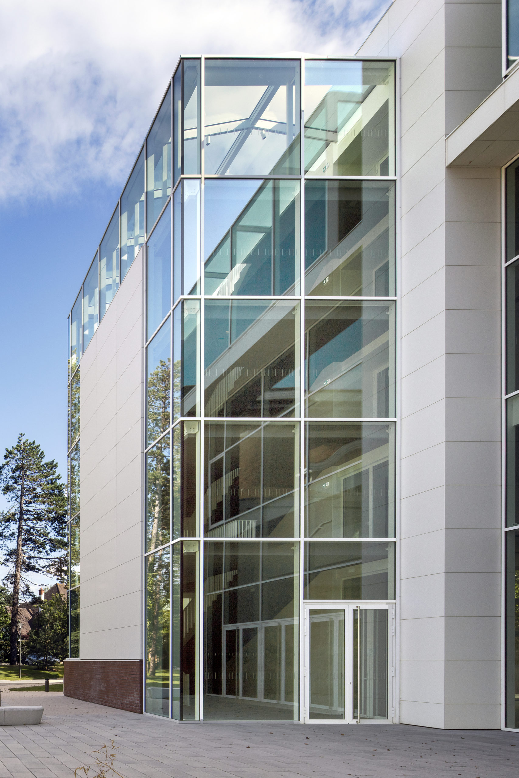 Le traitement architectural des nouvelles constructions marque la volonté de transparence et d’ouverture. Les quatre composantes principales des façades reprennent les matières et les couleurs déjà présentes dans le bâtiment existant : la terre cuite, l’enduit blanc, le béton blanc et le verre.