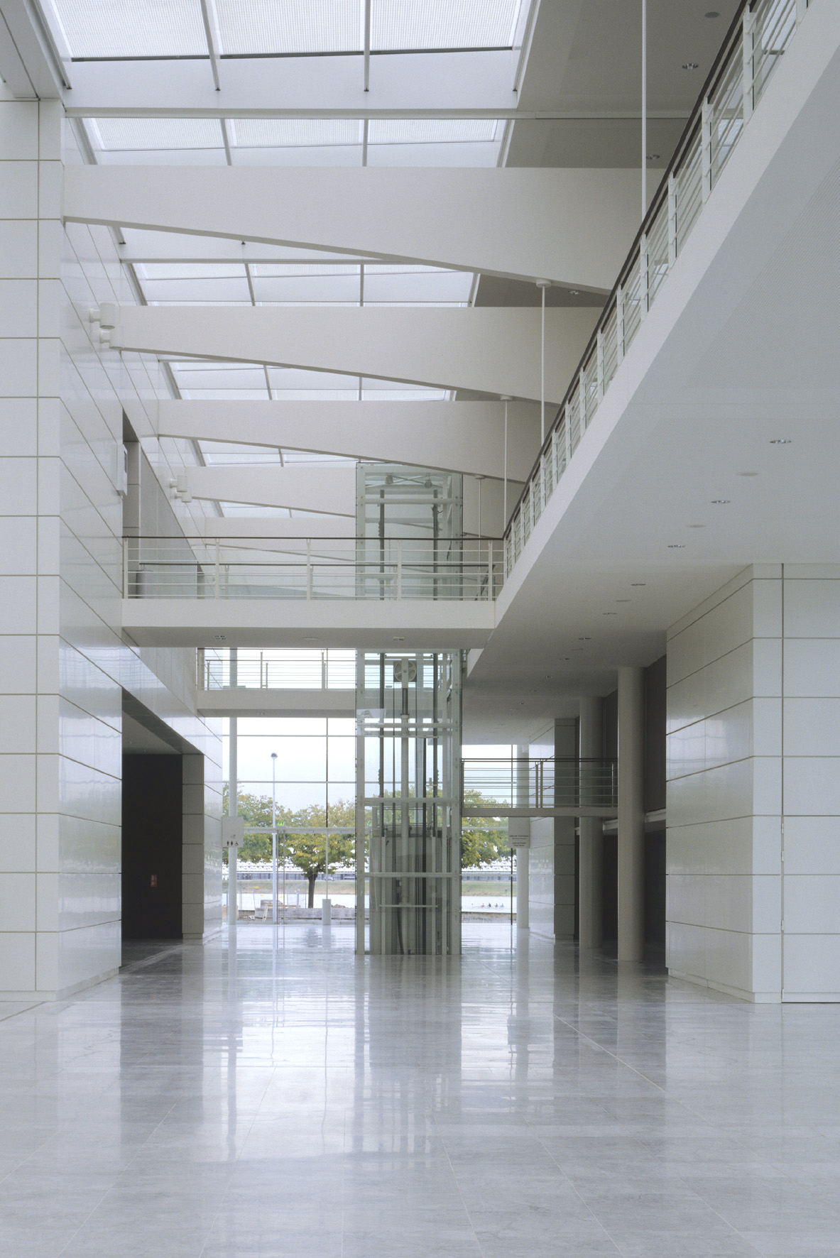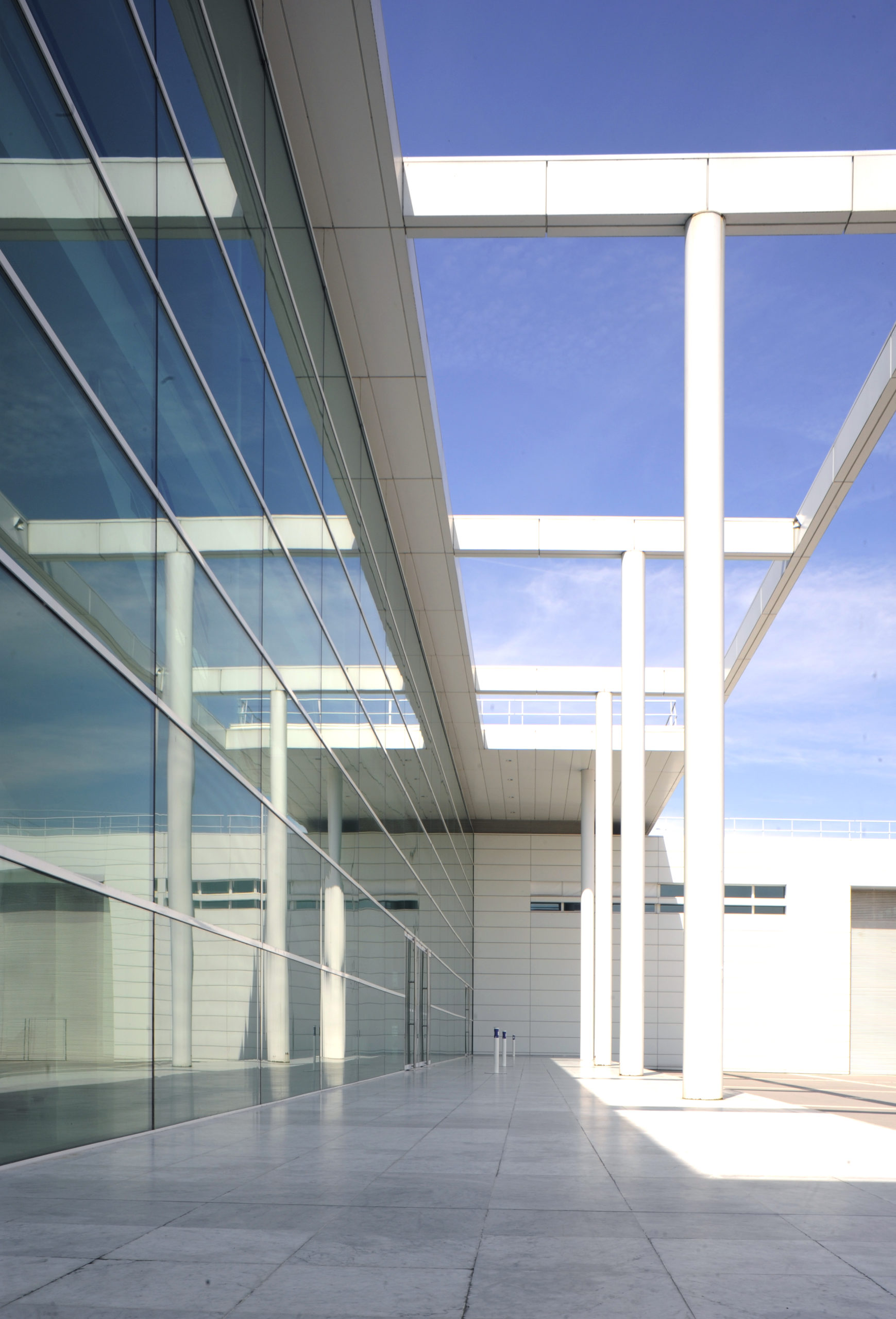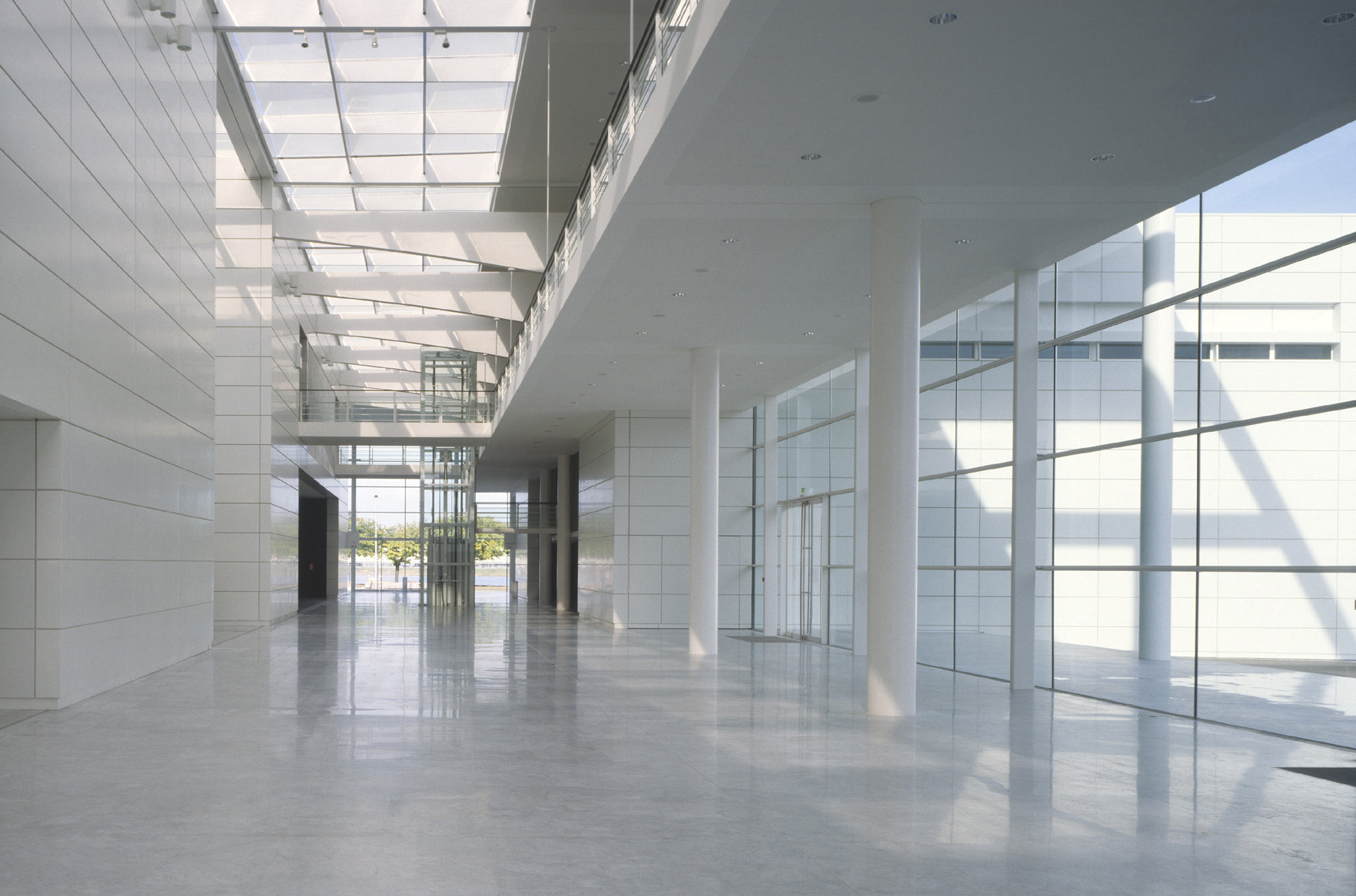 Une majestueuse surface vitrée invite le regard à l’évasion, la courbe de la structure s’offre à la lumière. Chaque espace est doté d’une ouverture pour faire entre la luminosité naturelle. Les espaces de circulation et le hall contribuent au caractère majestueux du lieu et facilitent la compréhension du bâtiment. Couvert par une verrière, la lumière inonde le hall de façon contrôlée. Les façades blanches du volume exposition et du volume congrès ainsi que le marbre au sol renforcent la clarté du lieu.