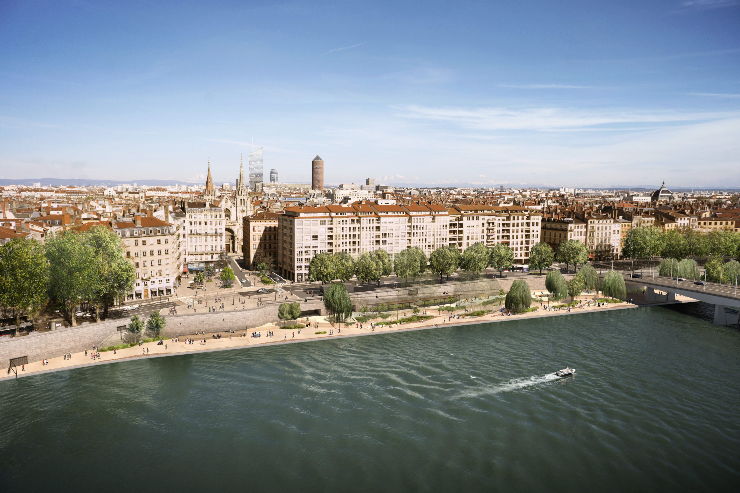 L’ensemble des éléments et matériaux du projet sont choisis en fonction de leur qualité et de leur pérennité. Les bordures des voiries et des zones piétonnes sont en granit sombre pour souligner le dessin de l’aménagement. Les passages piétons sont en pierre claire, afin de limiter l’utilisation de la peinture. Les chaussées seront en enrobé noir de type traditionnel. Le revêtement des espaces piétons est réalisé en dallage béton sur mesure et teinté clair pour minimiser le réchauffement des zones.
