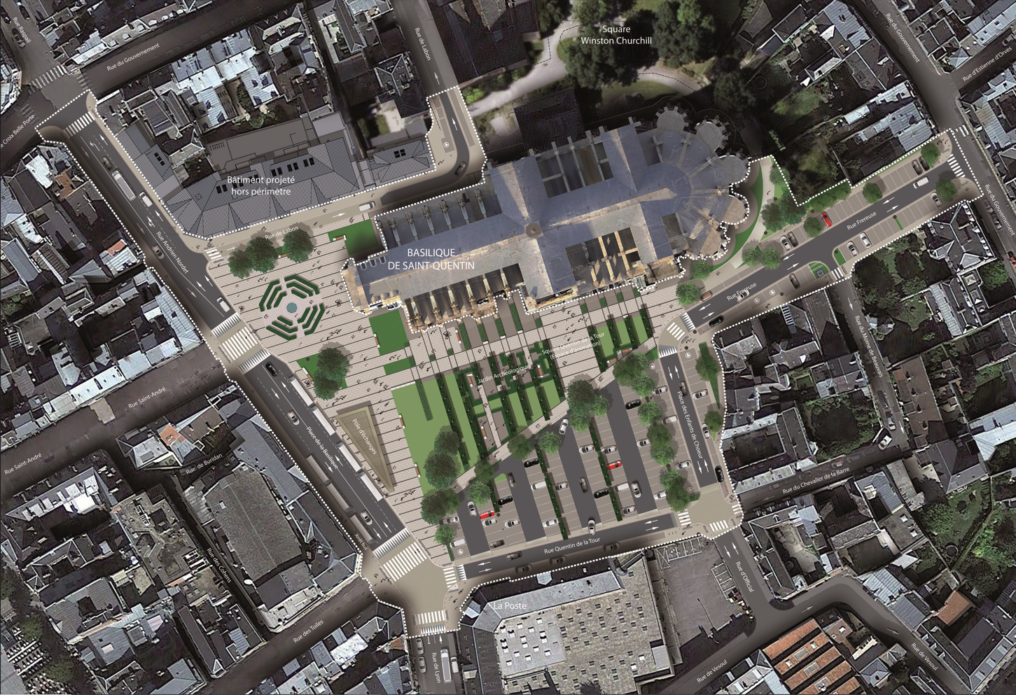Le projet pour le réaménagement du parvis de la Basilique de Saint-Quentin est fondé sur l’histoire du lieu, les traces de l’ancien, les vestiges archéologiques, et la connexion avec le paysage urbain. Il s'adapte au fonctionnement d'un large pôle commercial en offrant un accès aux voitures tout en laissant une place importante aux piétons pour une rencontre urbaine apaisée.