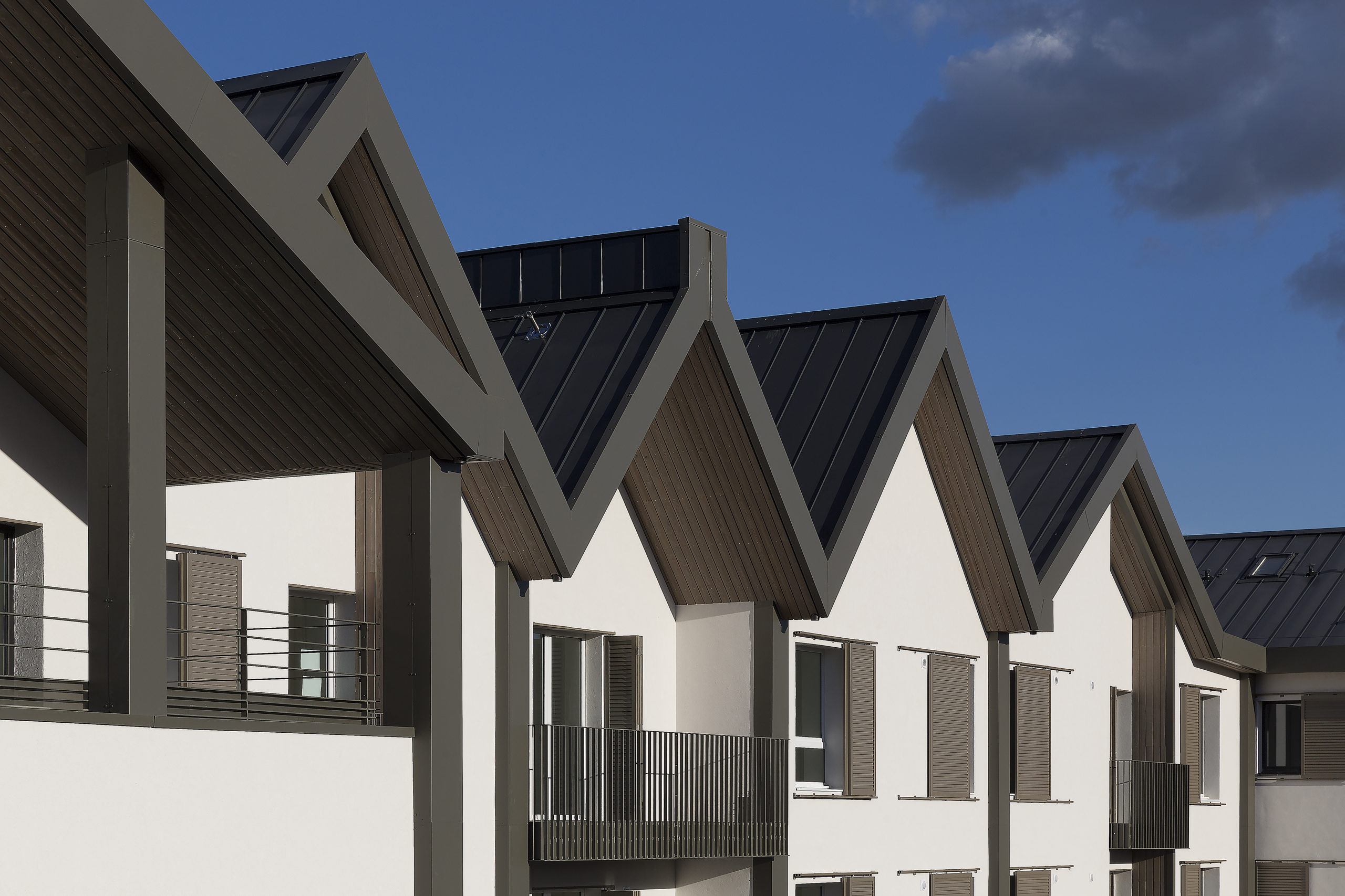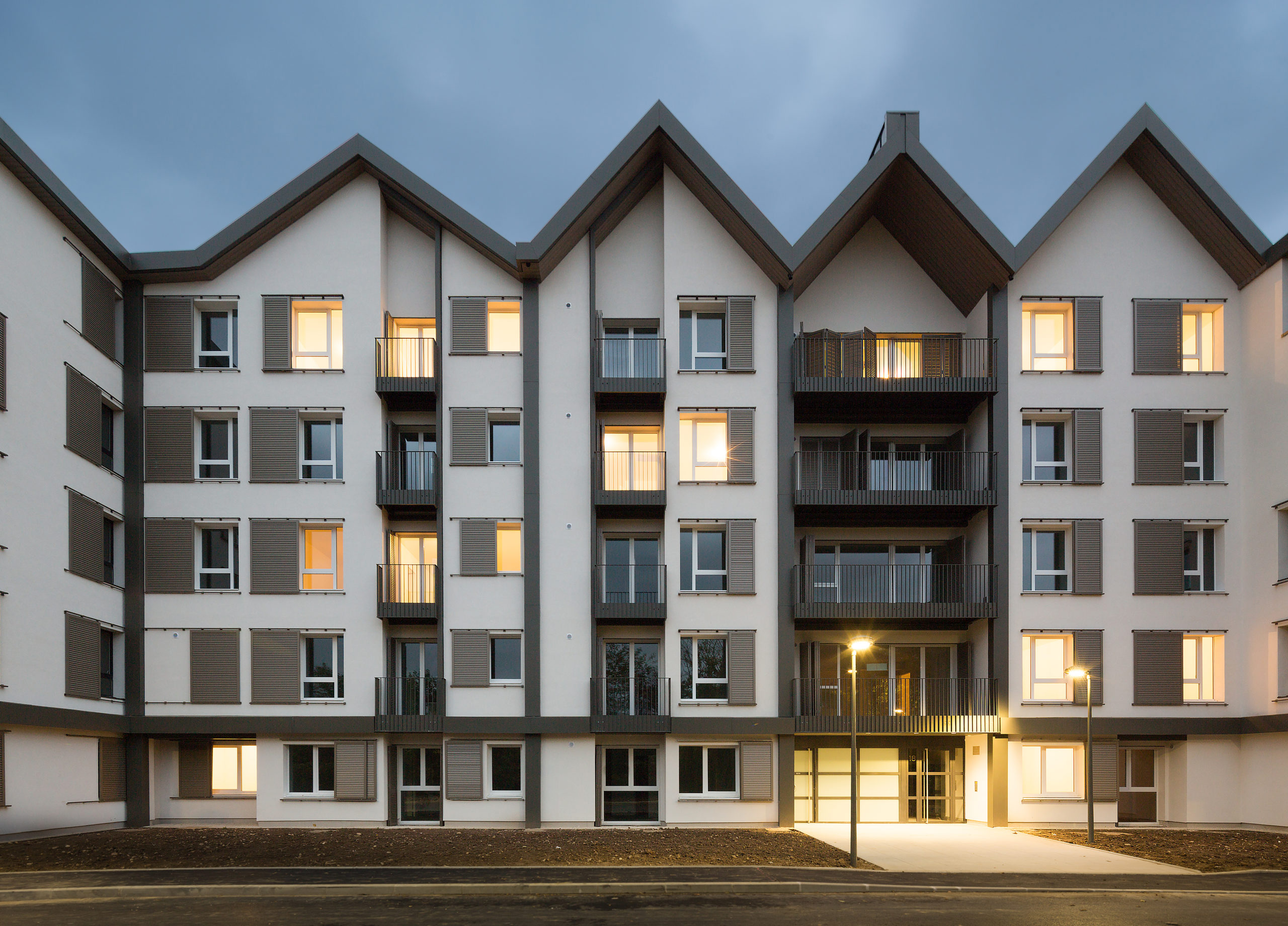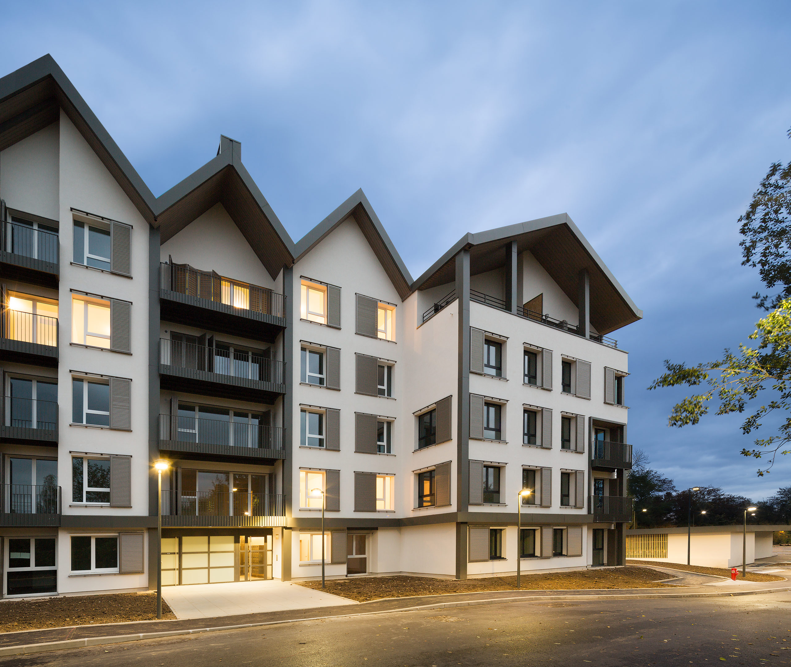 L’écriture architecturale du projet reprend la typologie de grandes maisons citoyennes. Cinq corps principaux de bâtiments sont d’architecture contemporaine, tout en restant en adéquation avec les typologies architecturales locales. L’ossature est en bois massif CLT (lamellé contre-croisé), constituée de 681 pièces assemblées sur place. Le bardage en enduit beige clair est parfois agrémenté d’éléments de façade en finition bois naturel. Une haie végétale localisée sur toute la périphérie des façades contribue à préserver l’intimité des appartements en rez-de-jardin.