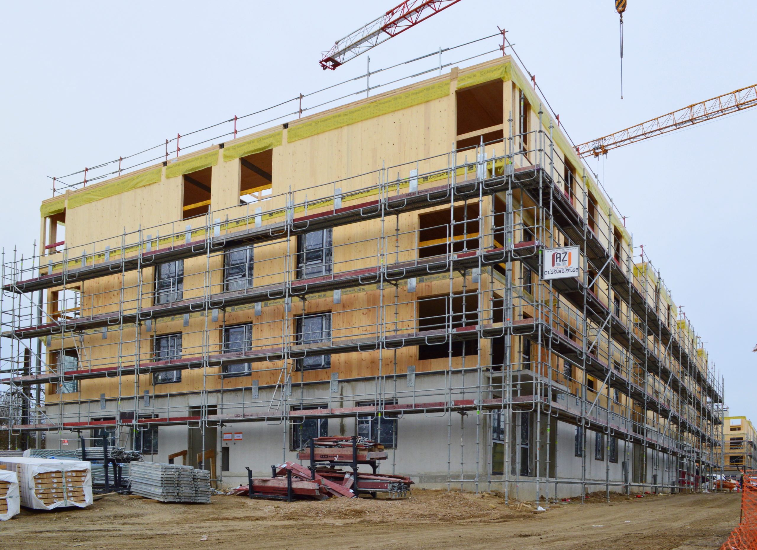 Construction de grandes maisons mitoyennes en bois CLT, écologiques et économiques, comportant 140 logements sociaux en bord de Seine et intégré au site des Docks de Ris.