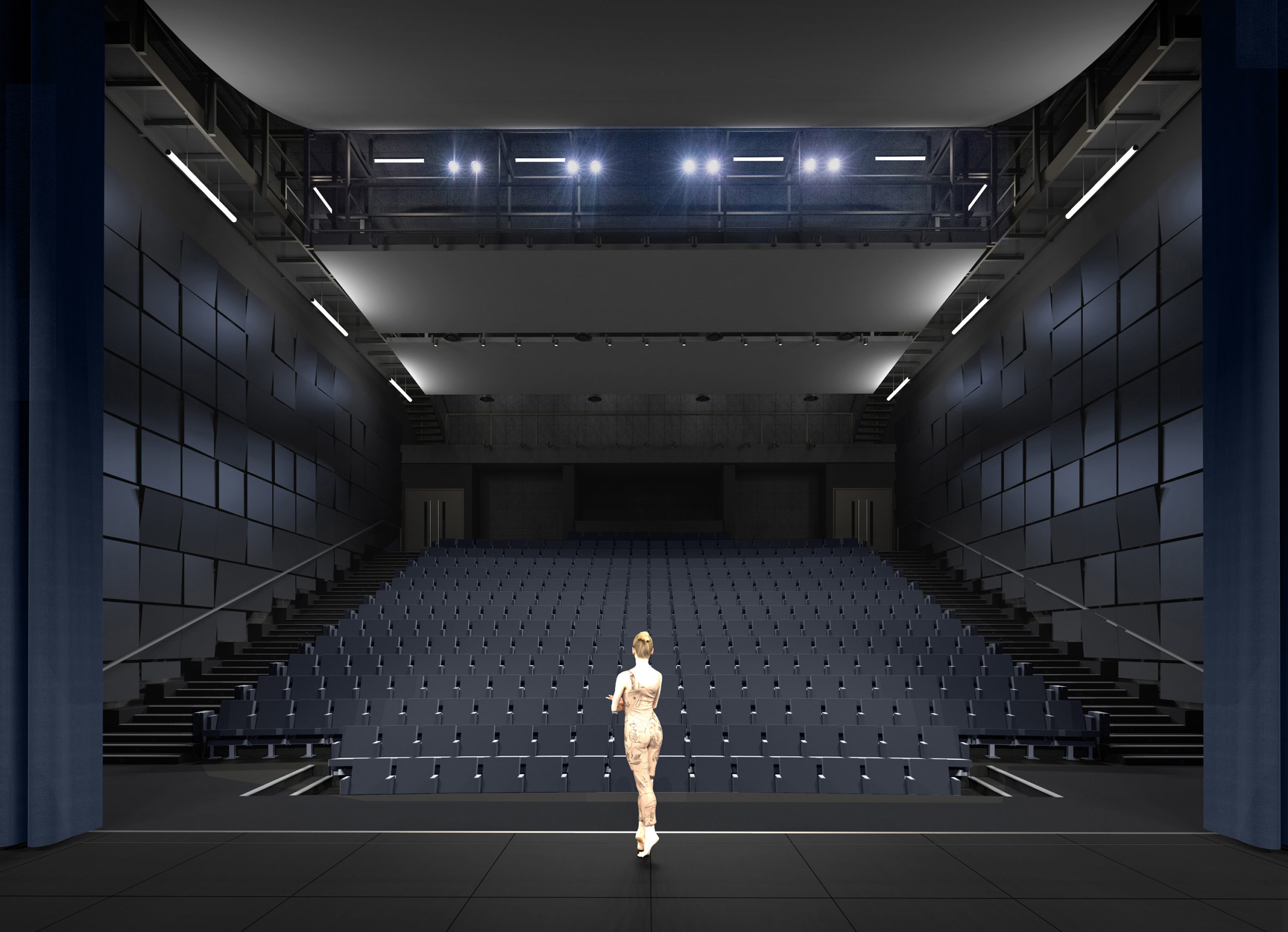 Pour conserver cette transparence, les salles de répétition sont prévues au premier étage et les bureaux au deuxième étage. La cage de scène, volume opaque de 18m de haut orienté vers la salle Jacques-Brel, est au cœur du projet. Le reste du programme lié au fonctionnement du théâtre est décomposé en volumes de dimensions plus réduites et s’organise naturellement autour de la cage de scène.