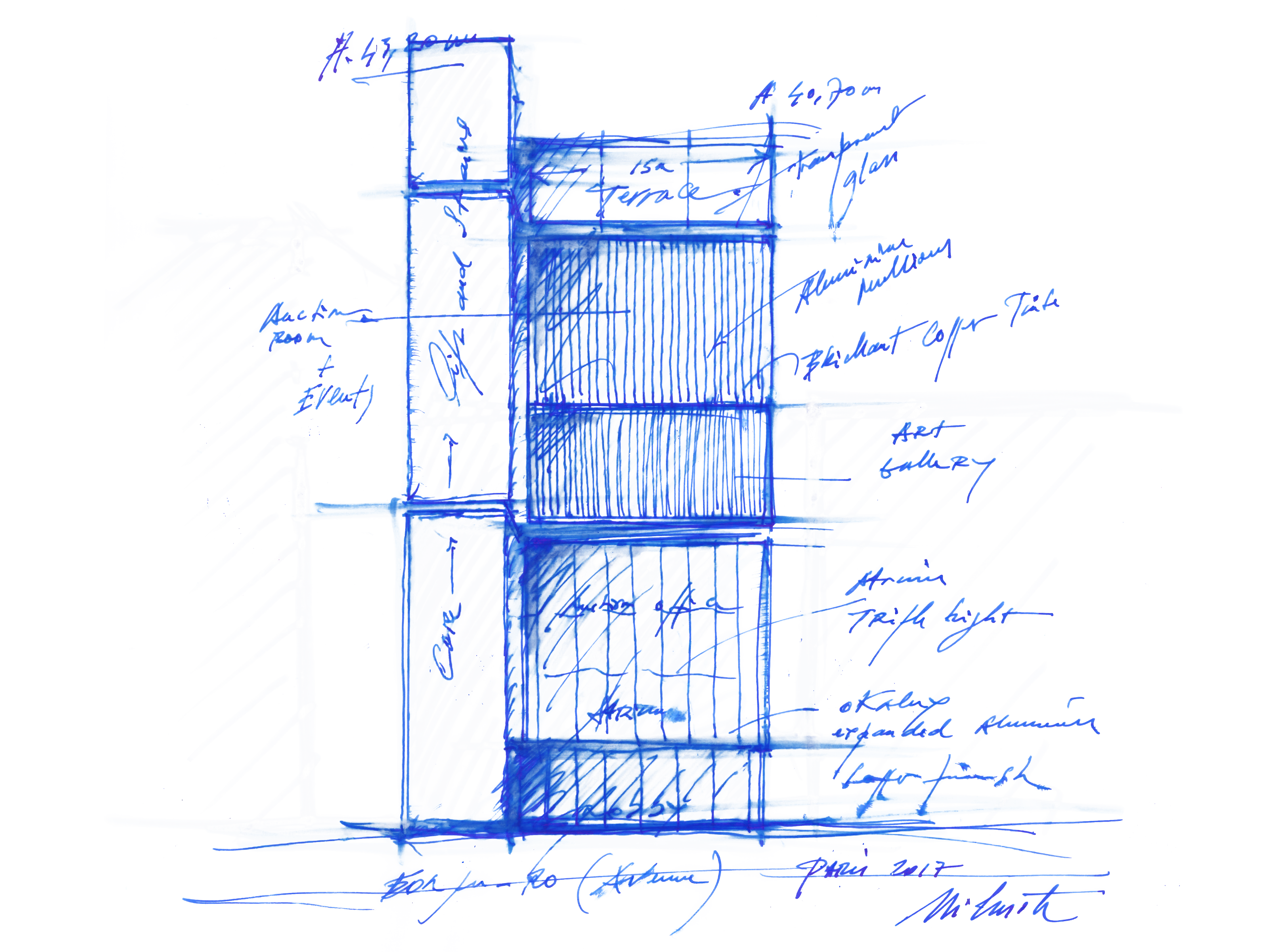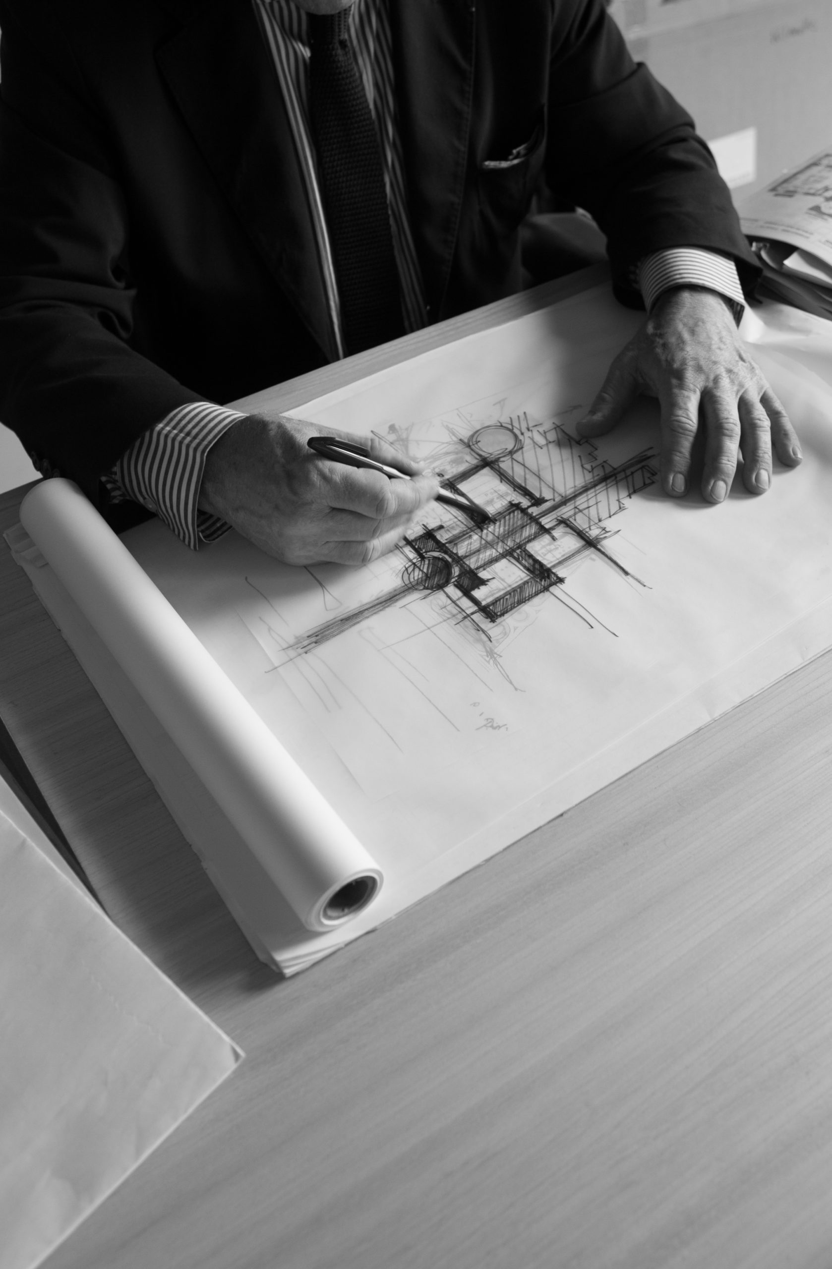 Au sens propre comme au sens figuré, le travail se fait dans la transparence puisque c’est sur du papier calque que chaque projet prend forme et évolue. De la vision première, spontanée, de Jean Michel Wilmotte jaillit le croquis. En quelques coups de crayon, il matérialise son inspiration, ses émotions, sa passion. A main levée, il inaugure le processus de recherche, dynamique créative, où une esquisse en appelle une autre, rationnalisant et intégrant peu à peu les contraintes liées au projet, pour au final renforcer ou adapter le concept. Le croquis est pour l’architecte un outil de transmission et pour le maître d’ouvrage un outil de compréhension.